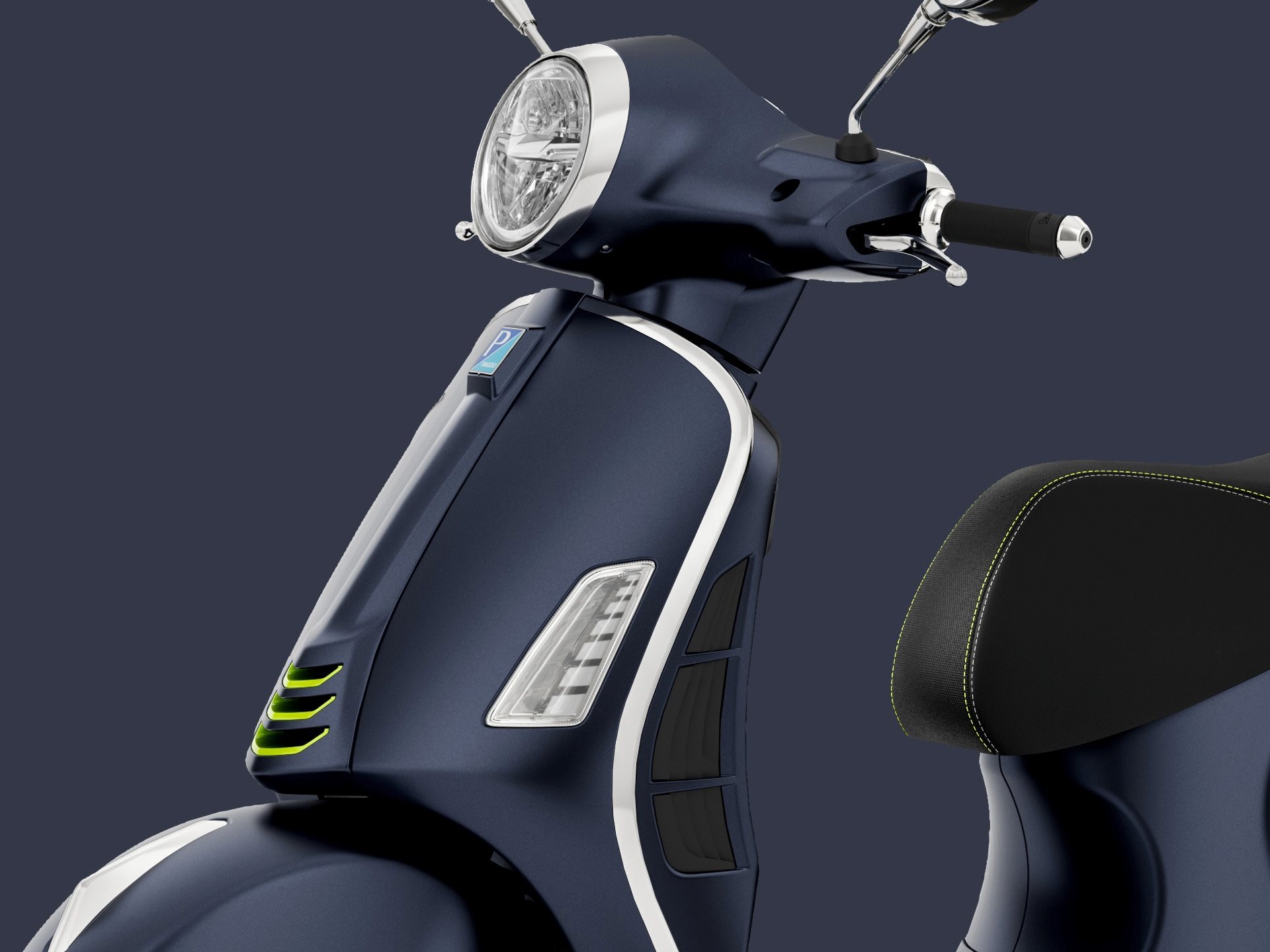 Ein einzigartiges und attraktives Design, das an die Exklusivität und technologische Innovation einer authentischen italienischen Ikone erinnert. Die Vespa GTS SuperTech zeichnet sich durch ihre glänzenden und matten Farben, die Farbverläufe und die fluoreszierenden Details aus, die ihren Hightech-Spirit und raffinierten Charakter widerspiegeln. Die sorgfältigen Verarbeitungen am schwarzen Sattel und an den Schutzblechkanten betonen ihre Eleganz und ihren Charakter noch weiter.