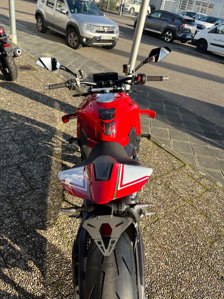Sonderlackierung Heck, Tankabdeckung, Lampenmaske, Kotflügel vorn. Kennzeichen Halter inkl. Ducati Performance LED Laufblinker. Racing Sitzbank. Carbon Kotflügel vorn