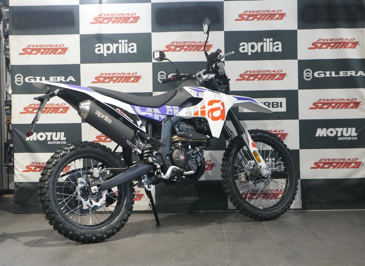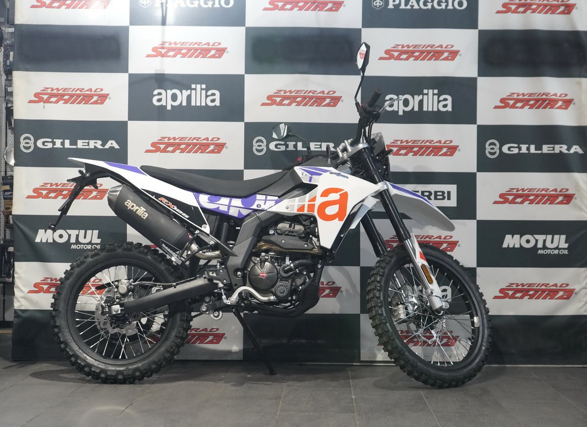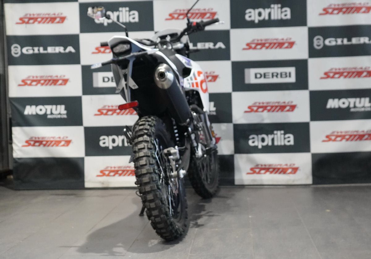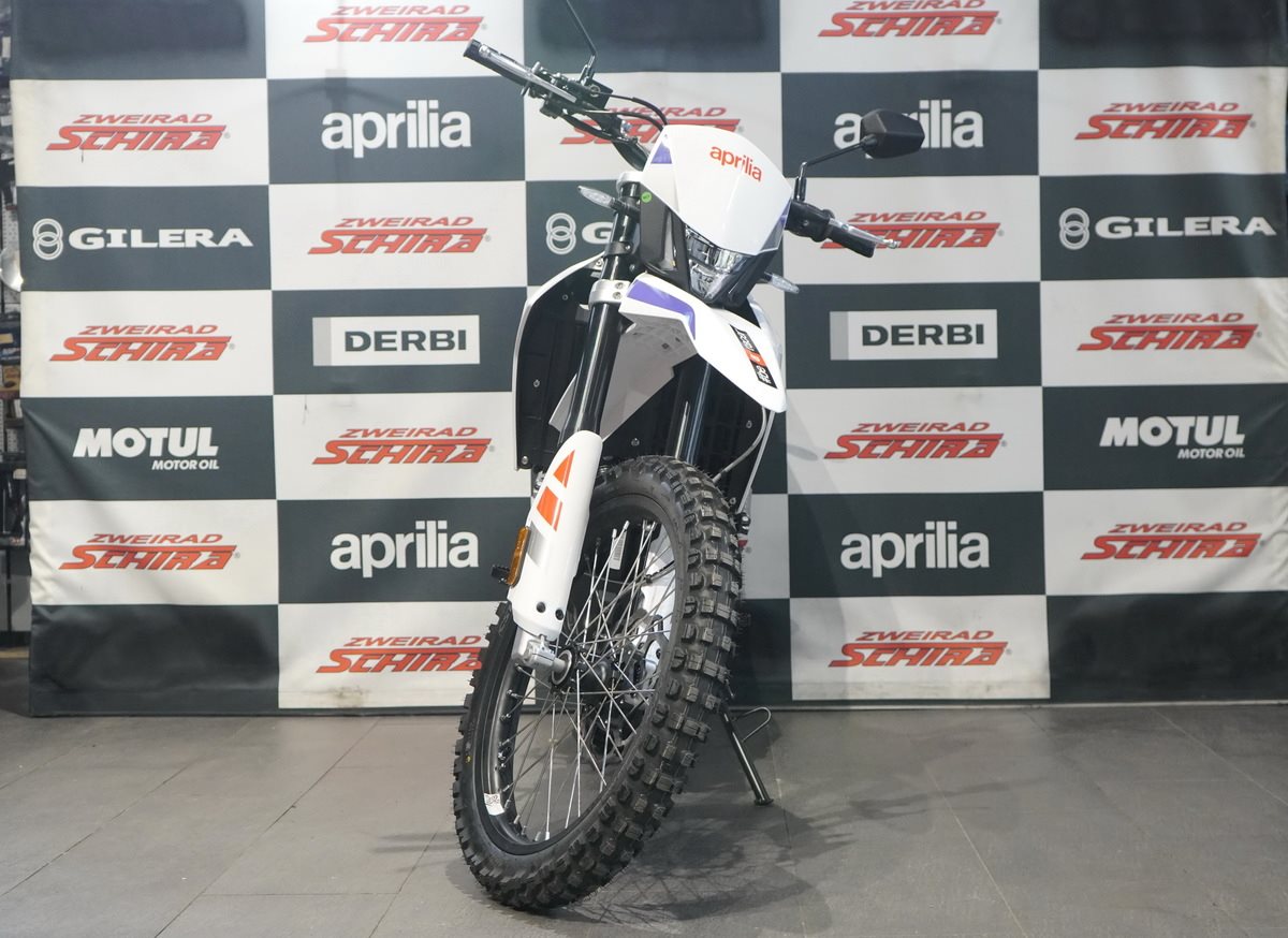 Das Design der Aprilia RX 125 ist schnittig und minimalistisch, mit scharfen Linien, die sich von vorne bis hinten erstrecken und ihre Rennsport-DNA betonen. Der mattschwarze Auspuff fügt sich nahtlos in den glänzend schwarzen Rahmen, den Lenker, den Motor und die Schwinge ein. Die eloxierten, glänzend schwarzen Räder, die für echte Offroad-Leistung ausgelegt sind (21 vorne, 18 hinten), sorgen in Kombination mit den Stollenreifen für optimale Kontrolle und Traktion auf jedem Gelände.