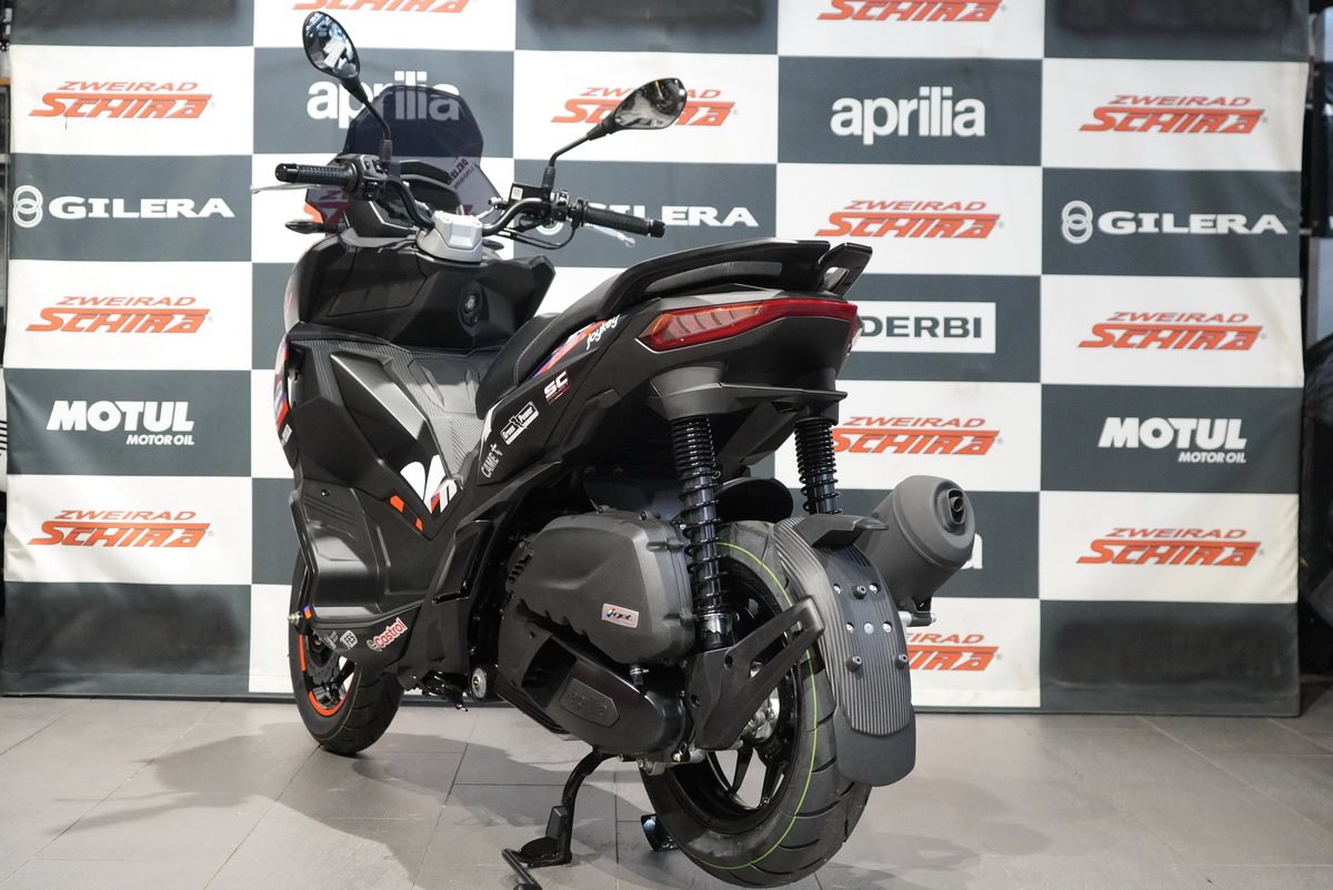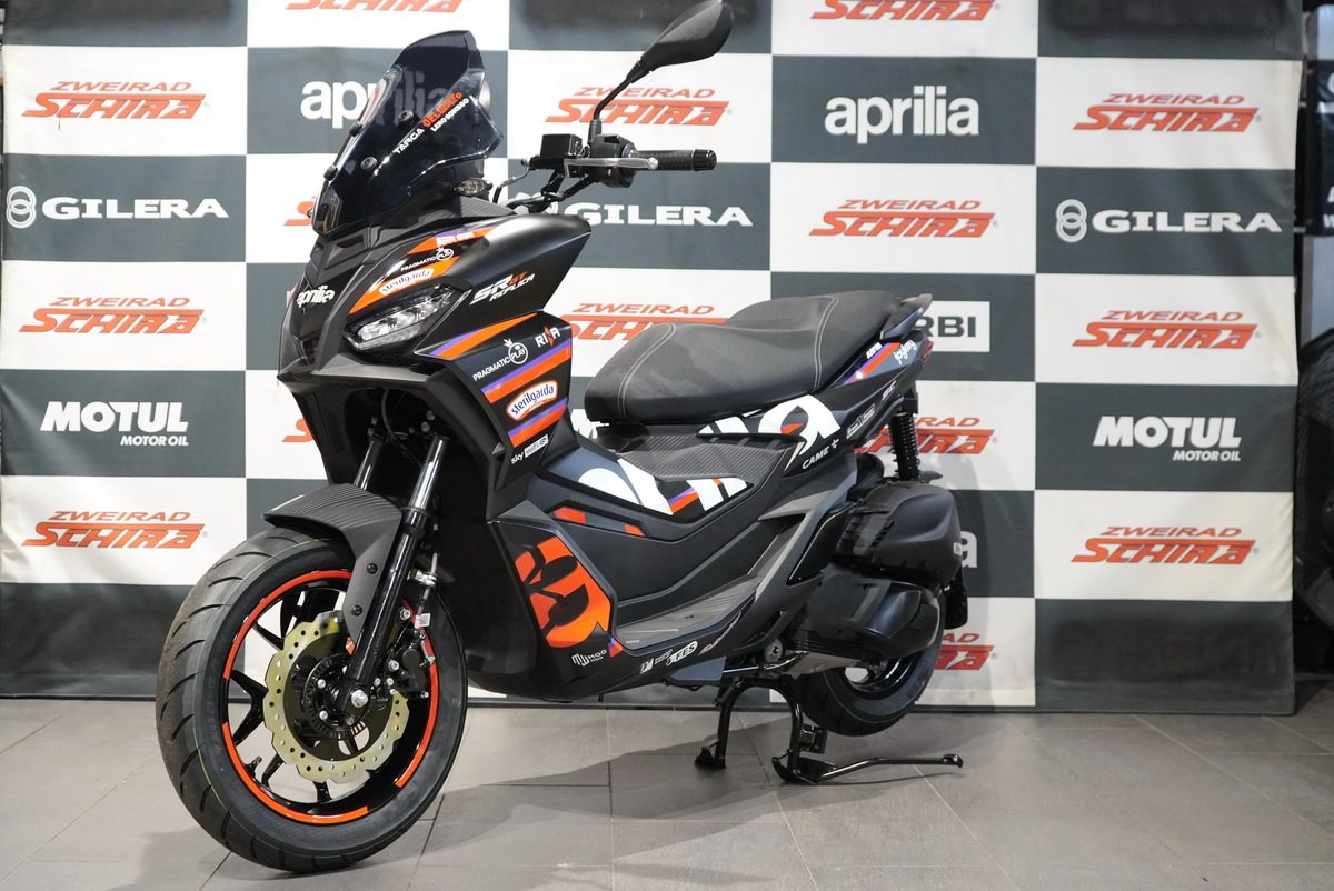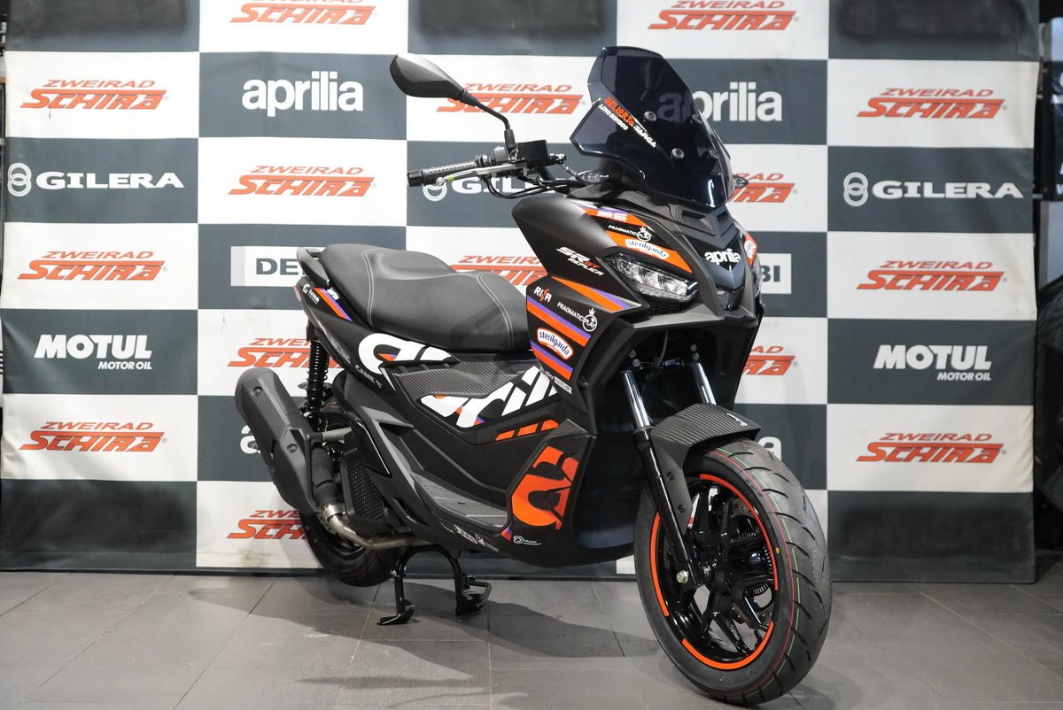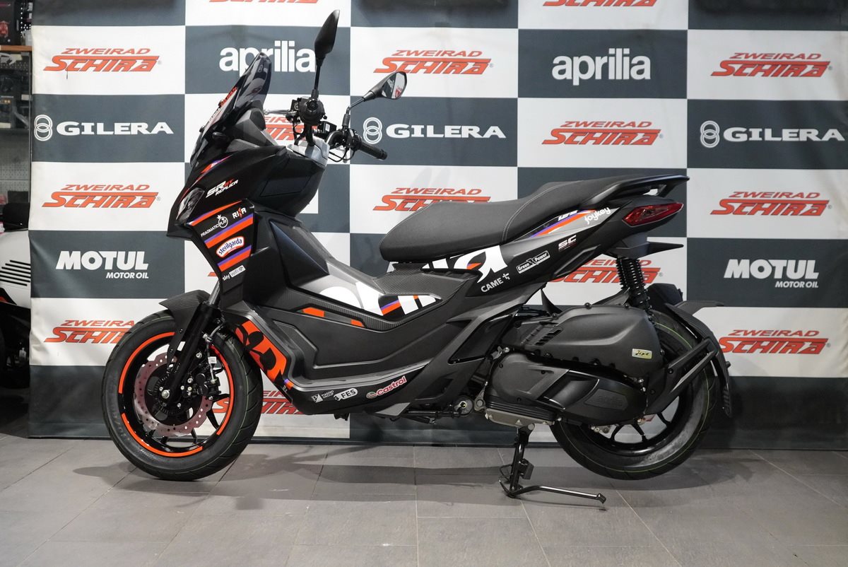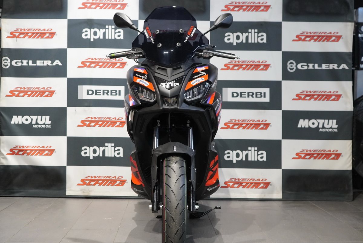 Die Sonderedition Replica zeigt stolz ihre vom Rennsport inspirierten Referenzen. Mit seiner auffälligen Optik, die sich durch eine mattschwarze Verkleidung mit roten und violetten Grafikelementen auszeichnet, macht der SR GT keinen Hehl daraus, dass er von der RS-GP25 inspiriert ist. Der Soziusgriff und der Spoiler sind ebenfalls in Mattschwarz gehalten, während das ikonische Aprilia Logo an der Seite prangt.