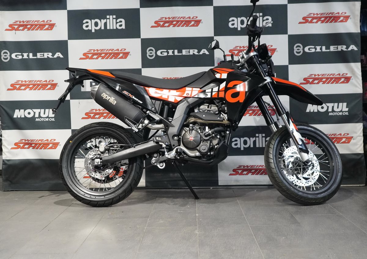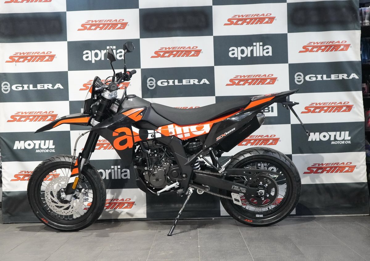 Die SX 125 ist leicht und präzise in der Handhabung und wird von einem modernen Einzylinder-Motor mit vier Ventilen und Euro 5+ Norm angetrieben, der über alle Drehzahlbereiche hinweg ein hervorragendes Drehmoment und eine hervorragende Leistung bietet. Präzision und Sicherheit in Kurven werden durch eine Dämpfung mit langem Federweg und ein Bosch-ABS mit Anti-Überschlag-Funktion gewährleistet, das beim Bremsen auf das Vorderrad einwirkt, um das Anheben des Hinterrads zu regulieren. Das Bremssystem verfügt über zwei schwimmend gelagerte Bremssättel: Der vordere mit zwei Kolben greift auf eine 300 mm Scheibe zu, während der hintere auf eine 218 mm Scheibe wirkt.