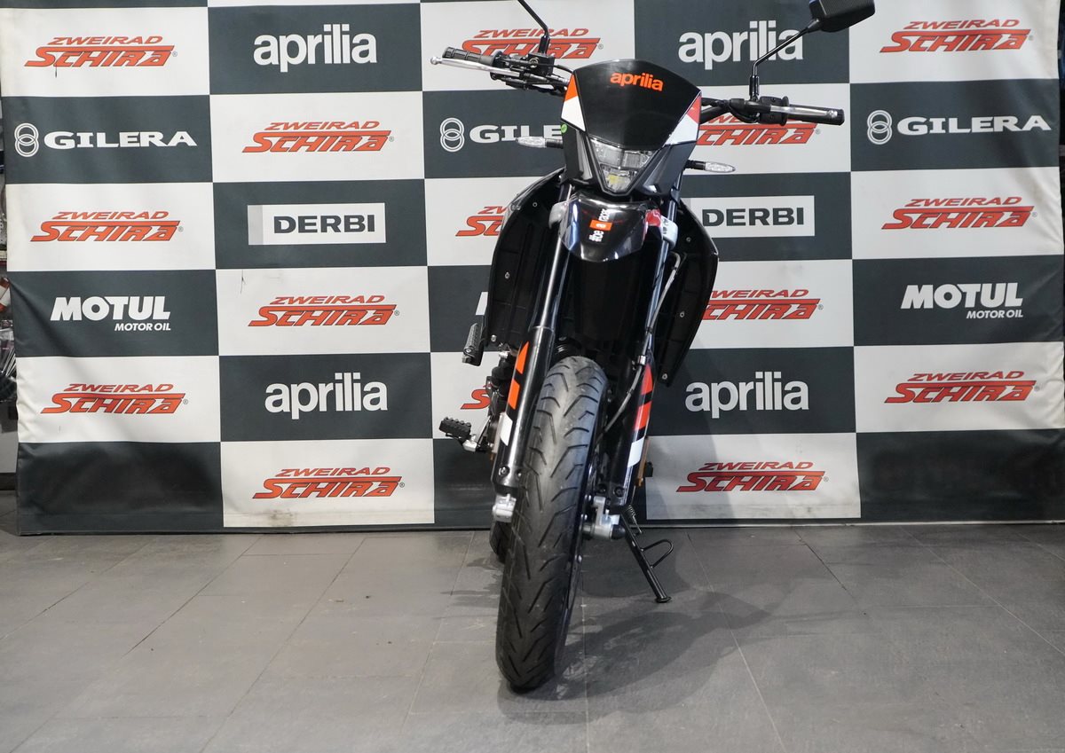 Die Aprilia SX 125 bleibt nie unbemerkt. Ihre Karosserie ist von den neuesten Trends im Bereich der Motard-Motorräder inspiriert und verleiht ihr ein dynamisches und modernes Aussehen. Eine auffällige, glänzende schwarze Lackierung umgibt Lenker, Motor, Schwinge und den gesamten Rahmen und steht im Kontrast zur mattschwarzen Auspuffabdeckung. Die 17 Zoll Speichenräder sind mit sportlichen Straßenreifen ausgestattet.