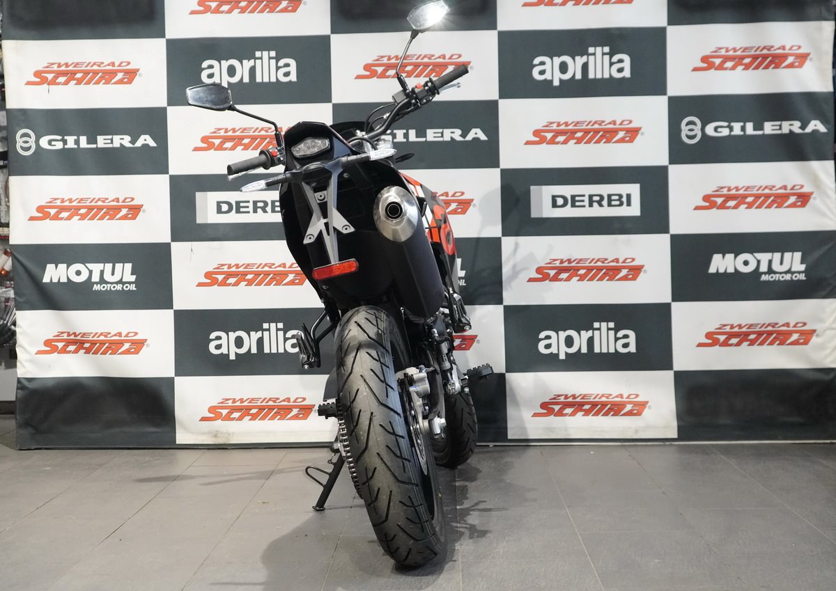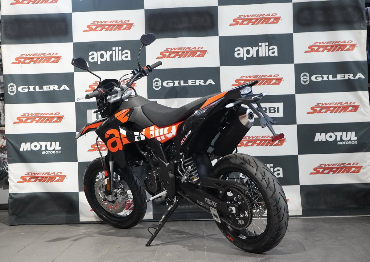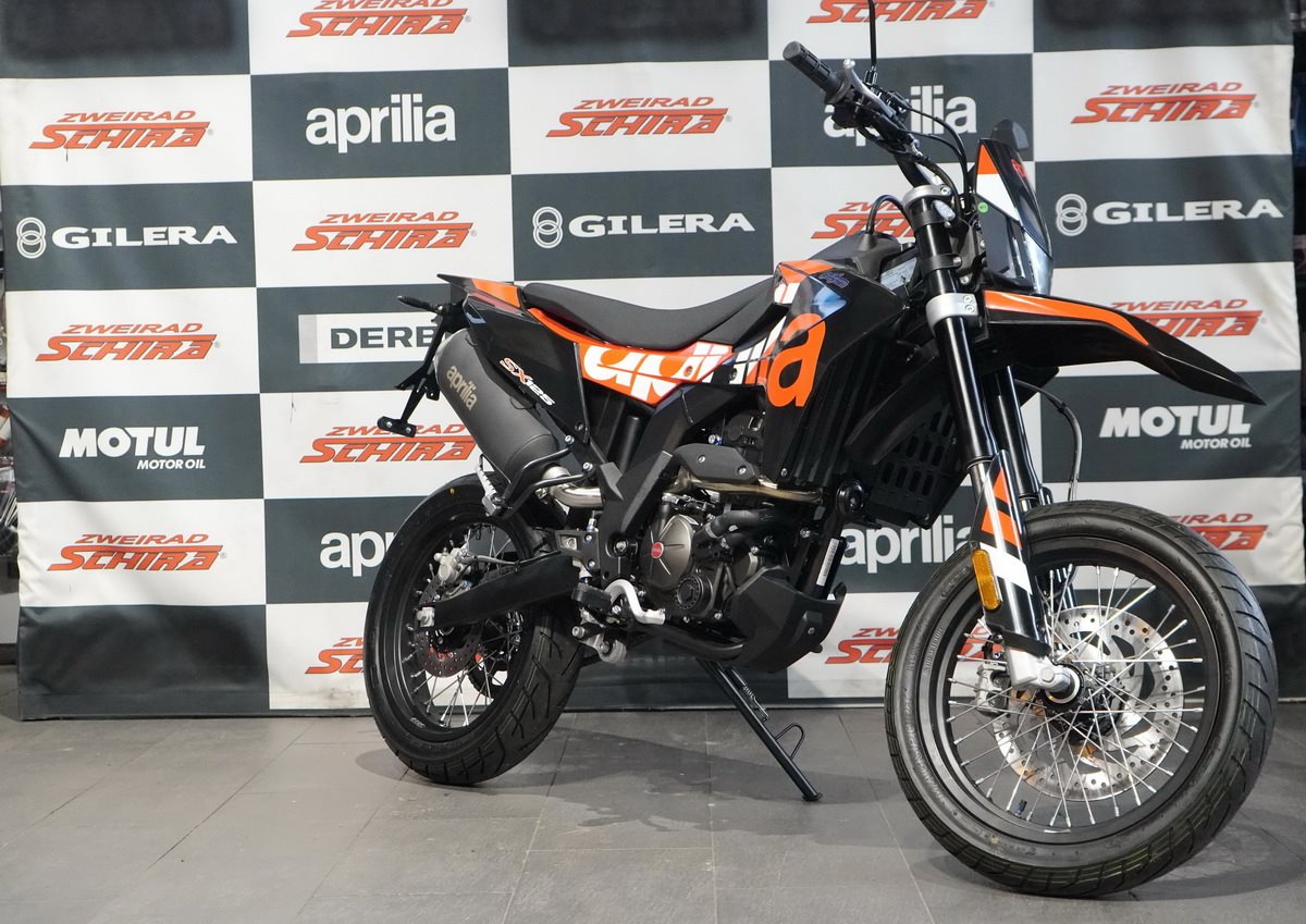 Die SX 125 ist leicht und präzise in der Handhabung und wird von einem modernen Einzylinder-Motor mit vier Ventilen und Euro 5+ Norm angetrieben, der über alle Drehzahlbereiche hinweg ein hervorragendes Drehmoment und eine hervorragende Leistung bietet. Präzision und Sicherheit in Kurven werden durch eine Dämpfung mit langem Federweg und ein Bosch-ABS mit Anti-Überschlag-Funktion gewährleistet, das beim Bremsen auf das Vorderrad einwirkt, um das Anheben des Hinterrads zu regulieren. Das Bremssystem verfügt über zwei schwimmend gelagerte Bremssättel: Der vordere mit zwei Kolben greift auf eine 300 mm Scheibe zu, während der hintere auf eine 218 mm Scheibe wirkt.
