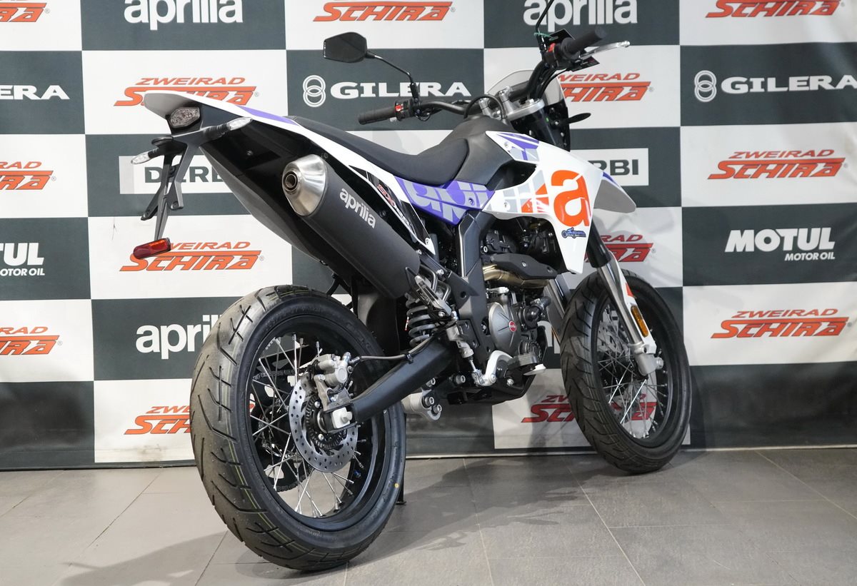Die SX 125 ist leicht und präzise in der Handhabung und wird von einem modernen Einzylinder-Motor mit vier Ventilen und Euro 5+ Norm angetrieben, der über alle Drehzahlbereiche hinweg ein hervorragendes Drehmoment und eine hervorragende Leistung bietet. Präzision und Sicherheit in Kurven werden durch eine Dämpfung mit langem Federweg und ein Bosch-ABS mit Anti-Überschlag-Funktion gewährleistet, das beim Bremsen auf das Vorderrad einwirkt, um das Anheben des Hinterrads zu regulieren. Das Bremssystem verfügt über zwei schwimmend gelagerte Bremssättel: Der vordere mit zwei Kolben greift auf eine 300 mm Scheibe zu, während der hintere auf eine 218 mm Scheibe wirkt.