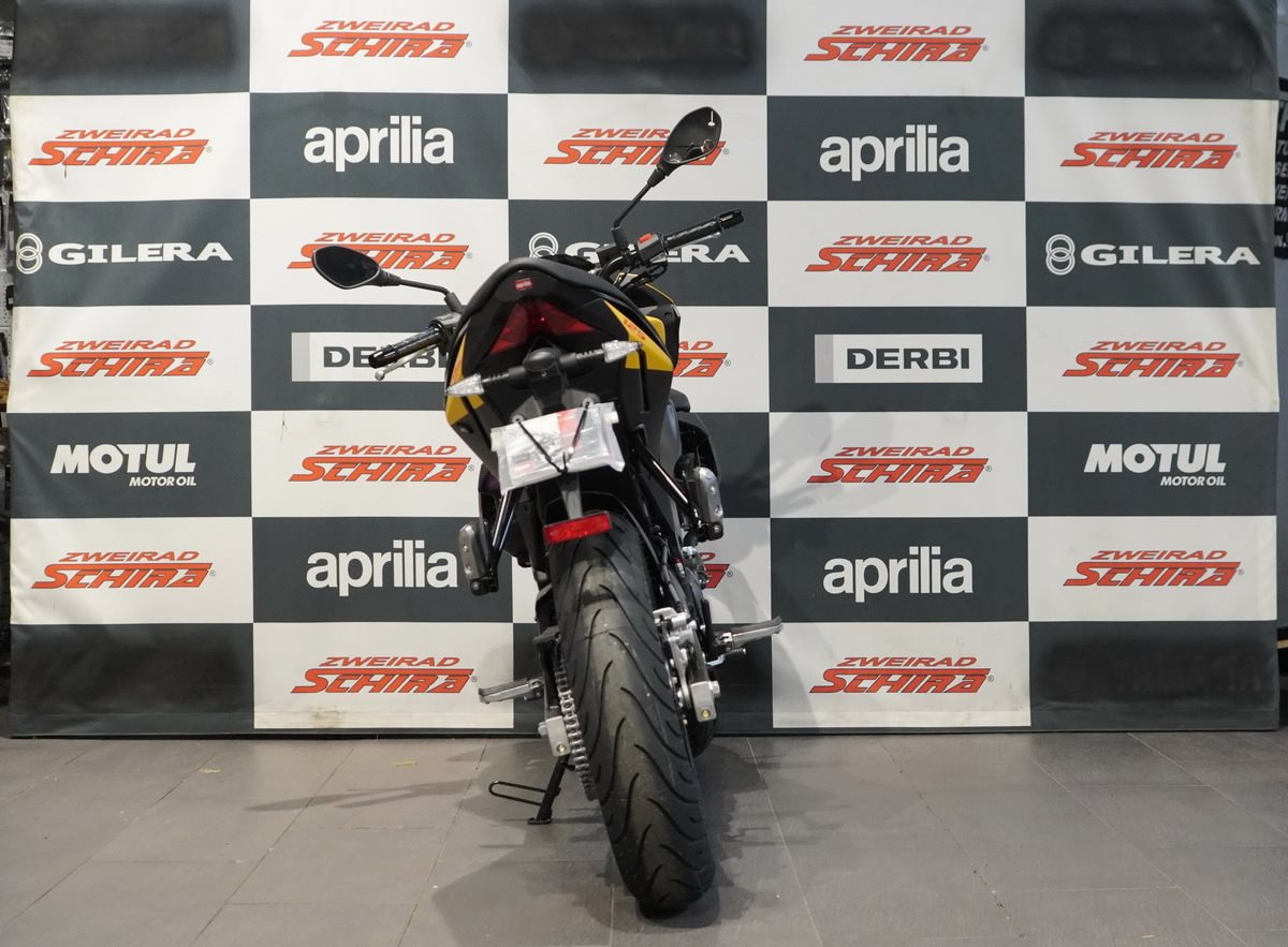 Die Aprilia Tuono 125 sorgt für sofortigen Vortrieb - dank des flüssigkeitsgekühlten Euro-5+-Einzylindermotors mit Vierventiltechnik, der 11 kW bei 10.500 U/min und 11,4 Nm bei 8.500 U/min liefert. Die Motorleistung trifft auf ein präzises Bremssystem mit Zweikanal-ABS - entwickelt in Zusammenarbeit mit Bosch - sowie eine (abschaltbare) Traktionskontrolle, das für maximale Sicherheit und Stabilität sorgt. Für noch schnellere Gangwechsel ist die Tuono 125 bereits für den optionalen elektronischen Quickshifter vorbereitet.