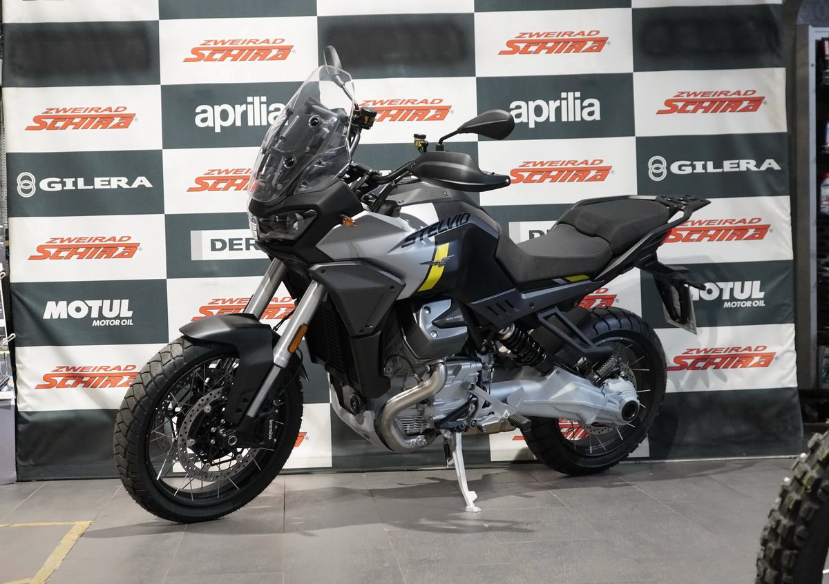 Stelvio wurde entwickelt, um Ihnen zu ermöglichen, das Beste aus jeder Fahrt zu machen und Ihren Horizont ohne Grenzen zu erweitern, dank seines 21-Liter-Tanks mit einer Reichweite von über 400 km. Sein Herzstück ist der Stahlrohrrahmen, der das Handling des Motorrads erleichtert und einen optimalen Kompromiss zwischen Agilität und Stabilität bietet.