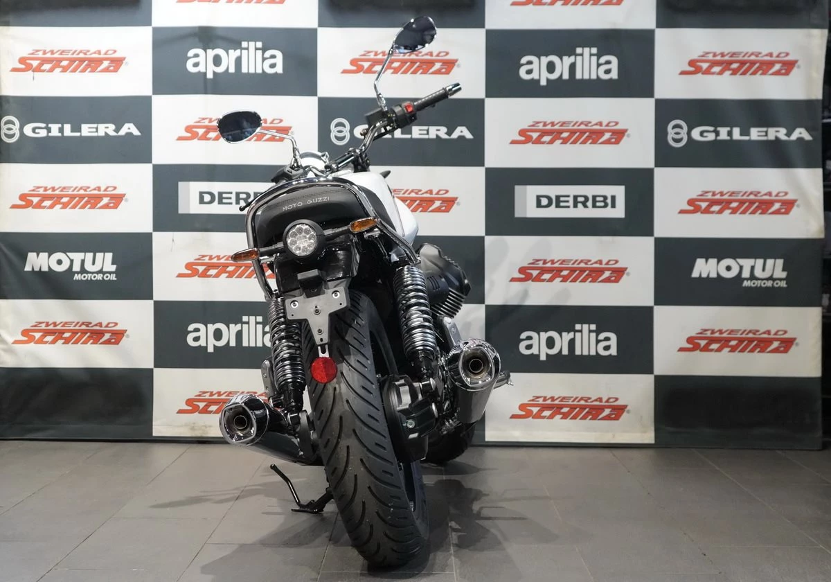 Das ikonische Design der V7 Special zeigt sich im verchromten Soziushaltegriff, den Speichenrädern, dem Scheinwerfer mit seinem Chromrahmen und dem Tagfahrlicht mit der unverwechselbaren Silhouette des Moto Guzzi Adlers. Der 21 Liter Tank umrahmt den V-Motor, während der kurze hintere Kotflügel und die Auspuffendrohre den Linien des Motorrads ein elegantes Aussehen verleihen. Die gefrästen Kühlrippen an den Zylinderköpfen und der mit dem Logo versehene Zündschlüssel spiegeln die berühmte Liebe zum Detail von Moto Guzzi wider.