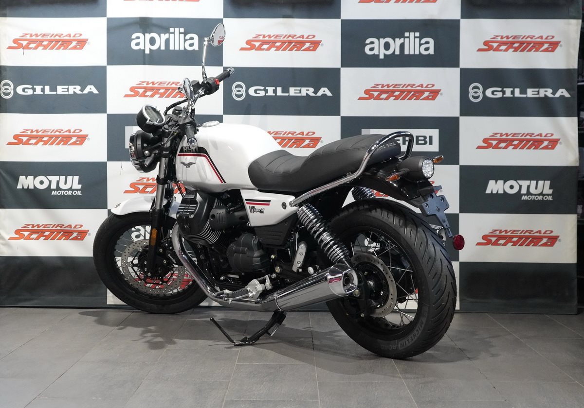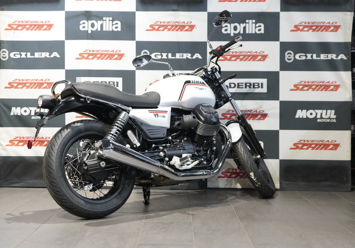 Das ikonische Design der V7 Special zeigt sich im verchromten Soziushaltegriff, den Speichenrädern, dem Scheinwerfer mit seinem Chromrahmen und dem Tagfahrlicht mit der unverwechselbaren Silhouette des Moto Guzzi Adlers. Der 21 Liter Tank umrahmt den V-Motor, während der kurze hintere Kotflügel und die Auspuffendrohre den Linien des Motorrads ein elegantes Aussehen verleihen. Die gefrästen Kühlrippen an den Zylinderköpfen und der mit dem Logo versehene Zündschlüssel spiegeln die berühmte Liebe zum Detail von Moto Guzzi wider.