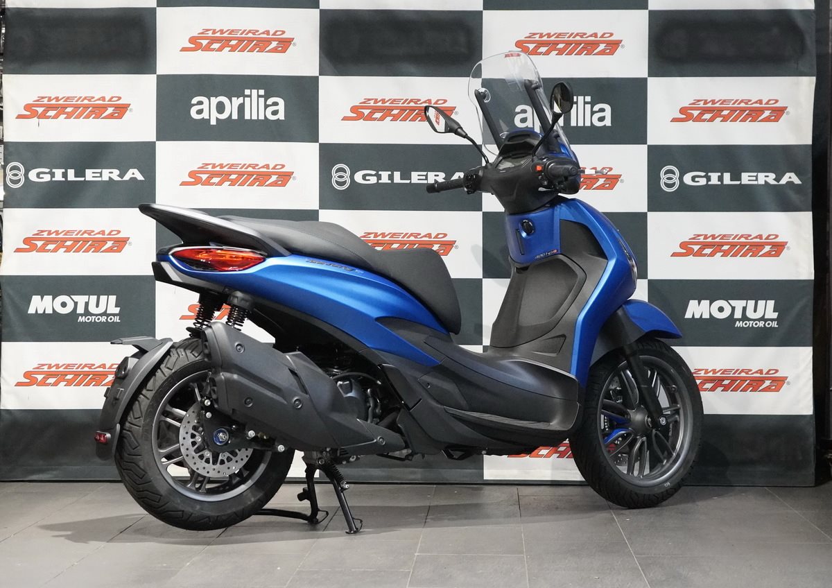 Der Piaggio Beverly S zeichnet sich durch seinen sportlichen Charakter aus. Die matte Graphit-Finish hebt Details wie die Felgen, den hinteren Haltegriff sowie die Einfassungen des Cockpits und des LED-Frontscheinwerfers hervor. Blaue Akzente an dem S im Logo, am Vorderrad und an der Frontkrawatte unterstreichen seinen kraftvollen Stil. Die markante Front mit der V-förmigen Lüftungsöffnung und dem wabenförmigen Kühlergrill sowie das schlanke Heck und die zweifarbigen Nähte der Sitzbank vervollständigen das Design. Sie schaffen eine perfekte Verbindung zwischen einem sportlichen Großradroller und einem kraftvollen Grand Tourer.