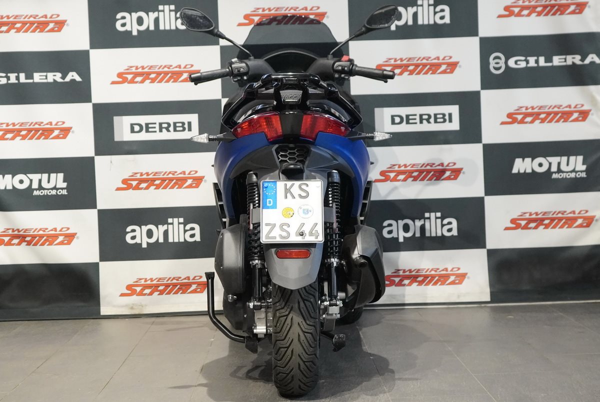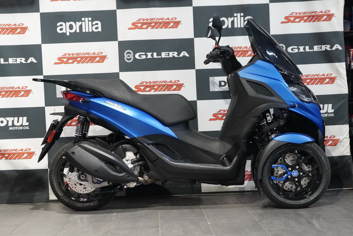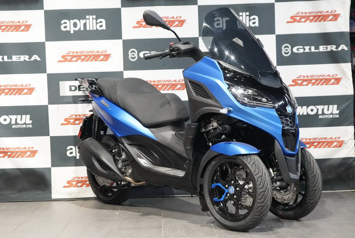 Der Piaggio MP3 310 Sport zieht mit seiner modern geformten Frontpartie und einer Farbgebung, die das stromlinienförmige, vom Automobilbau inspirierte Design unterstreicht, überall die Blicke auf sich. Details wie die blaue Sattelnaht und die Decals auf den schwarzen Vorderradfelgen sorgen ebenfalls für Aufsehen, während ein Mix aus matt- und glänzend-schwarzen Oberflächen und der Fußraum mit seinem Aluminiumeinsatz den sportlichen Look vervollständigen. Diese perfekte Mischung aus Eleganz und Aggressivität, die mit einem B-Führerschein erworben werden kann, ist für Fahrer gedacht, die Stil und Leistung in einem weltweit einzigartigen Fahrzeug suchen.