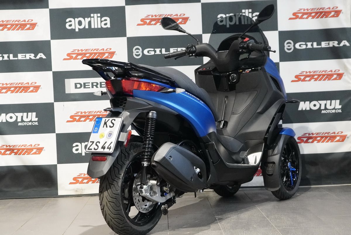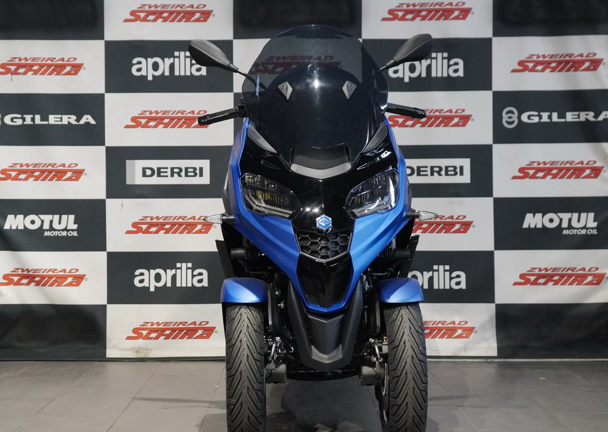 Der Piaggio MP3 310 Sport zieht mit seiner modern geformten Frontpartie und einer Farbgebung, die das stromlinienförmige, vom Automobilbau inspirierte Design unterstreicht, überall die Blicke auf sich. Details wie die blaue Sattelnaht und die Decals auf den schwarzen Vorderradfelgen sorgen ebenfalls für Aufsehen, während ein Mix aus matt- und glänzend-schwarzen Oberflächen und der Fußraum mit seinem Aluminiumeinsatz den sportlichen Look vervollständigen. Diese perfekte Mischung aus Eleganz und Aggressivität, die mit einem B-Führerschein erworben werden kann, ist für Fahrer gedacht, die Stil und Leistung in einem weltweit einzigartigen Fahrzeug suchen.