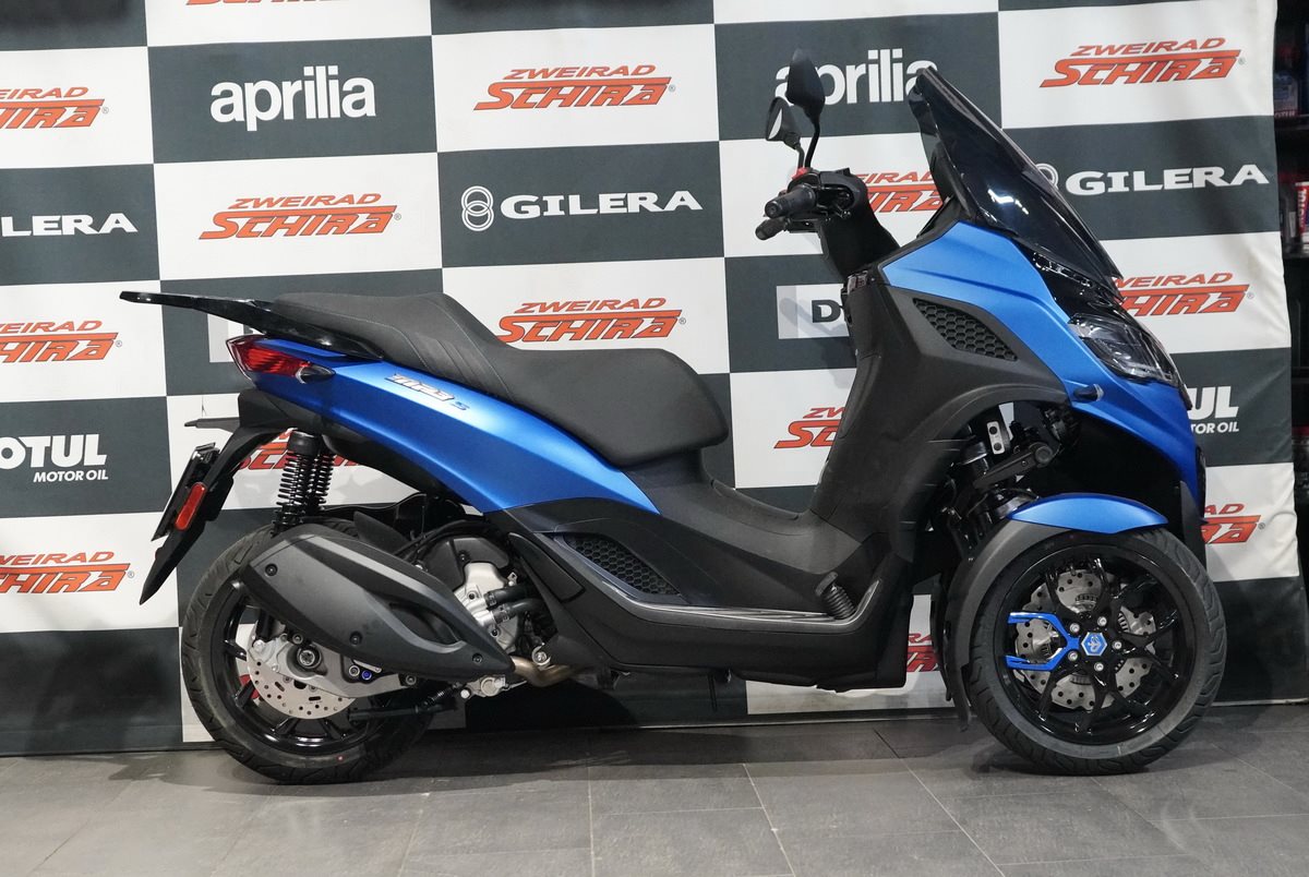 Der Piaggio MP3 310 Sport zieht mit seiner modern geformten Frontpartie und einer Farbgebung, die das stromlinienförmige, vom Automobilbau inspirierte Design unterstreicht, überall die Blicke auf sich. Details wie die blaue Sattelnaht und die Decals auf den schwarzen Vorderradfelgen sorgen ebenfalls für Aufsehen, während ein Mix aus matt- und glänzend-schwarzen Oberflächen und der Fußraum mit seinem Aluminiumeinsatz den sportlichen Look vervollständigen. Diese perfekte Mischung aus Eleganz und Aggressivität, die mit einem B-Führerschein erworben werden kann, ist für Fahrer gedacht, die Stil und Leistung in einem weltweit einzigartigen Fahrzeug suchen.