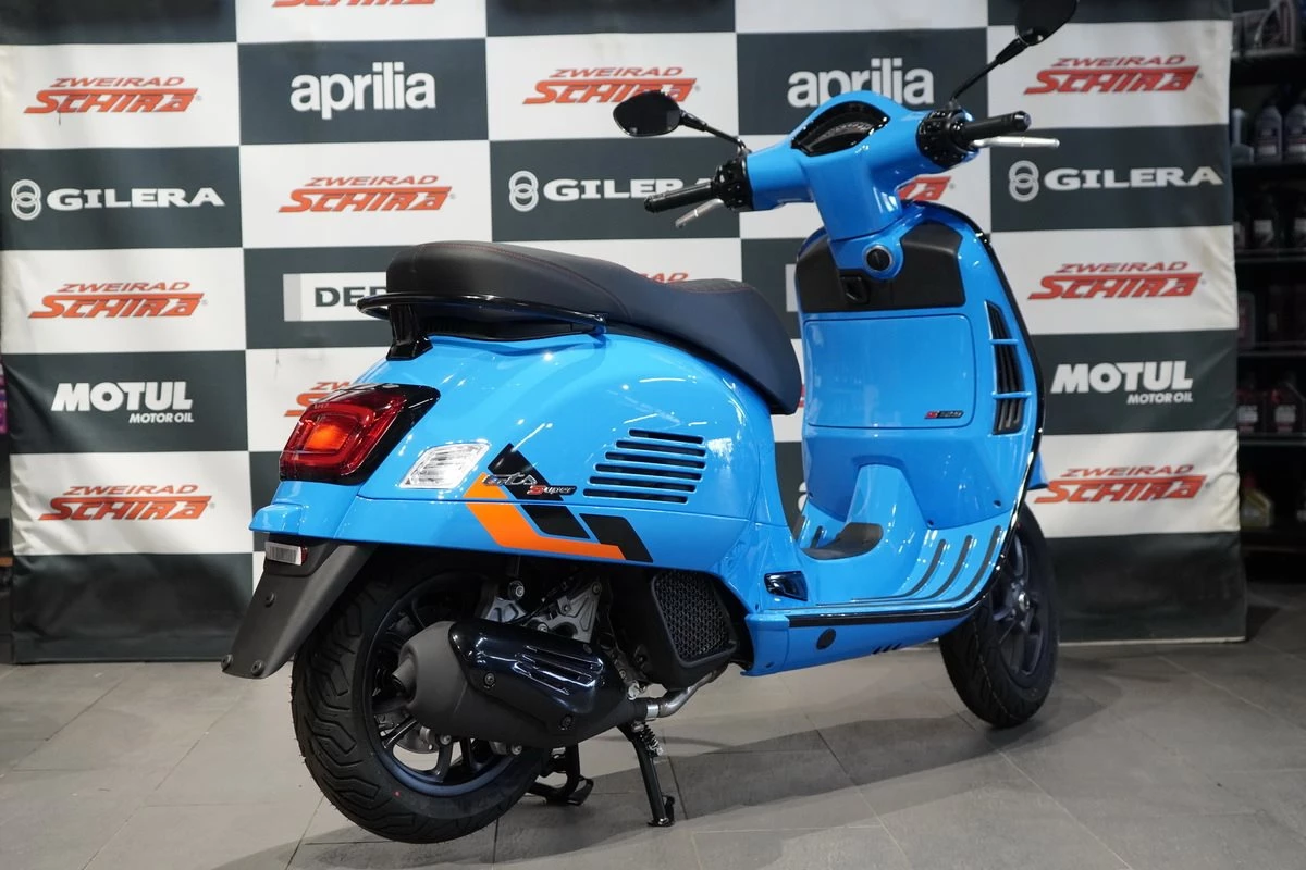 Die Vespa Gts SuperSport besticht durch ihre glänzenden und matten Farben, die durch Details im Carbon-Look und glänzend schwarze Zierleisten ergänzt werden. Die Sitzbank mit hochwertigen Materialien und Kontrastnähten unterstreicht ihren starken Charakter. Mit der Vespa Gts SuperSport wird jeder Tag zu einem aufregenden Abenteuer.