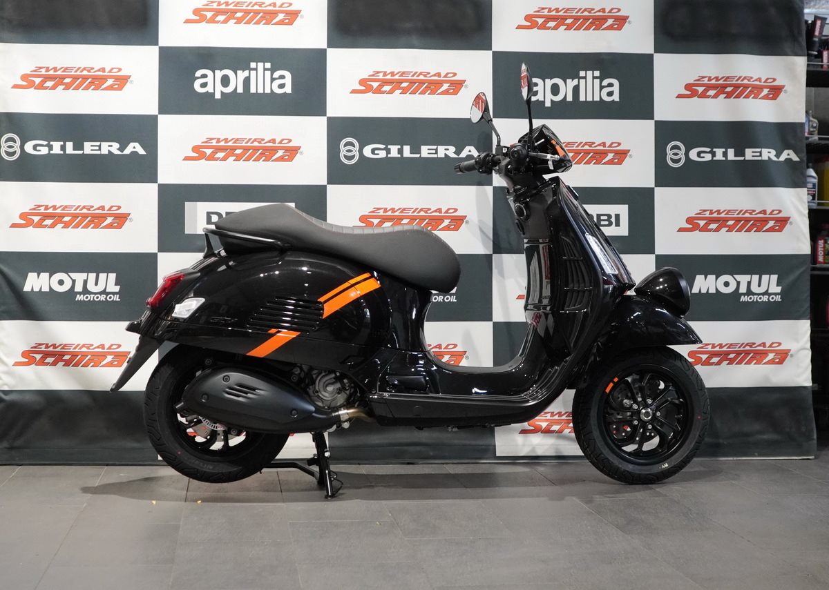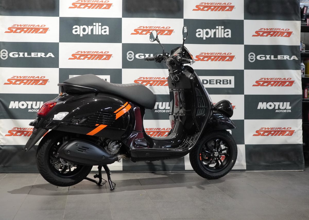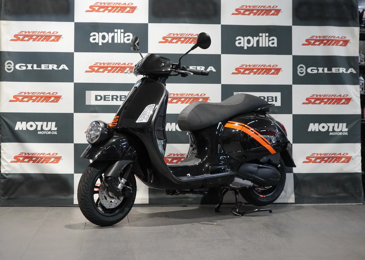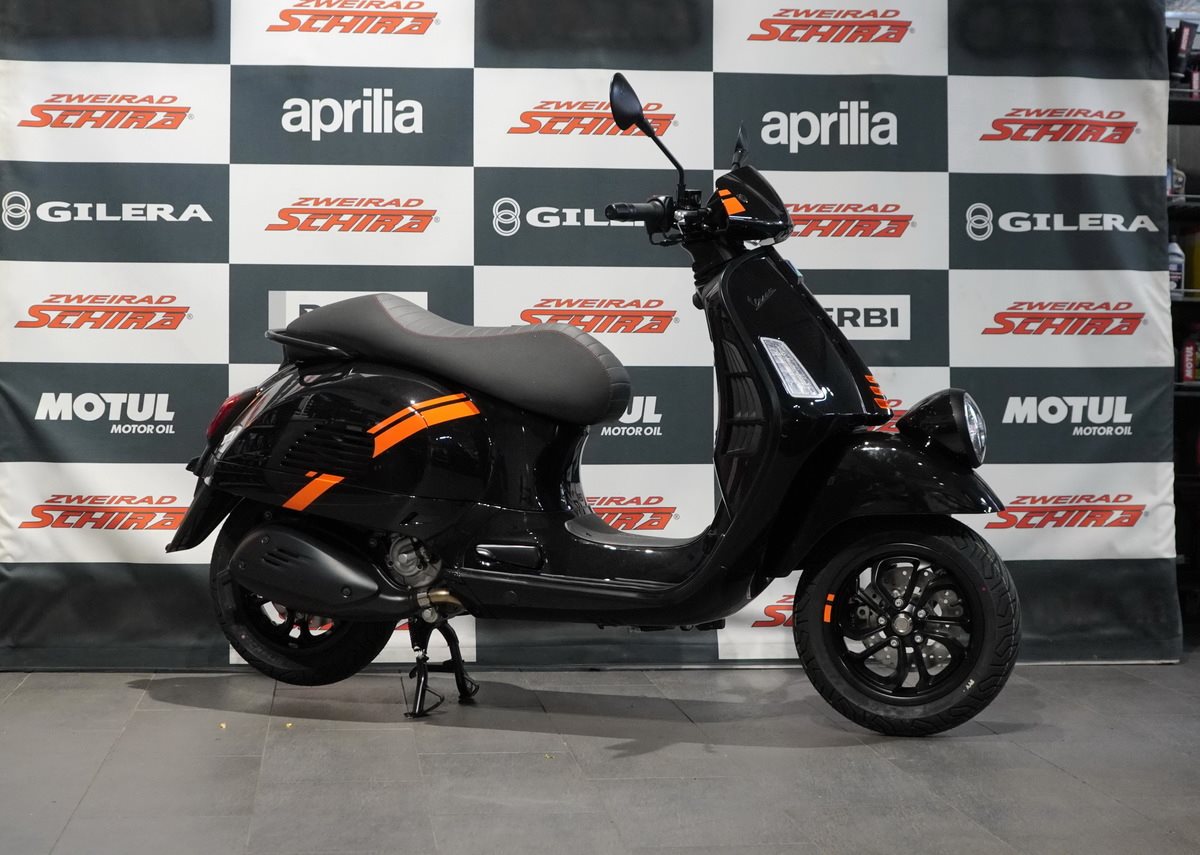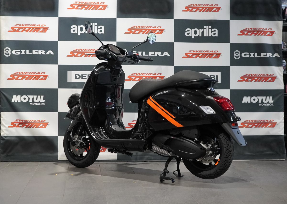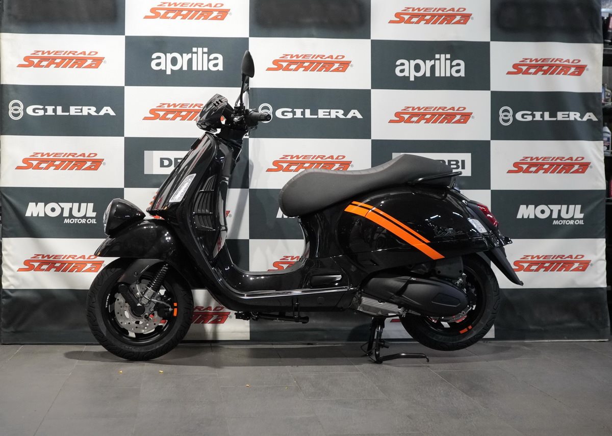 Das Styling der Vespa GTV zeichnet sich durch mattschwarze Akzente und kontrastierende orangefarbene Grafiken an den Seiten aus. Erhältlich in Schwarz Convinto und mattem Beige Avvolgente.