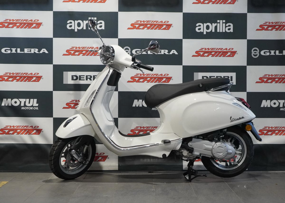 Moderne Details und zeitloser Stil verbinden sich. Mit ihrem schnittigen Design und den Chromakzenten bringt die Vespa Primavera eine zeitgenössische Ausstrahlung und eine lebendige Farbpalette in das reiche Erbe der Vespa.