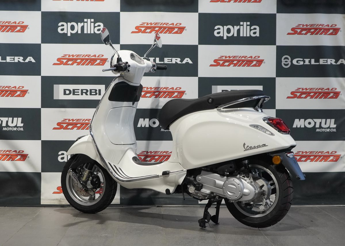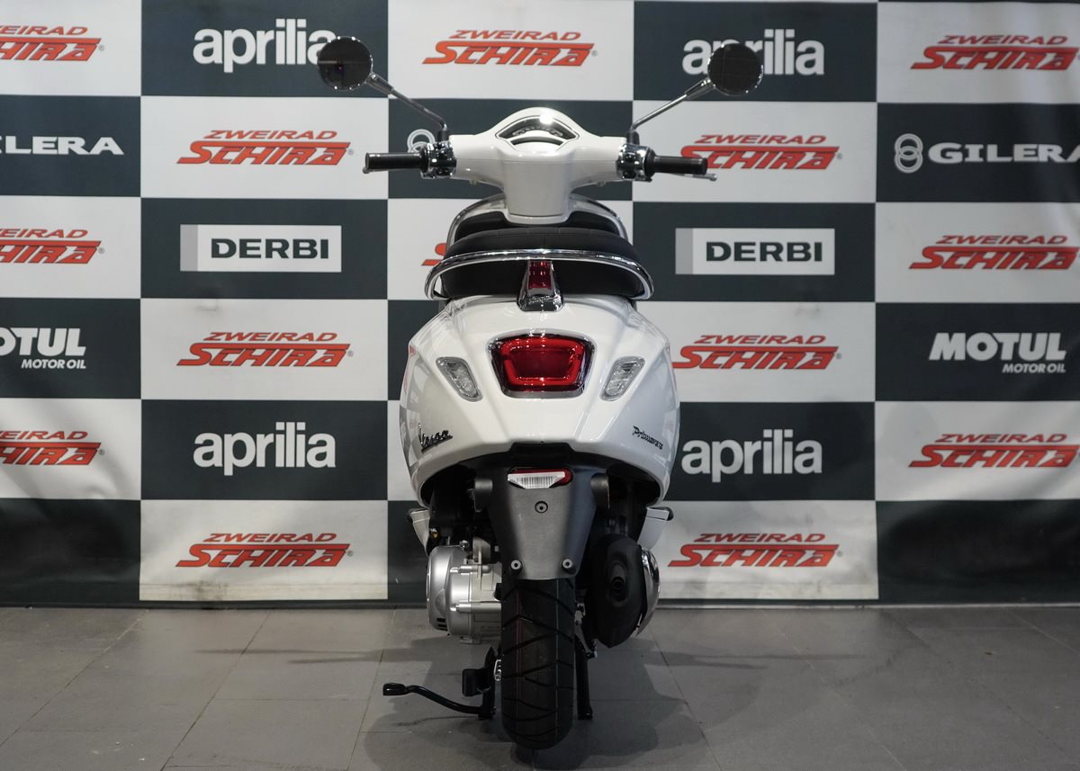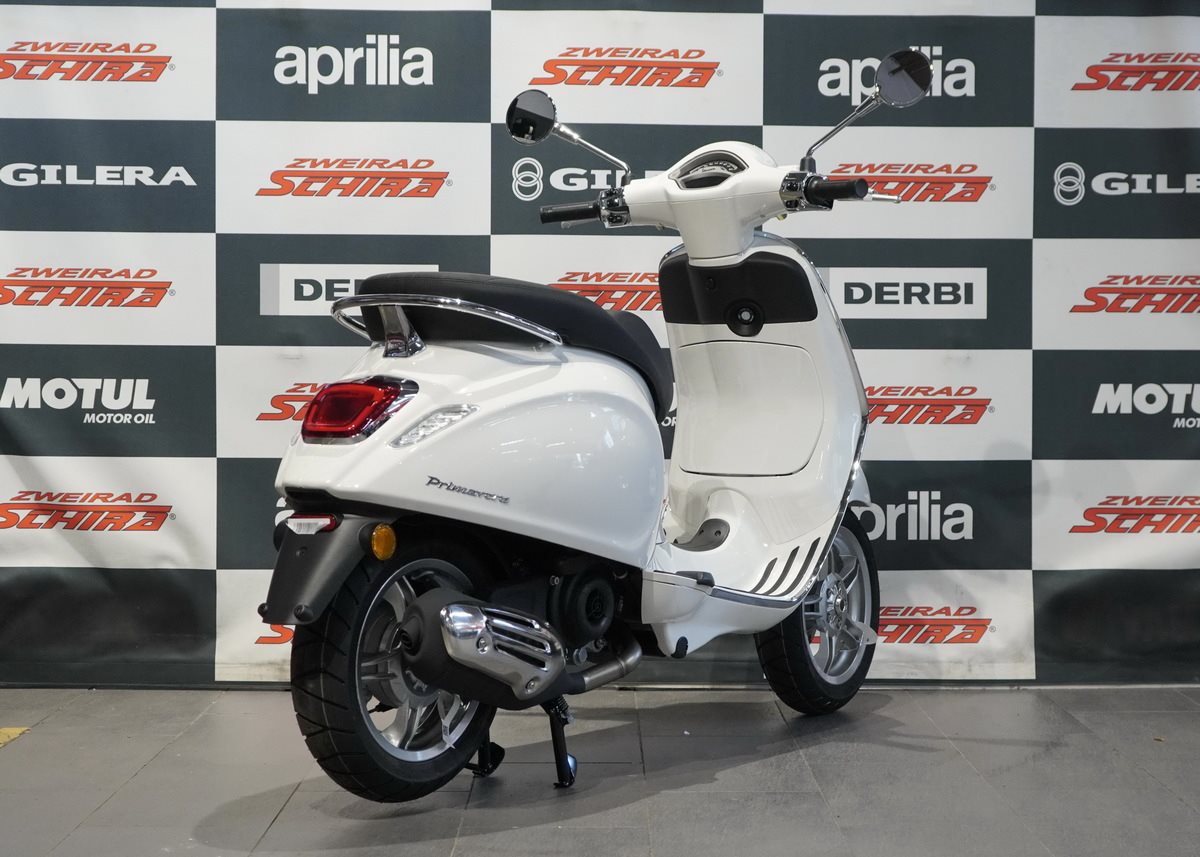 Moderne Details und zeitloser Stil verbinden sich. Mit ihrem schnittigen Design und den Chromakzenten bringt die Vespa Primavera eine zeitgenössische Ausstrahlung und eine lebendige Farbpalette in das reiche Erbe der Vespa.