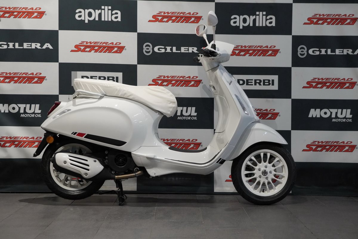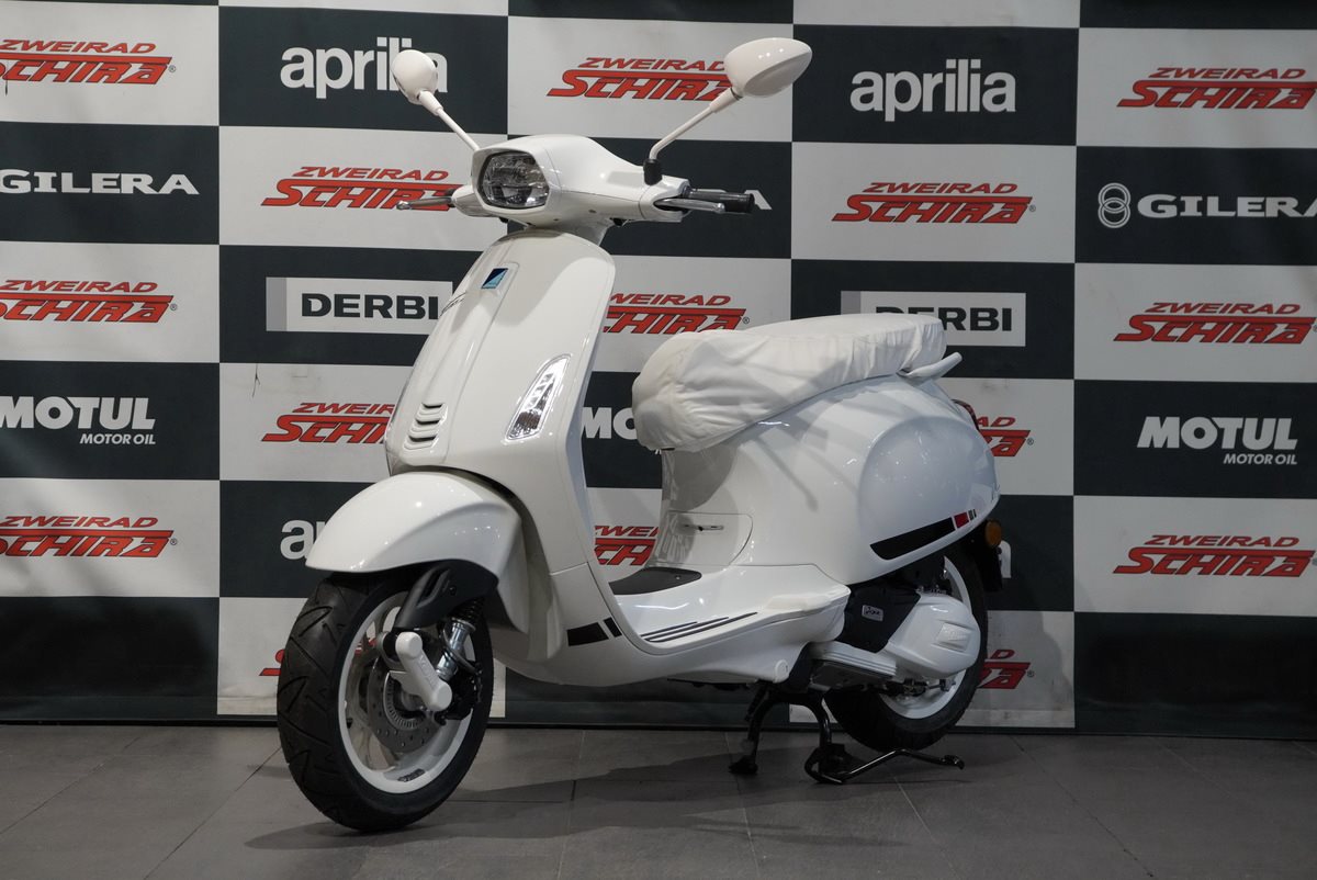Moderne Details und zeitloser Stil verbinden sich. Mit ihrem schnittigen Design und den Chromakzenten bringt die Vespa Primavera eine zeitgenössische Ausstrahlung und eine lebendige Farbpalette in das reiche Erbe der Vespa.
