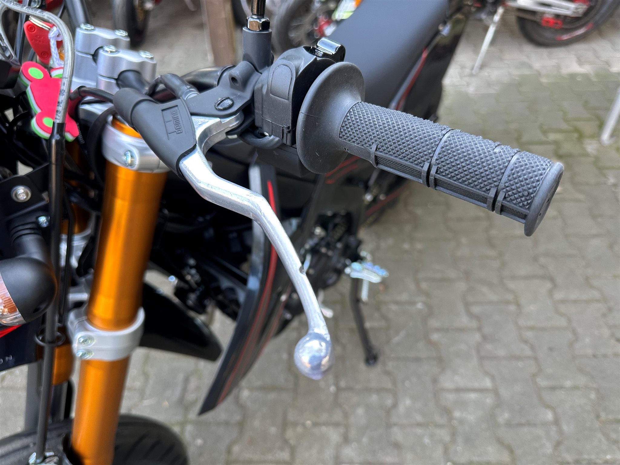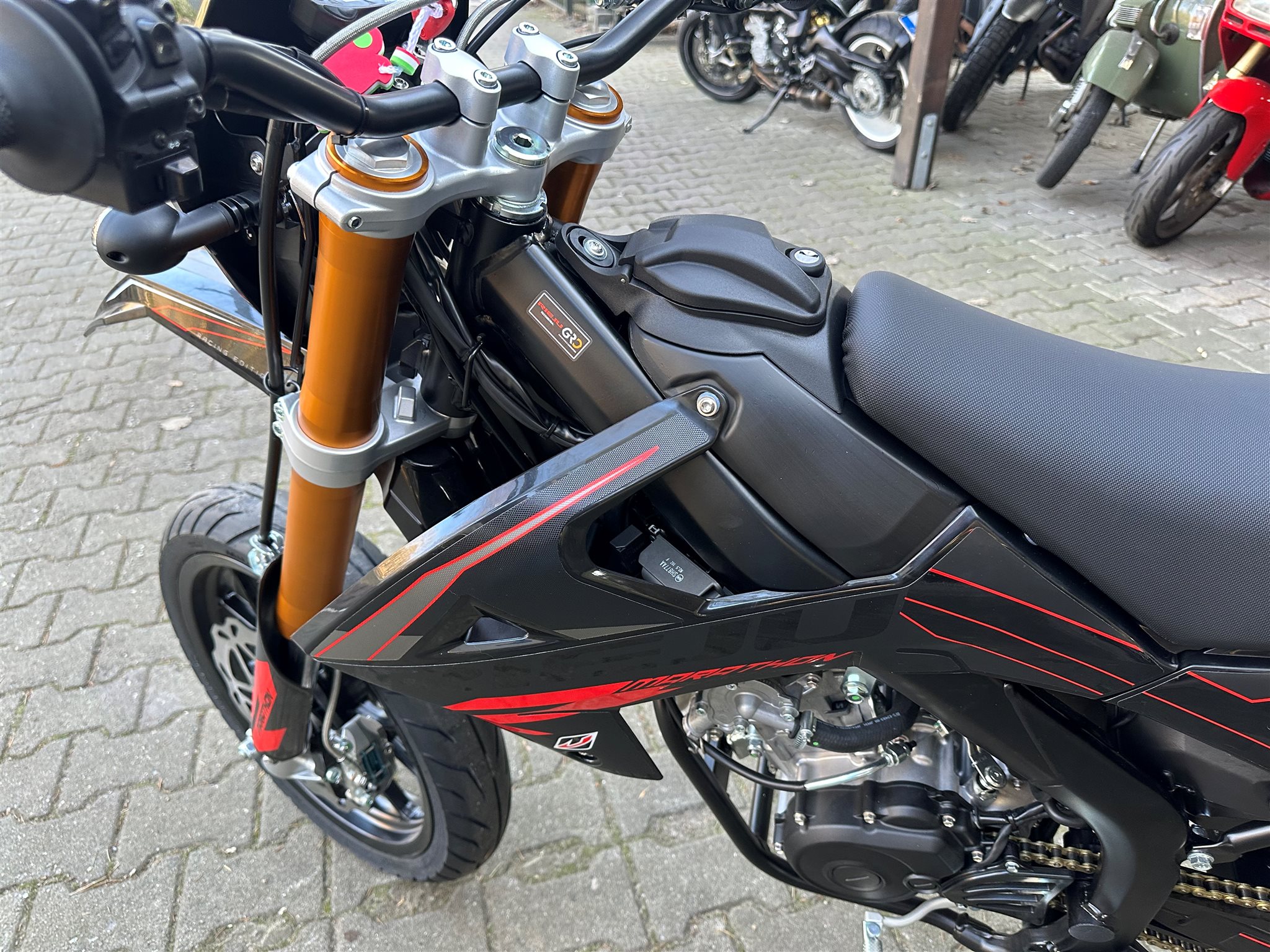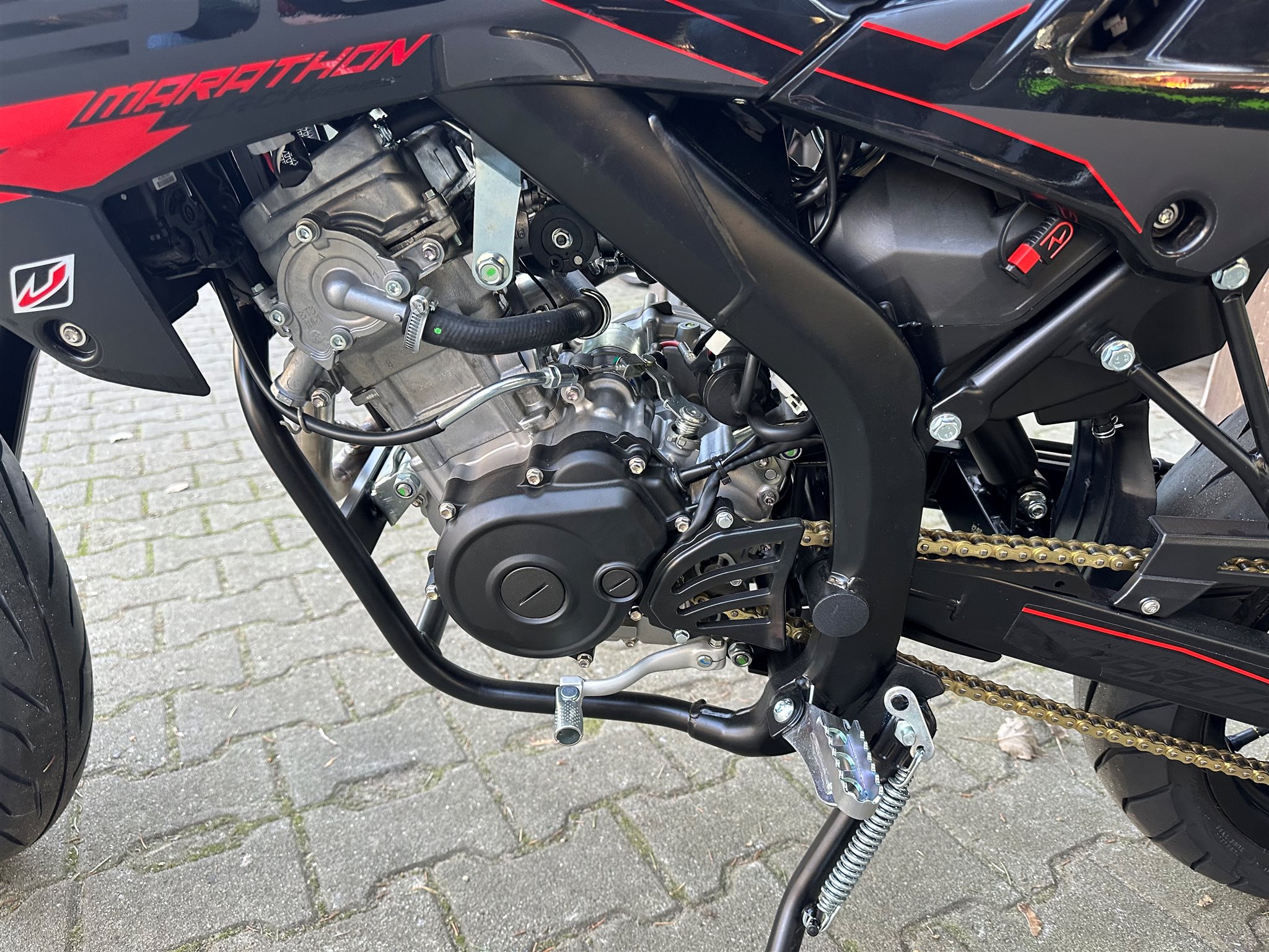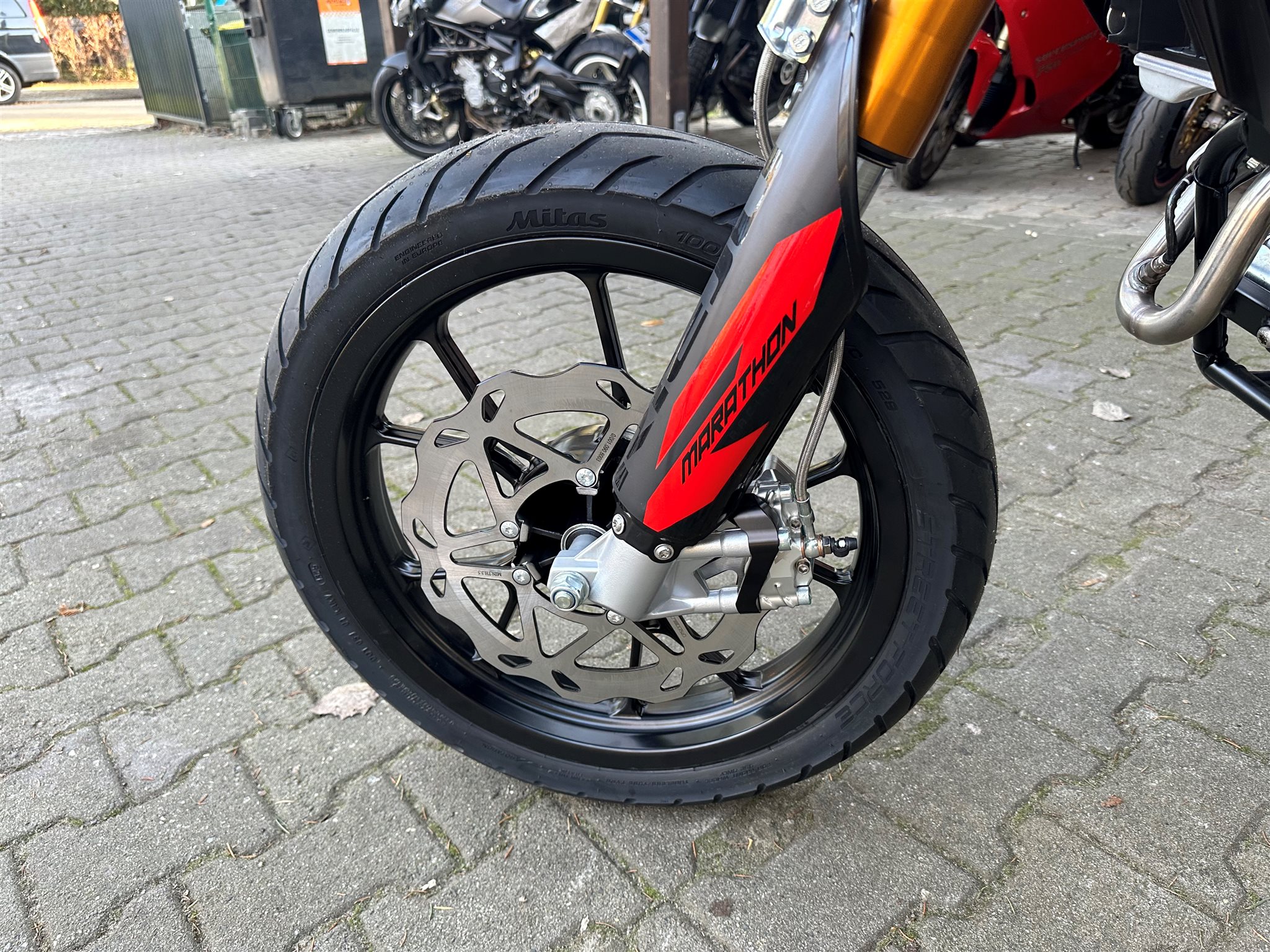 Wenn Sie ein wendiges, kraftvolles Supermoto-Motorrad mit markantem Design suchen, ist die Marathon Europa 125 SM genau das Richtige für Sie. Gebaut für müheloses Fahren in der Stadt und maximalen Fahrspaß in jeder Kurve, vereint dieses Modell einen aggressiven, sportlichen Look mit hochwertigen Komponenten für Spitzenleistung.