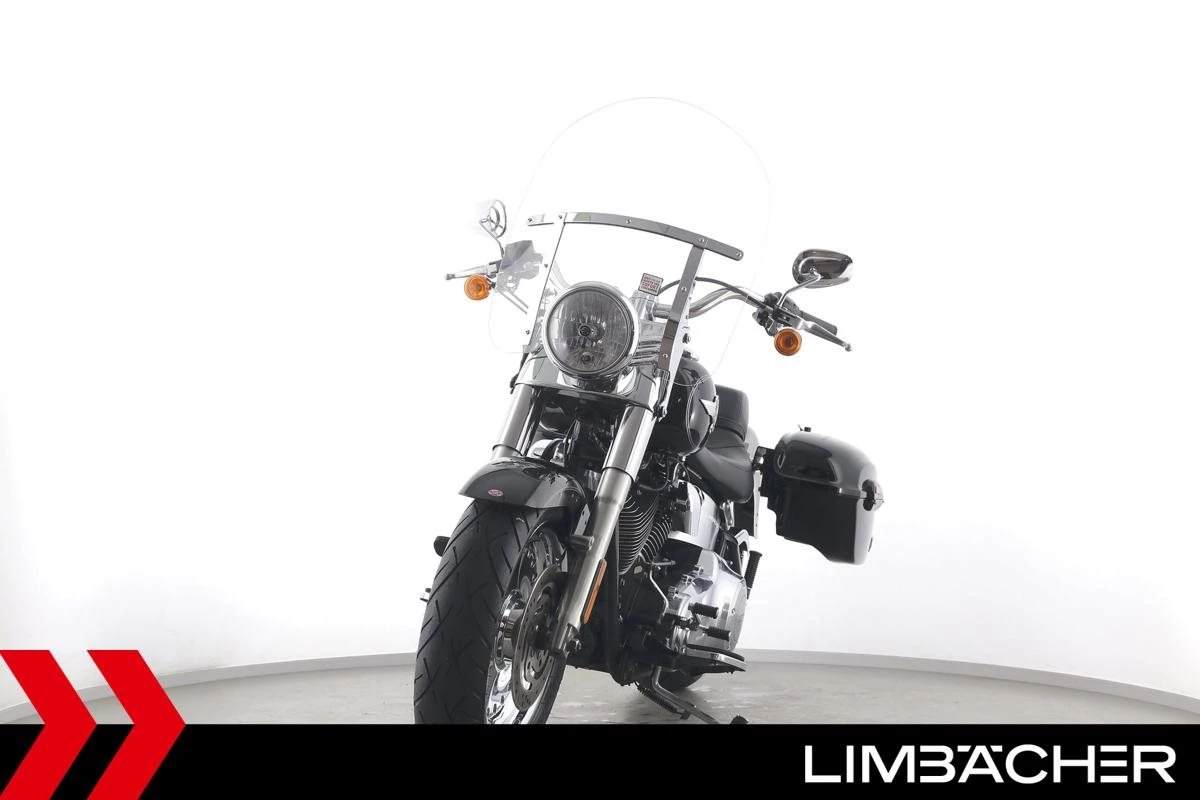 Eine Harley-Davidson Softail Fat Boy FLSTF in sehr gepflegtem Zustand u.a. mit Jekill&Hyde-Klappenauspuff sowie Touring-Windschild.