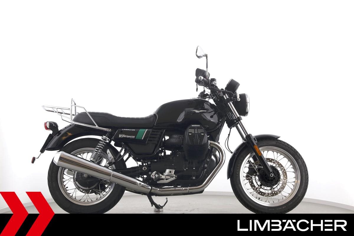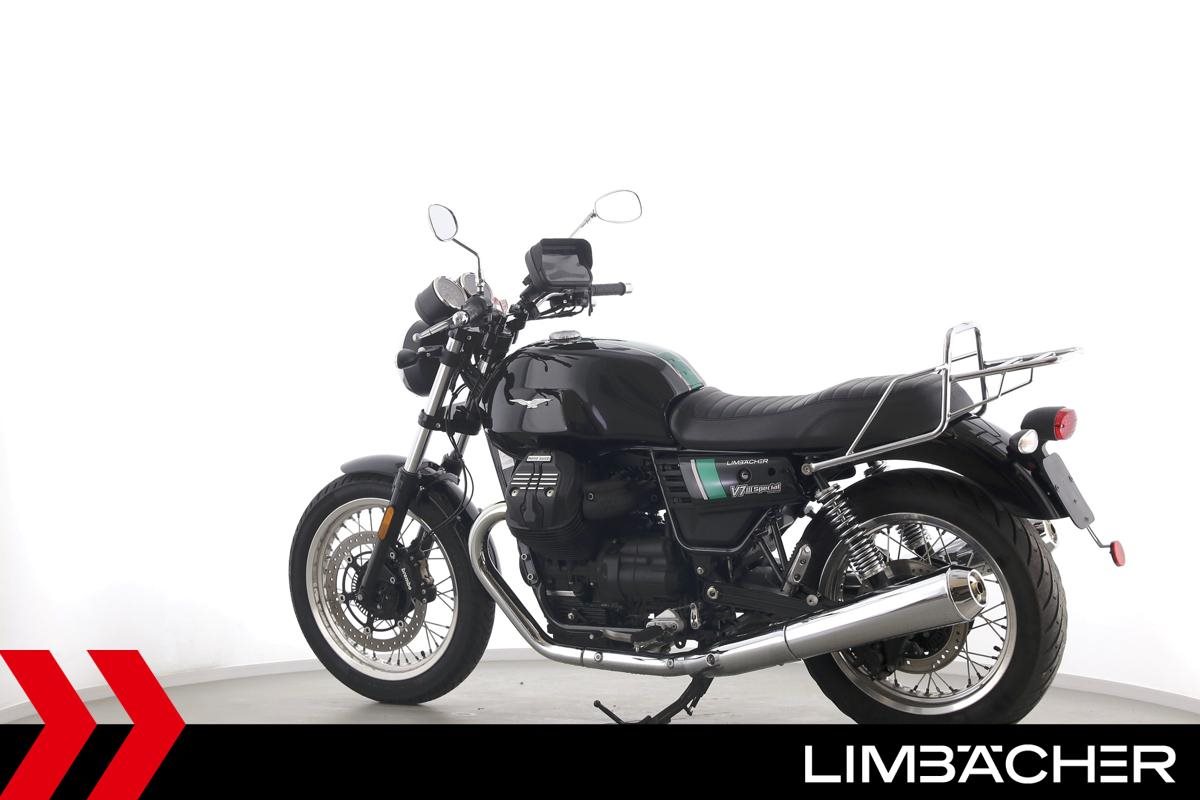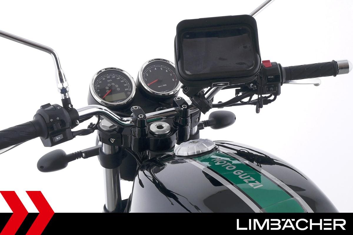 Eine scheckheftgepflegte Moto Guzzi V7 III Special aus erster Hand in gepflegtem Zustand mit Gepäckträger und GPS/Smartphonehalter.