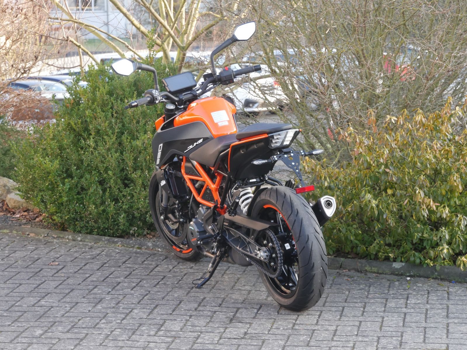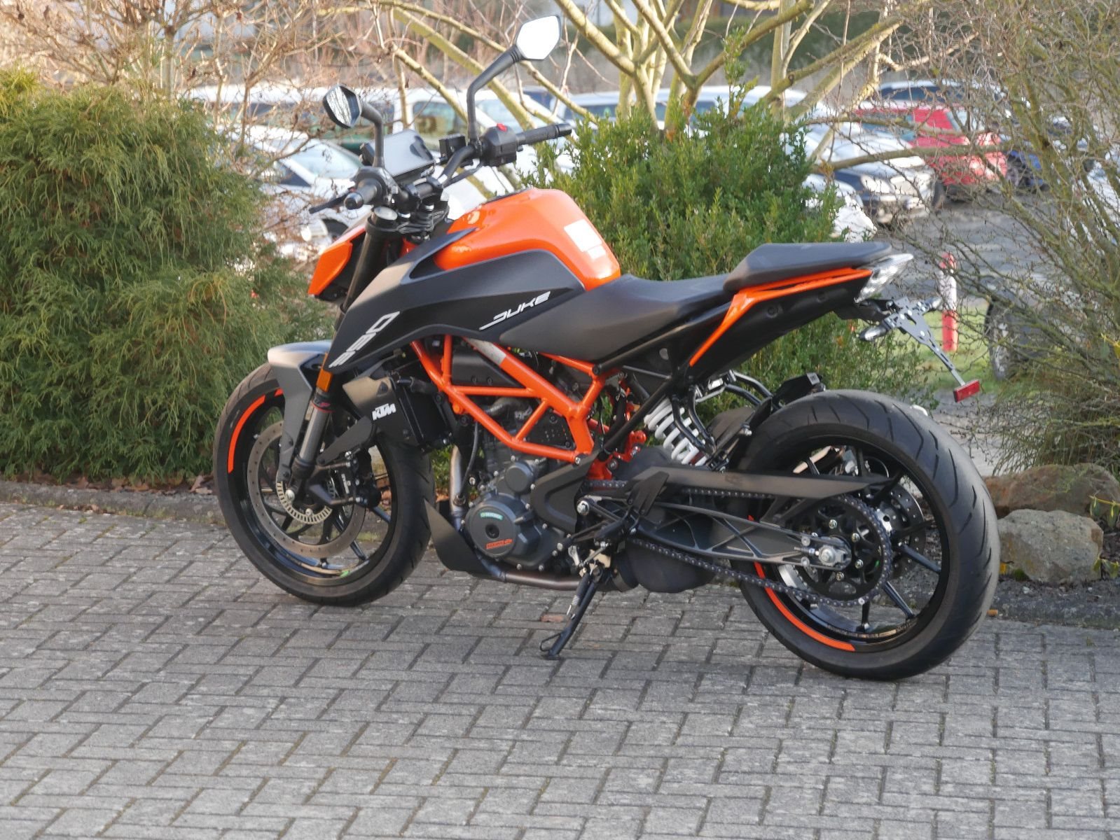 KTM 390 Duke mit Quickshifter, kurzem Kennzeichenhalter, CNC- gefräßtem Kupplungsgriff und nur 150km Laufleistung.