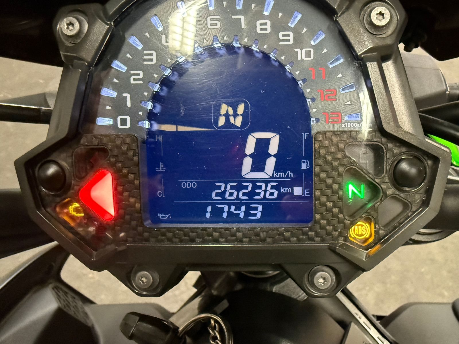 Ausgestattet mit "LEO VINCE "- Auspuffanlage, Sturzpads, KAWASAKI Windschild, ORIGINAL KAWASAKI Soziusabdeckung, kurzem Kennzeichenhalter mit LED Umlaufblinkern sowie grünen Bobbins für den Aufbockständer.