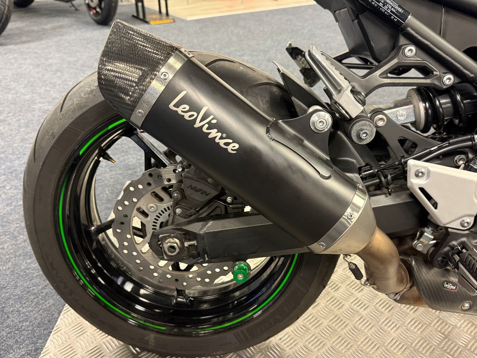 Ausgestattet mit "LEO VINCE "- Auspuffanlage, Sturzpads, KAWASAKI Windschild, ORIGINAL KAWASAKI Soziusabdeckung, kurzem Kennzeichenhalter mit LED Umlaufblinkern sowie grünen Bobbins für den Aufbockständer.