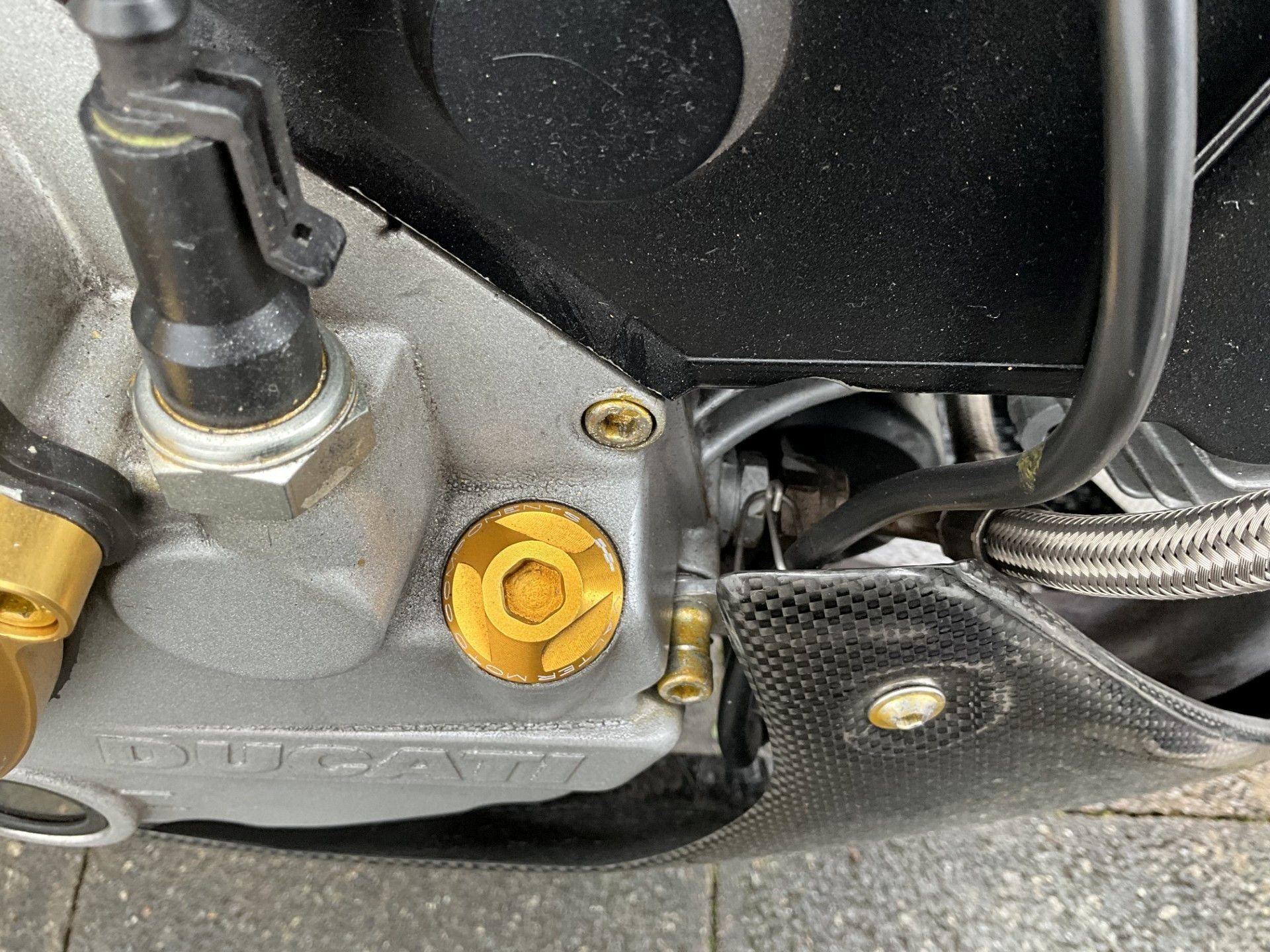 Anbauteile (gold): Raximo Lenkergriffe, Öl-Einfüllverschluss, geschlossener Kupplungsdeckel mit Sichtscheibe, Kettenspanner Achsplatte "Duc or Die", Deckel Kettenspanner