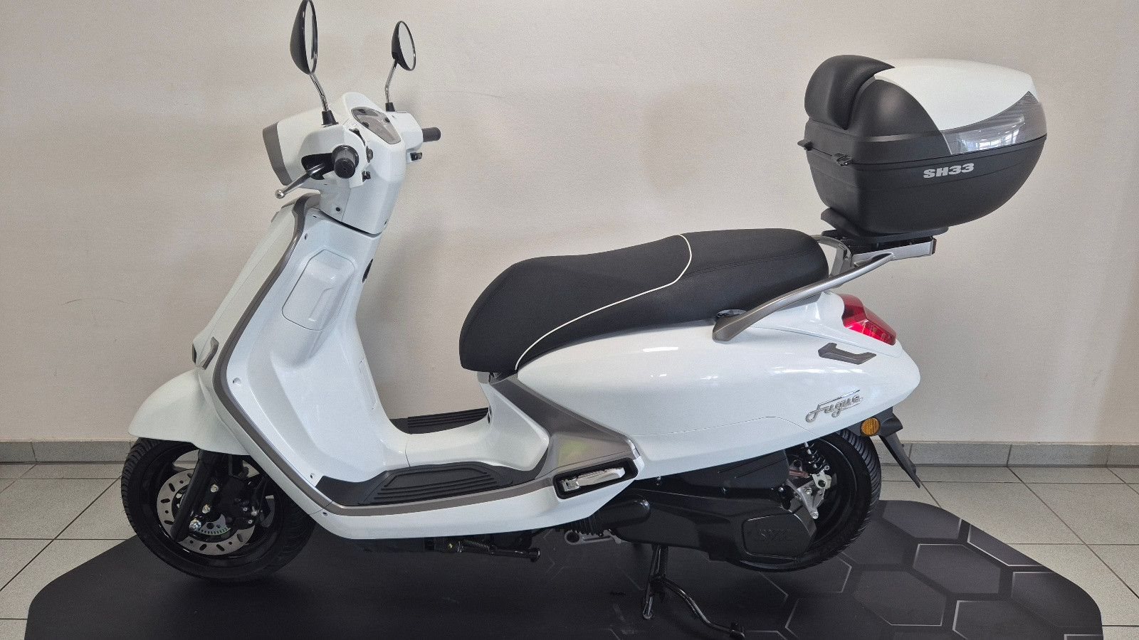 SYM FUGUE 125 - Der moderne Klassiker unter den Rollern Der FUGUE 125 verbindet zeitlose Eleganz mit modernster Technik und ist der perfekte Roller für alle, die sowohl Stil als auch Funktionalität suchen. Inspiriert von der musikalischen Form der "Fuge", steht der FUGUE 125 für Harmonie, Präzision und ein einzigartiges Design. Mit seiner stilvollen Karosserie zieht er bei jeder Fahrt die Blicke auf sich. Dieser Roller bietet alles, was man sich von einem modernen Klassiker wünscht: eine vollständige LED-Beleuchtung für optimale Sicht und Sicherheit, ein LCD-Instrumentenpanel, das alle wichtigen Fahrdaten auf einen Blick anzeigt, und eine USB QC 3.0-Ladebuchse. Mit dem großzügigen 27-Liter Stauraum unter dem Sitz bietet der FUGUE 125 zudem ausreichend Platz für Ihre persönlichen Gegenstände - perfekt für den täglichen Einsatz in der Stadt. Dank des ABS-Scheibenbremssystems können Sie sich auf exzellente Bremskraft und höchste Sicherheit verlassen. Der FUGUE 125 ist der ideale Begleiter für Ihre urbanen Fahrten und garantiert ein Fahrgefühl der Extraklasse. Ob im hektischen Stadtverkehr oder bei entspannten Fahrten durch die Straßen - der FUGUE 125 macht jede Fahrt zu einem Highlight. Erleben Sie die perfekte Kombination aus Design, Komfort und Performance und lassen Sie sich von diesem Roller begeistern. FUGUE 125 - Ihr neuer urbaner Klassiker.