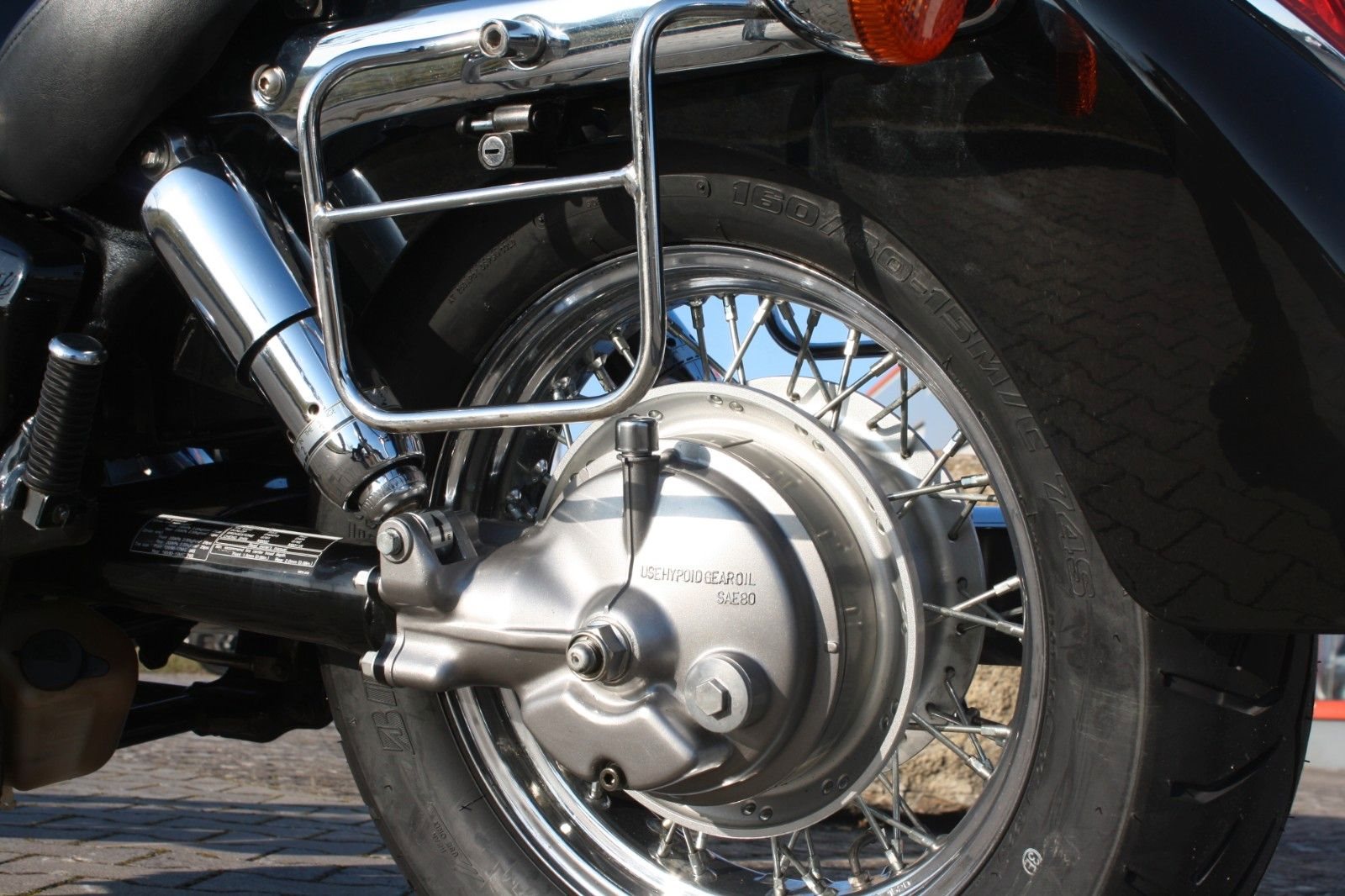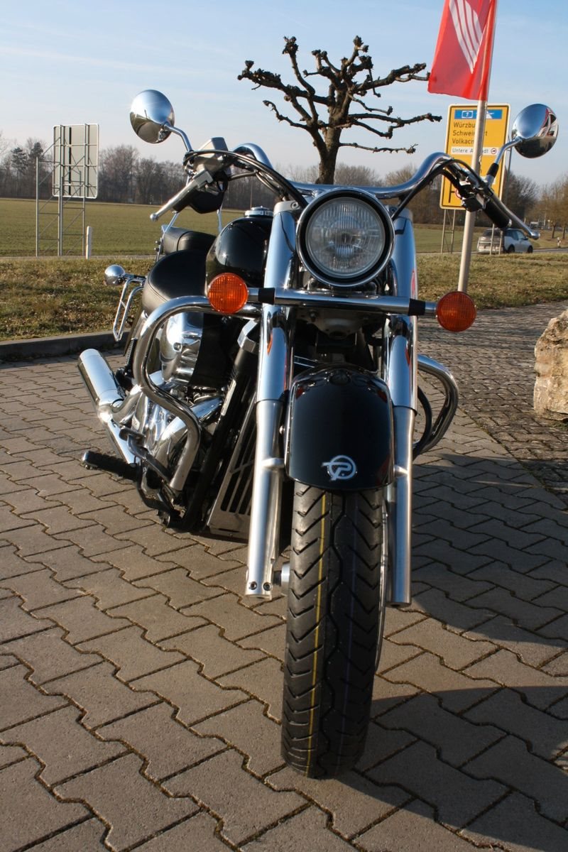 Zur Ausstattung gehören ein massiver Sturzbügel, eine Sissybar mit Gepäckbrücke, Taschenhalter sowie ein Kühlerschutz. Ein rundum cooles Bike für entspannte Touren und gemütliches Cruisen.