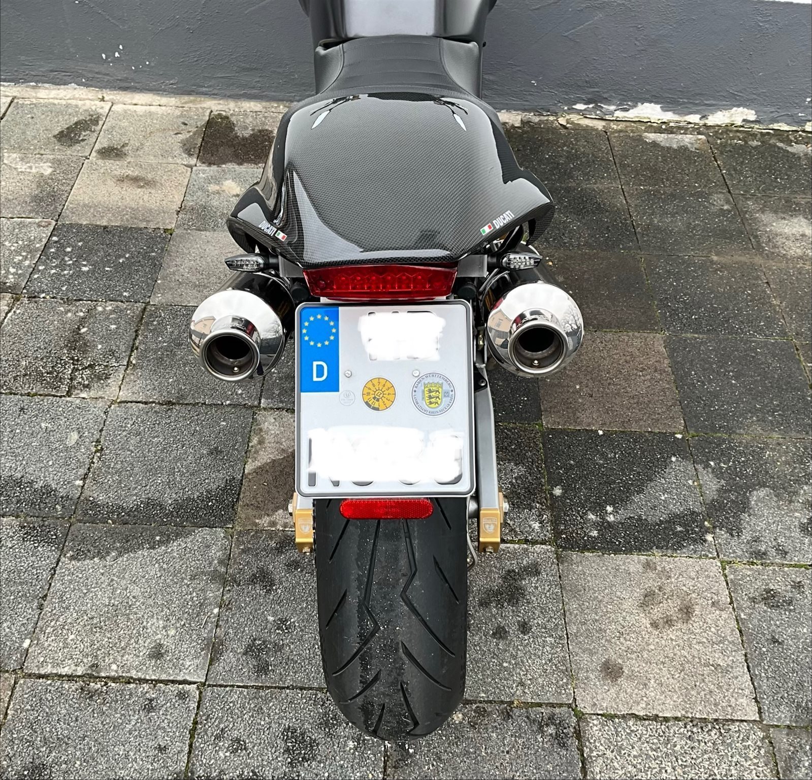 Optik: Kurzes Heck, MRA Windschutzscheibe (schwarz), LED-Rücklicht, Mini-LED-Blinker, Carbon Soziusabdeckung, Carbon Bugspoiler