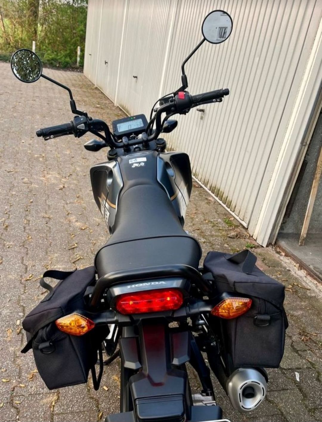 Satteltaschen mit Halterung , Seitenständerfuß, Handyhalter, Spiegelverlängerung Alu schwarz eloxiert, Verstellbare Brems und Kupplungshebel Alu schwarz eloxiert