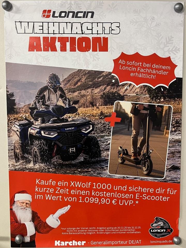 Neufahrzeug vom Vertragshändler mit Werksgarantie, die bei allen Vertragshändlern gültig ist.____________________________________________Gerne liefern wir Ihnen Ihr Quad für 250,00 Euro innerhalb Deutschlands ausgenommen der Inseln.____________________________________________Loncin XWolf 1000L ABS -> Barzahlungspreis: 12.999,90 € zzgl. 360€ Überführungskosten Loncin XWolf 1000L Muddy-> Barzahlungspreis: 13.399,90 € zzgl. 360€ Überführungskosten Sonderfinanzierung auch ohne Anzahlung möglich. Für mehr Informationen oder einer individuellen Beratung kommen Sie gerne persönlich bei uns vorbei oder besuchen Sie uns im Internet. Scherzer GmbH Crailsheimer Str. 14 91555 Feuchtwangen Tel: 09852/67660 XWolf 1000L Muddy EXPLORE YOUR WAY Mehr Geländegängigkeit, mehr Freiheit: Das Loncin XWolf 1000L Muddy ist gemacht für alle, die keine Grenzen kennen. Es vereint alle Vorteile und Features der 1000L-Standardversion (T3b ABS) mit einem hochgelegten Kühler, CVT-Auslass und Luftansaugtrakt und bleibt so selbst bei tiefem Wasser und schwerem Gelände souverän für maximale Performance, wenns richtig dreckig wird. XWolf 1000L ABS EXPLORE YOUR WAY Mit dem neuen Loncin XWolf 1000 ABS erlebst Du Offroad-Performance auf einem völlig neuen Level! Ob für extreme Abenteuer, fordernde Arbeitseinsätze oder das pure Vergnügen - unser Neuzugang bietet Dir alles, was Du von einem Premium-ATV erwartest. Erlebe Fahrspaß auf höchstem Niveau und geh an Deine Grenzen der XWolf 1000 ABS wird Dich nicht enttäuschen! Leistungsstarker 1000cc-V2-Motor mit beeindruckenden 7000 U/min für maximale Durchzugskraft und dynamisches Beschleunigen, egal ob auf der Straße oder im Gelände. ABS (Antiblockiersystem) für zusätzliche Sicherheit auf unebenem Untergrund. Bremsen mit voller Kontrolle, ohne das Risiko eines blockierenden Rads ein entscheidender Vorteil in kritischen Fahrsituationen. Servolenkung für ein müheloses, präzises Handling selbst auf schwierigstem Terrain. Erlebe maximalen Komfort bei Manövern und reaktionsschnelles Fahren ohne Kraftaufwand. Seilwinde an der Front für den Einsatz in unwegsamen Gebieten. Zieh Dich aus jedem Hindernis heraus oder helfe anderen die leistungsstarke Seilwinde macht den Unterschied, wenn es darauf ankommt. Anhängerkupplung Mit einer robusten Anhängerkupplung bist Du bereit für schwere Lasten und Transportaufgaben. Ob auf dem Hof, im Wald oder bei Outdoor-Abenteuern der XWolf 1000 ABS meistert alle Aufgaben. Hydraulische Scheibenbremsen an allen vier Rädern bieten kompromisslose Bremsleistung. Perfekte Dosierbarkeit und sofortige Reaktion sorgen für Sicherheit, auch bei steilen Abfahrten und anspruchsvollen Offroad-Bedingungen. Technische Daten Motor: Benzinbetrieben, 2 Zylinder, 4-Takt Höchstgeschwindigkeit: 110 km/h Hubraum: 976 cm Leistung (max.): 72 kW / 7.000 U./Min. Kühlung: Flüssigkeitskühlung Zündung: Elektronische Zündung (CDI) Starter: Elektrostarter Getriebe: CVT Antrieb: 2WD/4WD EPS (elektrische Servolenkung): Ja Vorderes Differential elektrisch sperrbar: Ja Bremse vorne: Scheibenbremse (hydraulisch) Bremse hinten: Scheibenbremse (hydraulisch) Bremsassistenzsystem: ABS Feststellbremse: Ja Federung vorne: Gasdruck-Dämpfer Federung hinten: Gasdruck-Dämpfer Bereifung vorne: 27x9-14 Bereifung hinten: 27x11-14 Felgen: Aluminium Sitze: 2 Beleuchtung: LED Instrumente: Digital Tankinhalt (ca.): 33 l CO2-Emission: 785,62 g/kWh Ausstattung Lenkerschloss: Ja Handprotektoren: Ja Rückenlehne: Ja Gepäckträger: Vorne / Hinten Low & High, Untersetzung: Ja Seilwinde vorne: Ja Anhängerkupplung: Ja Anhängelast (max.): 800 kg (gebremst) Anschlüsse 12V-Anschluss: Ja USB: USB Type C USB Type A(beide zum Laden externer Geräte (5V)) Maße XWolf 1000L ABS Länge: 2.402 mm Breite: 1.266 mm Höhe: 1.502 mm Radstand: 1.500 mm Maße XWolf 1000L Muddy Länge: 2.500 mm Breite: 1.266 mm Höhe: 1.425 mm Radstand: 1.500 mm Irrtümer, Änderungen und Zwischenverkauf vorbehalten!