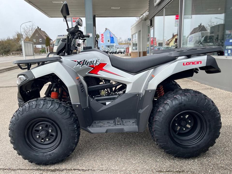 Neufahrzeug vom Vertragshändler mit Werksgarantie, die bei allen Vertragshändlern gültig ist.\n____________________________________________\n\nGerne liefern wir Ihnen Ihr Quad für 250,00 Euro innerhalb Deutschlands ausgenommen der Inseln.\n____________________________________________\n\nBarzahlungspreis: 3.299,90 €\nzzgl. 240 € Überführungskosten\n\nSonderfinanzierung auch ohne Anzahlung möglich.\n\nFür mehr Informationen oder einer individuellen Beratung kommen Sie gerne persönlich bei uns vorbei oder besuchen Sie uns im Internet.\nScherzer GmbH\nCrailsheimer Str. 14\n91555 Feuchtwangen\nTel: 09852/67660\n\nEXPLORE YOUR WAY\n\nAufsteigen, losfahren, Spaß haben das Loncin XWolf 200 ist dein unkomplizierter Einstieg in die Welt der Quads. Mit seinem robusten 176-cm-Motor, einfacher Bedienung und solidem Fahrwerk bietet er genau das, was Einsteiger brauchen: puren Fahrspaß ohne Schnickschnack.\n\nTechnische Daten\n\nAllgemeine Spezifikationen\nMotor:\tBenzinbetrieben, 1 Zylinder, 4-Takt\nHöchstgeschwindigkeit:\t58 km/h (T3b)\nHubraum:\t176 cm\nLeistung (max.):\t8,7 kW\nKühlung:\tLuftkühlung\nZündung:\tElektronische Zündung (CDI)\nStarter:\tElektrostarter\nGetriebe:\tCVT\nAntrieb:\tHinterradantrieb\nEPS (elektrische Servolenkung):\tNein\nBremse vorne:\tScheibenbremse (hydraulisch)\nBremse hinten:\tScheibenbremse (hydraulisch)\nFeststellbremse:\tJa\nFederung vorne:\tHydraulisch gedämpftes Federbein\nFederung hinten:\tHydraulisch gedämpftes Federbein\nBereifung vorne:\t21x7-10\nBereifung hinten:\t22x10-10\nFelgen:\tStahl\nSitze:\t2\nBeleuchtung:\tHalogen/LED\nInstrumente:\tDigital\nTankinhalt (ca.):\t\nCO2-Emission:\t903,717 g/kWh\n\nAusstattung\nLenkerschloss:\tNein\nHandprotektoren:\tNein\nRückenlehne:\tNein\nGepäckträger:\tVorne\nHinten\nLow & High, Untersetzung:\tNein\nSeilwinde vorne:\tNein\nAnhängerkupplung:\tJa\nAnhängelast (max.):\t100 kg (ungebremst)\n\nAnschlüsse\n12V-Anschluss:\tNein\nUSB:\tNein\n\nMaße\nLänge:\t1.820 mm\nBreite:\t1.070 mm\nHöhe:\t1.115 mm\nRadstand:\t1.122 mm\n\nIrrtümer, Änderungen und Zwischenverkauf vorbehalten!