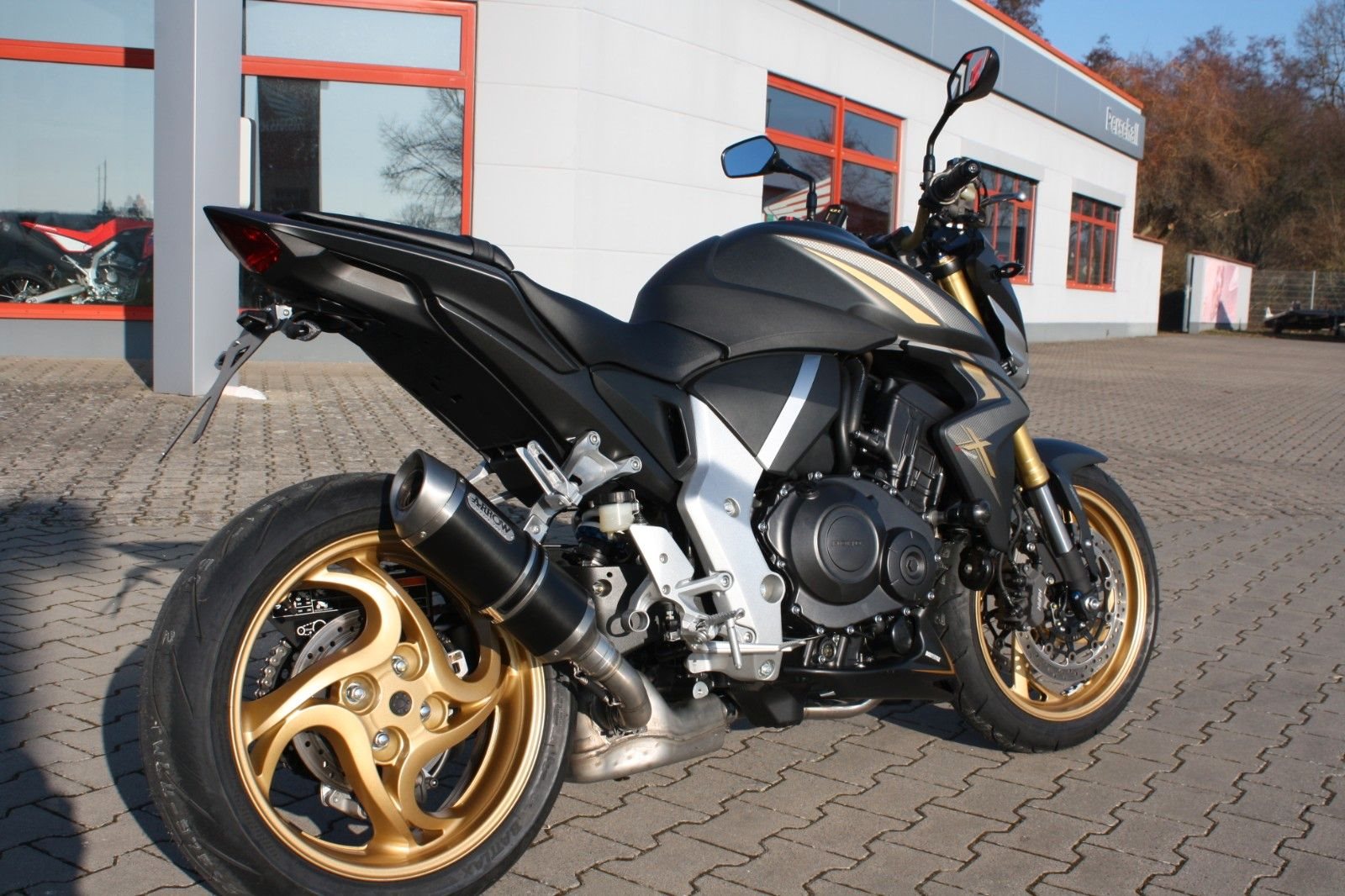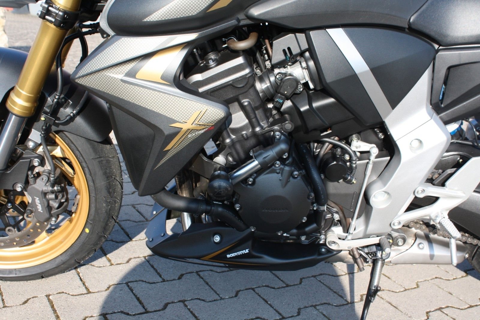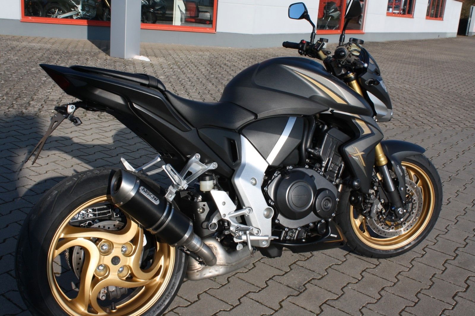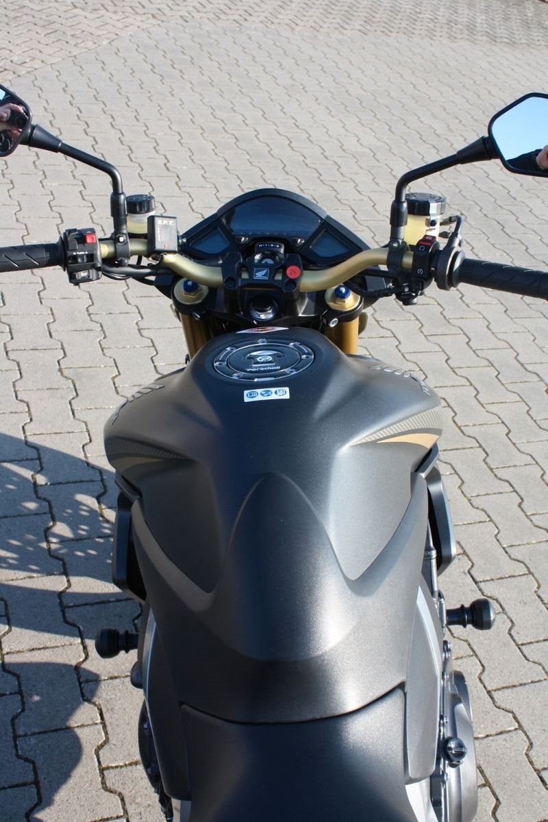 Das Bike ist sehr umfangreich ausgestattet: Ganganzeige, Sturzpads, Bugspoiler, kurzer Kennzeichenträger, vier LED-Mini-Blinker sowie ein zugelassener Sportauspuff von Arrow. Beide Reifen sind neu. Mit ordentlich Drehmoment bietet die CB 1000R ein sportliches Fahrerlebnis und puren Fahrspaß.