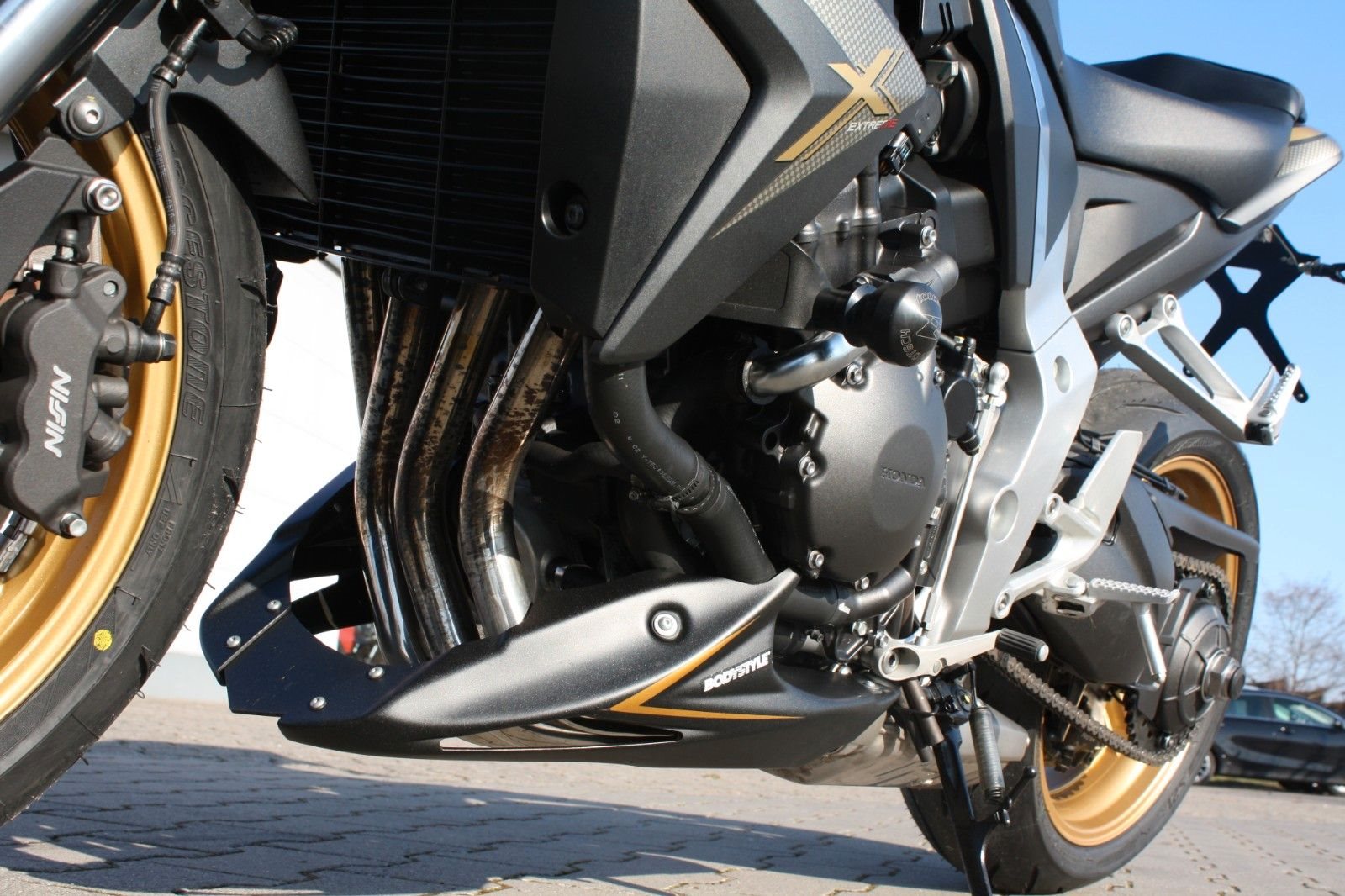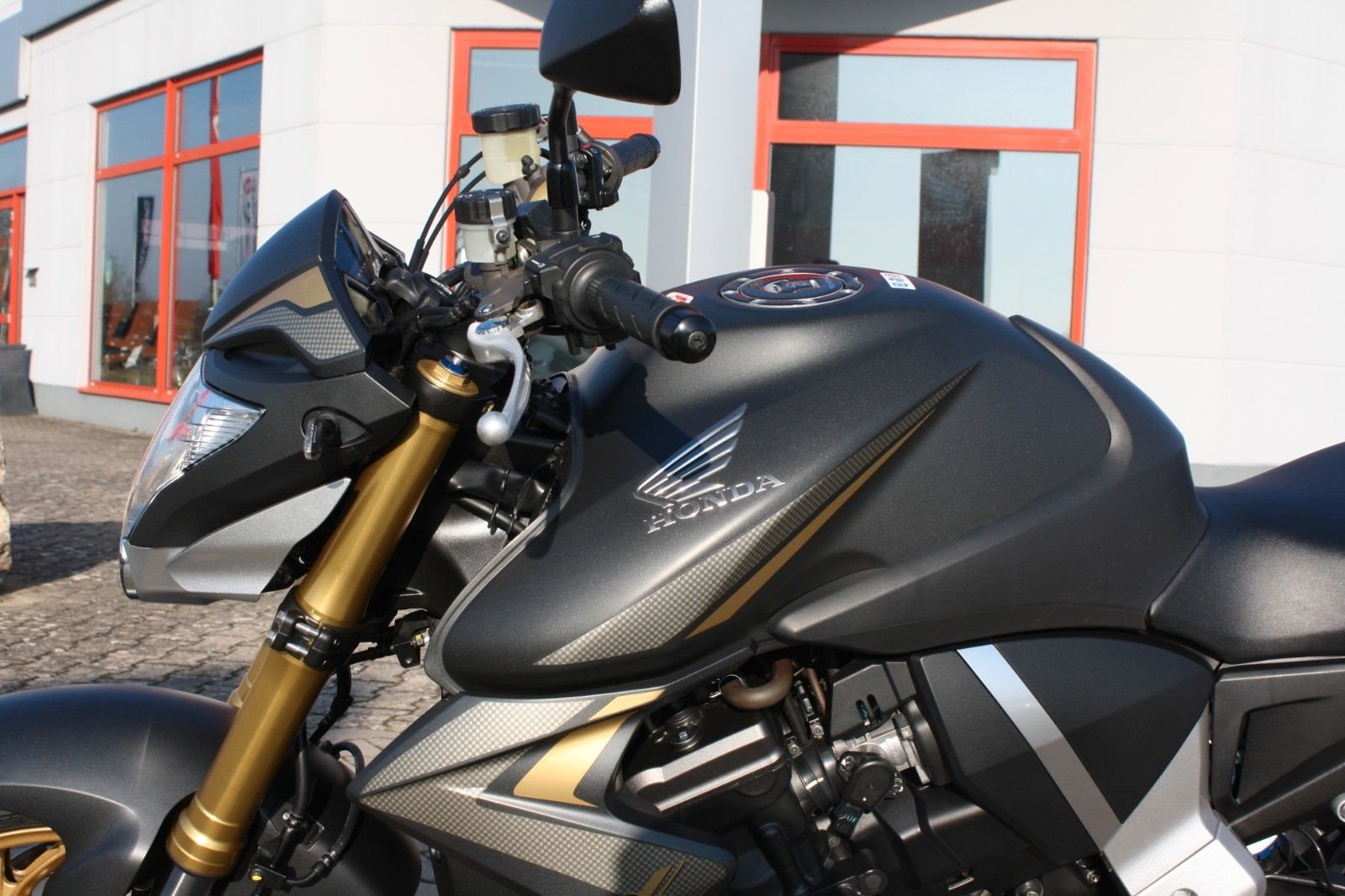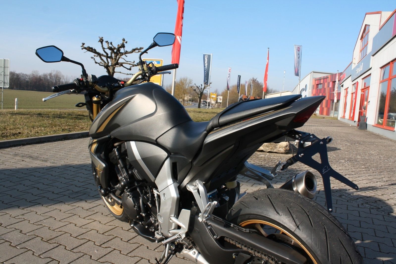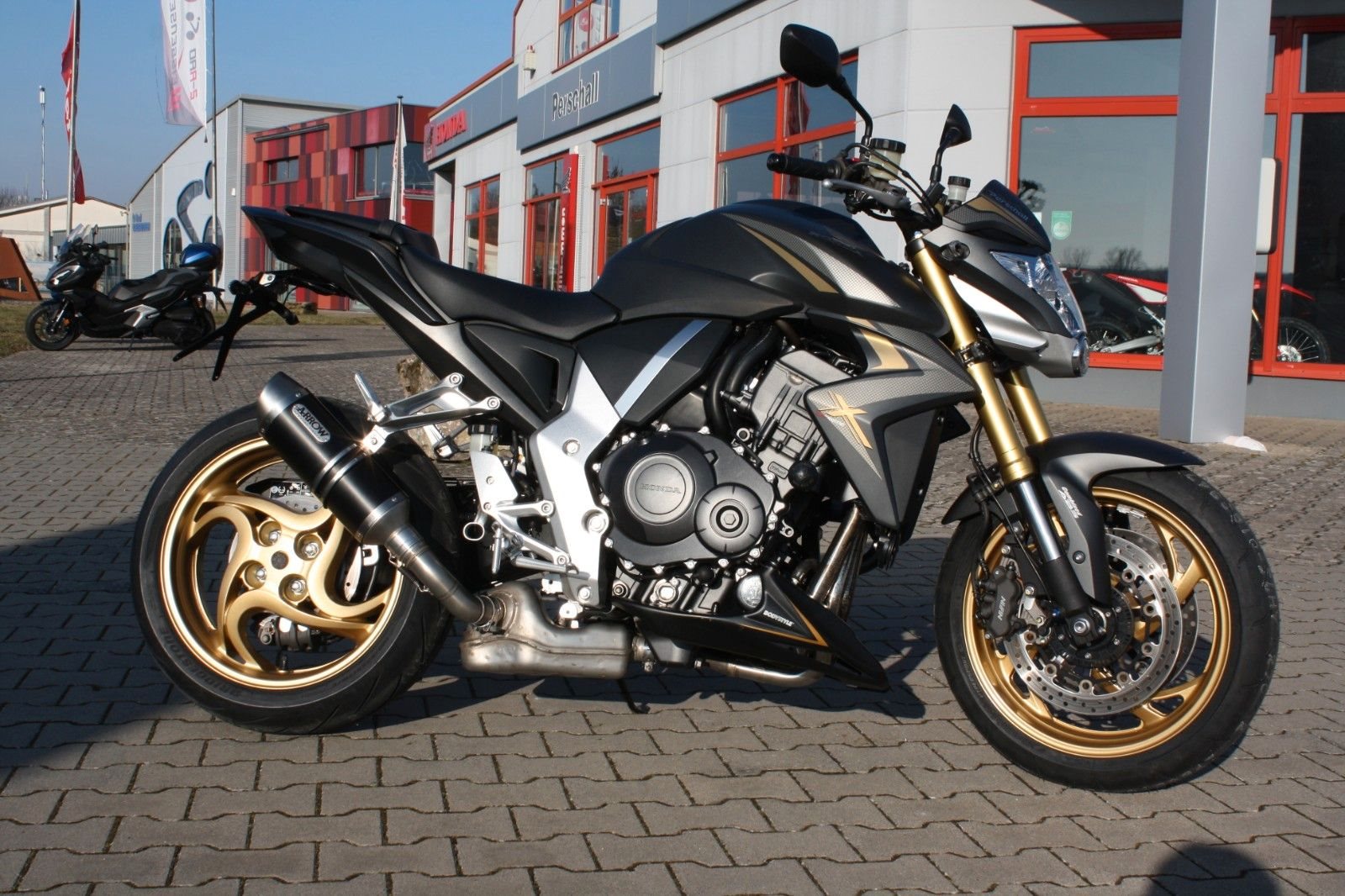 Das Bike ist sehr umfangreich ausgestattet: Ganganzeige, Sturzpads, Bugspoiler, kurzer Kennzeichenträger, vier LED-Mini-Blinker sowie ein zugelassener Sportauspuff von Arrow. Beide Reifen sind neu. Mit ordentlich Drehmoment bietet die CB 1000R ein sportliches Fahrerlebnis und puren Fahrspaß.
