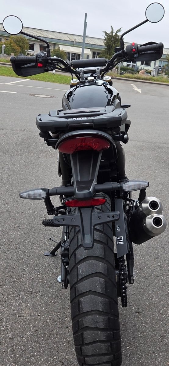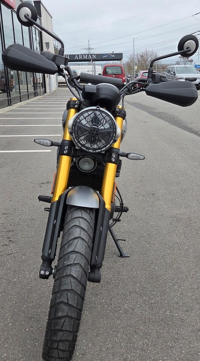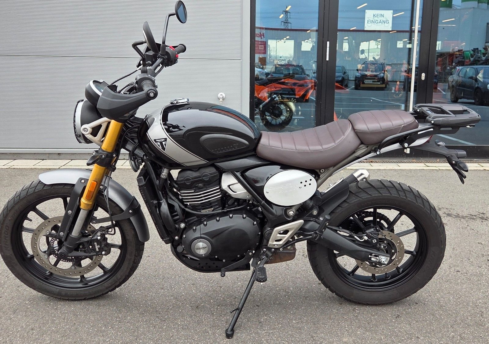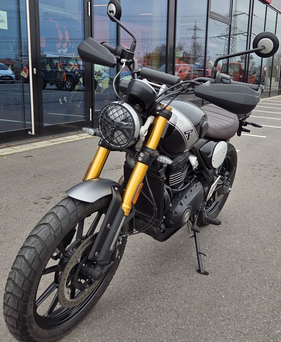 Die Scrambler 400 X ist ein erfrischender Neuzugang in der Scrambler-Familie von Triumph und eröffnet einer ganz neuen Generation das Fahrerlebnis der modernen Klassiker von Triumph.Mit ihrer zeitlosen Scrambler-Silhouette und der unverwechselbaren, gerippten Sitzbank bietet die Scrambler 400 X den unverkennbaren Stil einer Triumph, kombiniert mit hochwertiger Verarbeitung und erstklassiger Ausstattung voller moderner Fahrtechnologie.Der in Hinckley konstruierte Einzylindermotor erzeugt den für Triumph typischen charaktervollen und reaktionsschnellen Antrieb mit klassenbester Leistung und Drehmoment.Die souveräne Sitzposition mit breitem Lenker sorgt in Verbindung mit dem Scrambler-spezifischen Fahrwerk für Komfort auf der Straße und im Gelände.Die hochwertige Aufhängung mit 150 mm Federweg und der Doppelkolben-Bremssattel gewährleisten ein präzises, agiles und intuitives Handling und helfen sowohl neuen als auch erfahrenen Fahrern, das volle Potenzial der Scrambler 400 X voll auszuschöpfen.