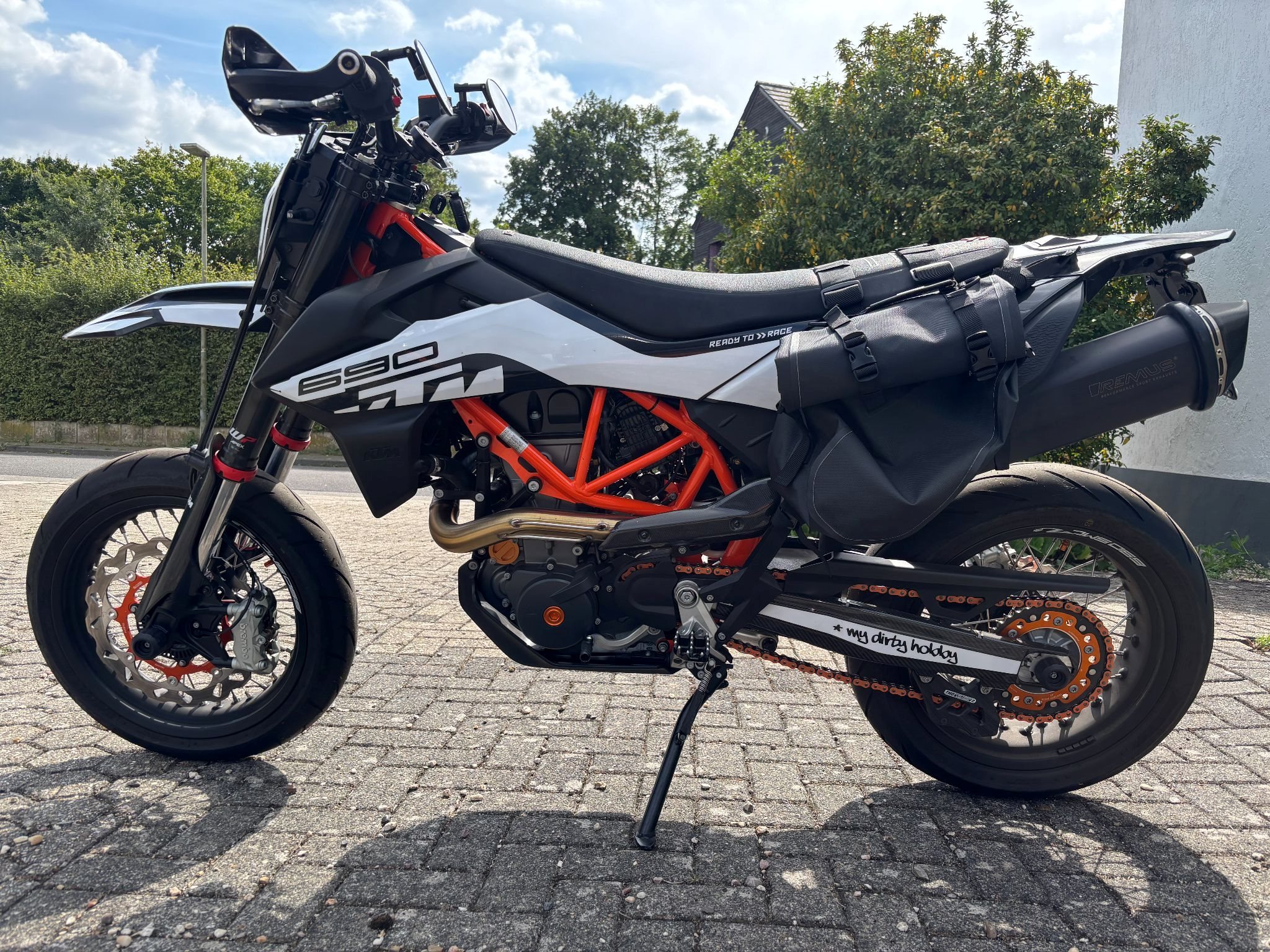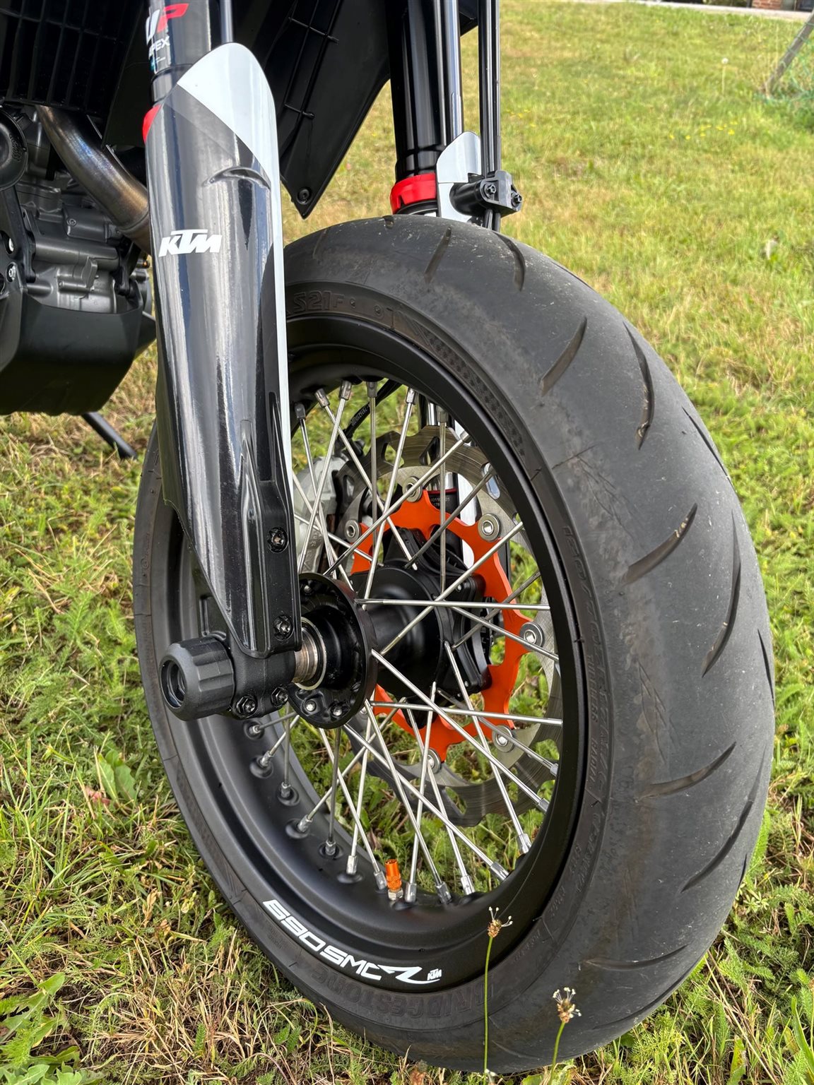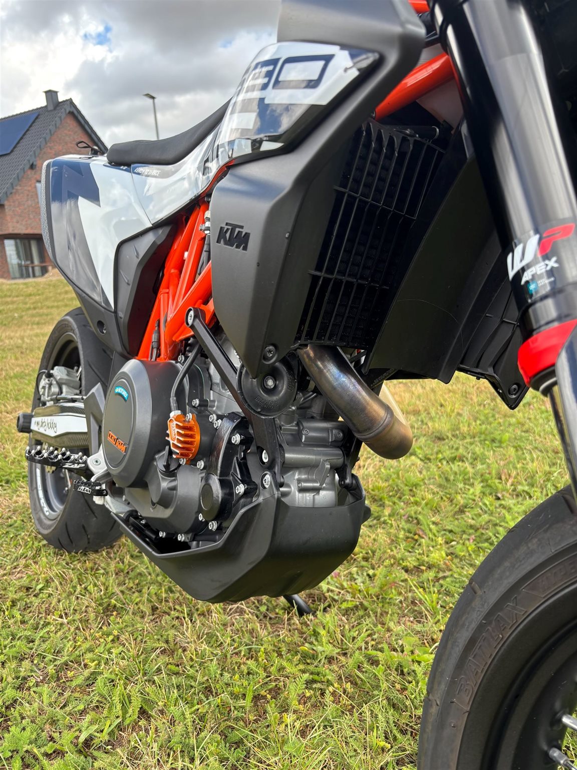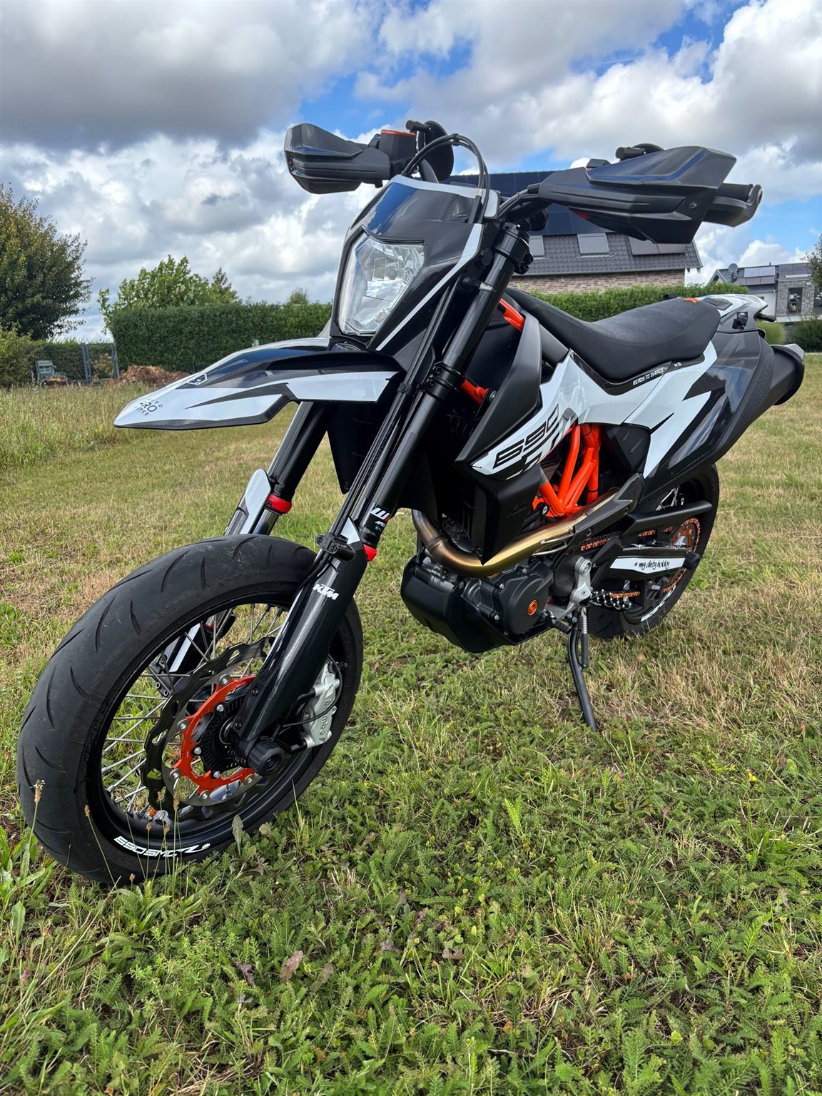 Die Supermoto ist in hervorragendem, beinah neuwertigem Zustand und hat alle Inspektionen gesehen, zuletzt noch die "Große" im August. TÜV und hinterer Reifen sind neu, ebenso die zusätzliche Anzeige von Cumpan, die die reale Drehzahl wiedergibt, sowie z. B. Außen- und Öltemperatur. Das sind in Summe somit alleine schon rund 1.500,- €uro, die in den vergangenen 6 Monaten in das Motorrad geflossen sind und nicht mehr investiert werden müssen. Ich bin der zweite Besitzer und habe sie vom Händler erst Anfang letzten Jahres bezogen. Folgendes Zubehör ist am Motorrad verbaut: