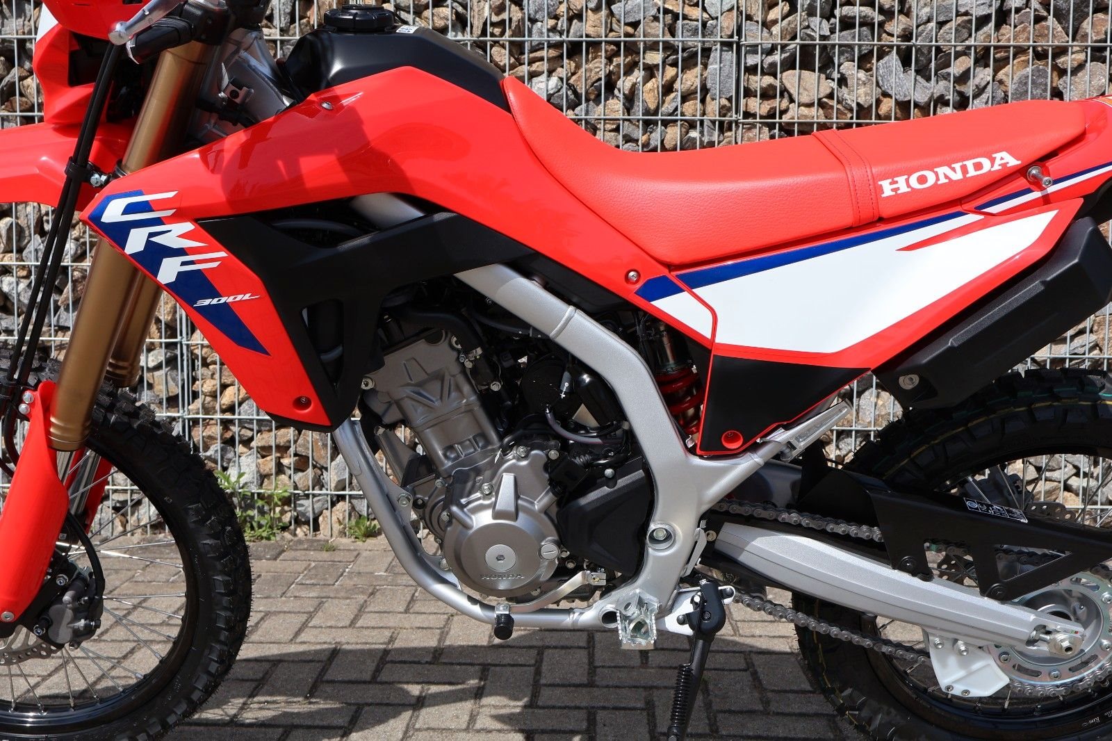 Die CRF300L ist mit einer robusten, leichten Verkleidung sowie jetzt auch mit einem neuen LED-Scheinwerfer und LED-Blinkern ausgestattet, die Tag und Nacht hohe Präsenz auf der Straße gewährleisten, die Sicht des Fahrers verbessern und das Motorrad für andere Verkehrsteilnehmer leichter zu sehen machen. Die schlanken Proportionen von Tank und Sitzbank sorgen für Komfort und problemlose Erreichbarkeit des Bodens, sodass der Fahrer die Maschine sicher im Griff hat. Als Sonderausstattung ist ein praktisches USB-Ladegerät (Typ C) erhältlich, das neben dem Instrumententräger angebracht werden kann. Die Sitzhöhe von 880 mm und die aufrechte Fahrposition gewährleisten natürliche Kontrolle und Komfort in jedem Gelände. Ob du im Stadtverkehr unterwegs bist, neue Trails eroberst oder beides an einem Tag - die CRF300L ist immer bereit.