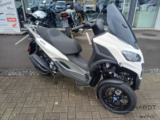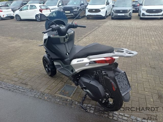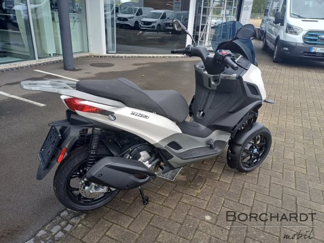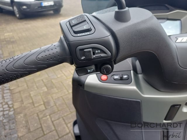 Der Piaggio MP 310, der mit einem PKW-Führerschein Klasse B gefahren werden kann, überzeugt durch seinen kühnen, dynamischen Stil, der von den neuesten Trends im Automobildesign inspiriert ist. Metallisch graue, satinierte Details betonen die fließenden Linien, während die Sitzbank mit grauen Texturen und kontrastierenden grauen Nähten versehen ist. Das getönte Windschild ist mit seitlichen Deflektoren für zusätzlichen Schutz und Komfort ausgestattet, und das schlanke Heckteil rundet das moderne, elegante Design ab.
