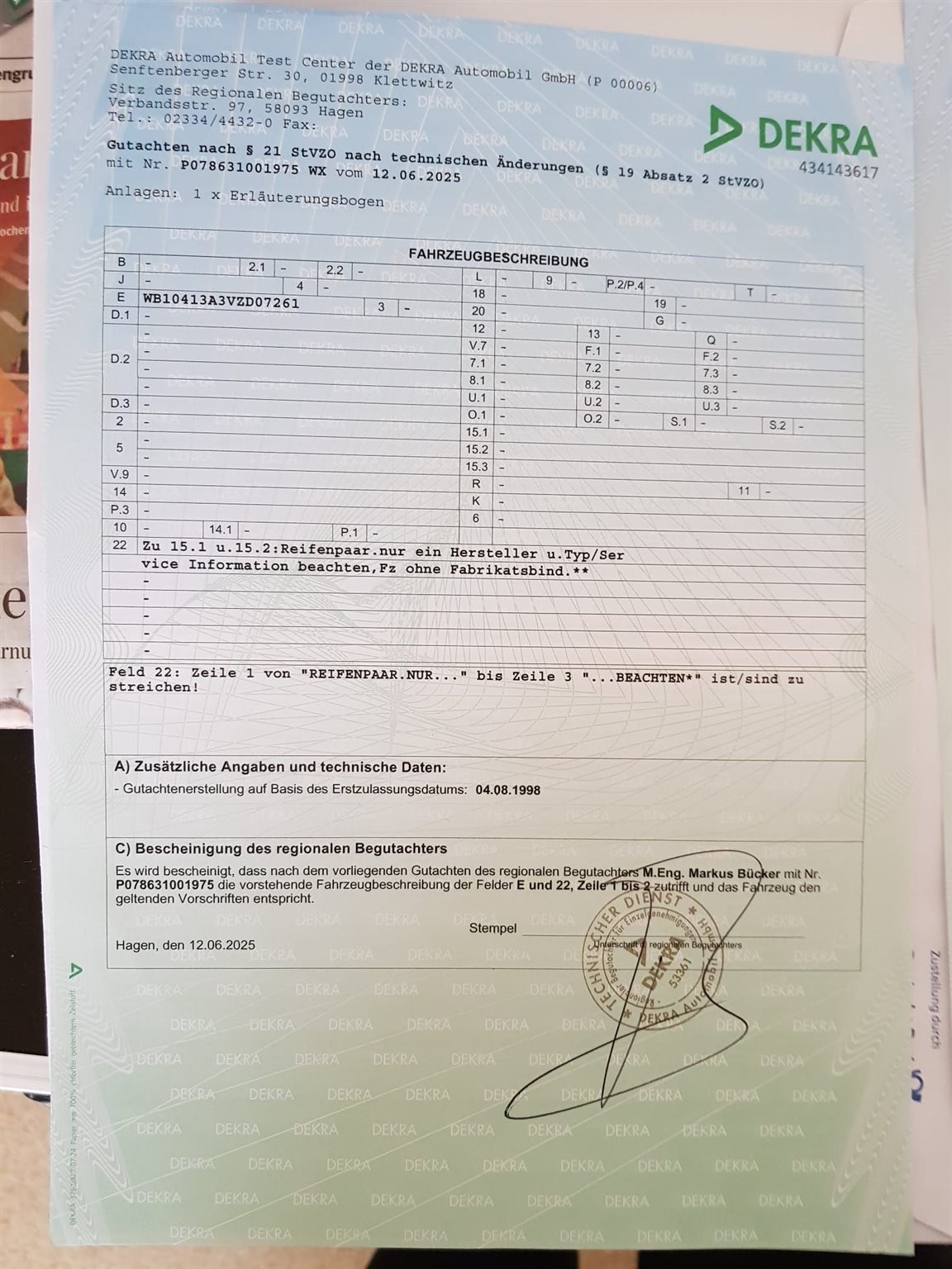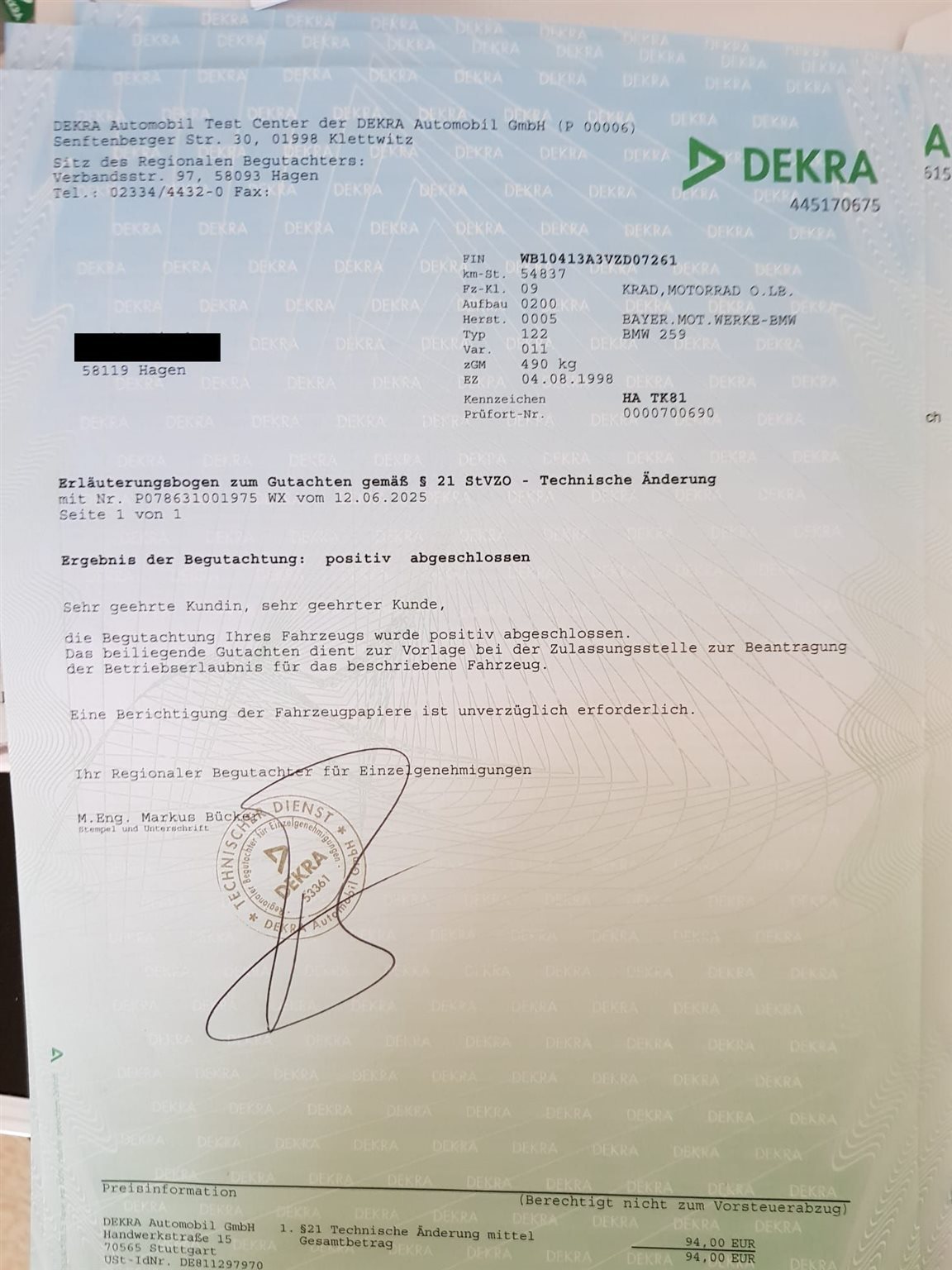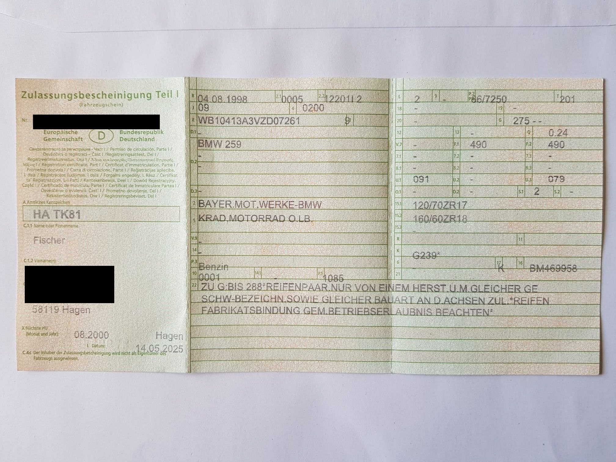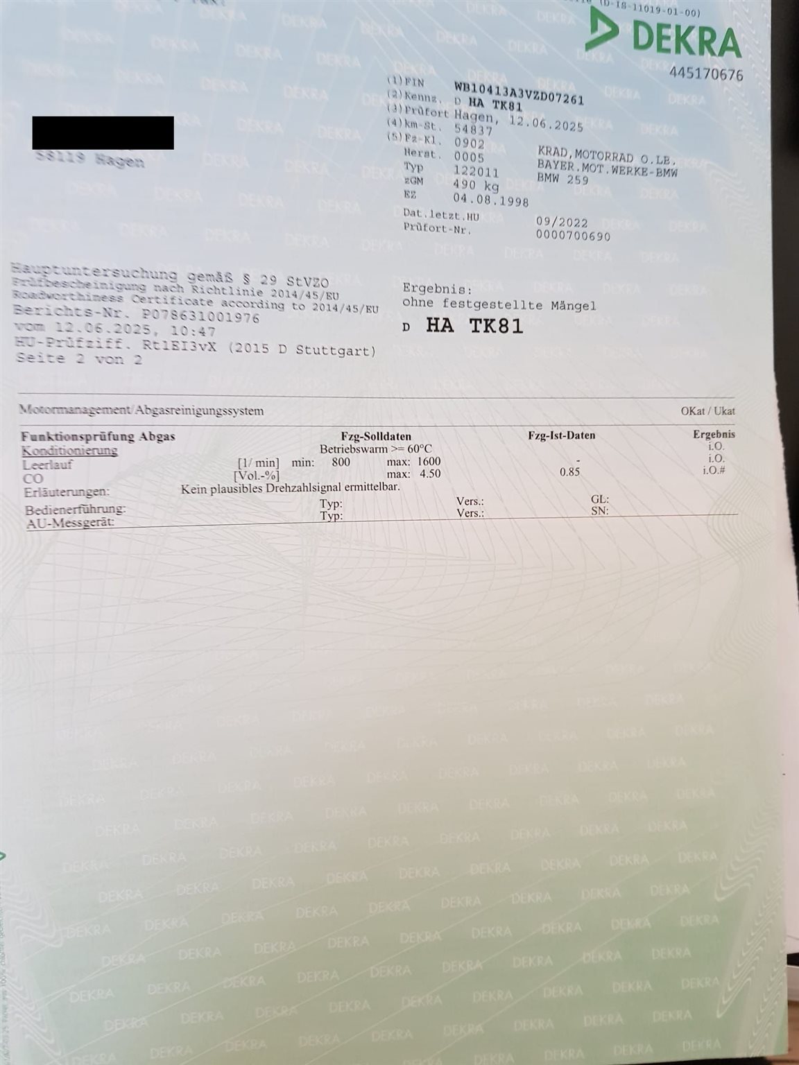 Das Motorrad ist nicht angemeldet, war am 12.6.2025 zur HU, ohne Mängel, Reifengutachten wurde erstellt, nächste HU 06.2027