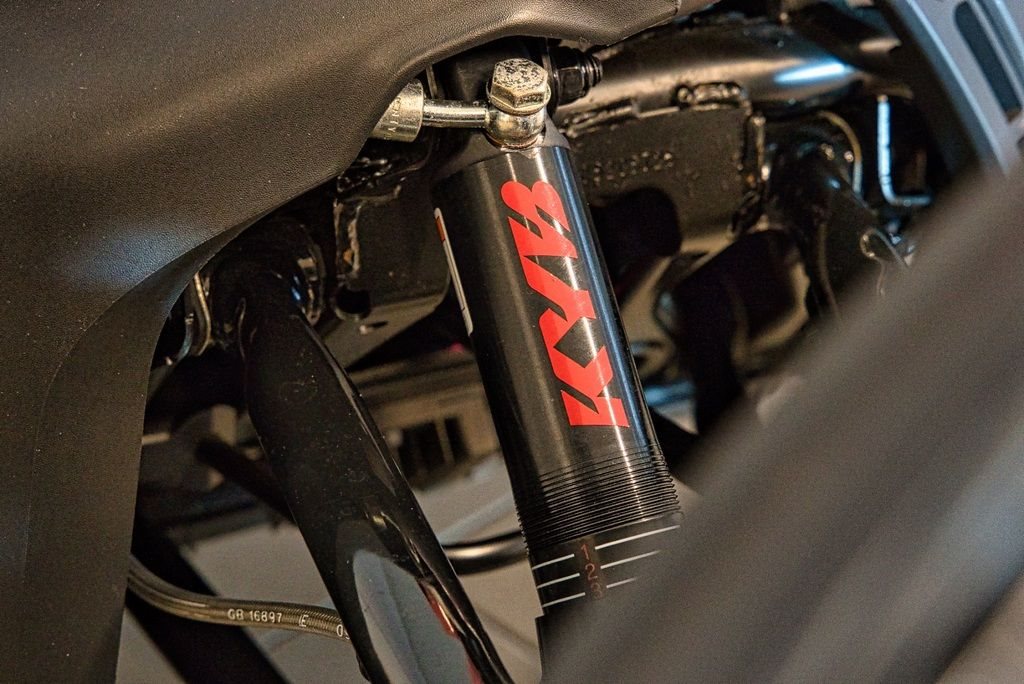 KYB+ Gasdruckstoßdämpfer mit Ausgleichsspeicher und 4-stufig einstellbarer Druckstufendämpfung und Vorspannungseinstellung / 169 mm Federweg,