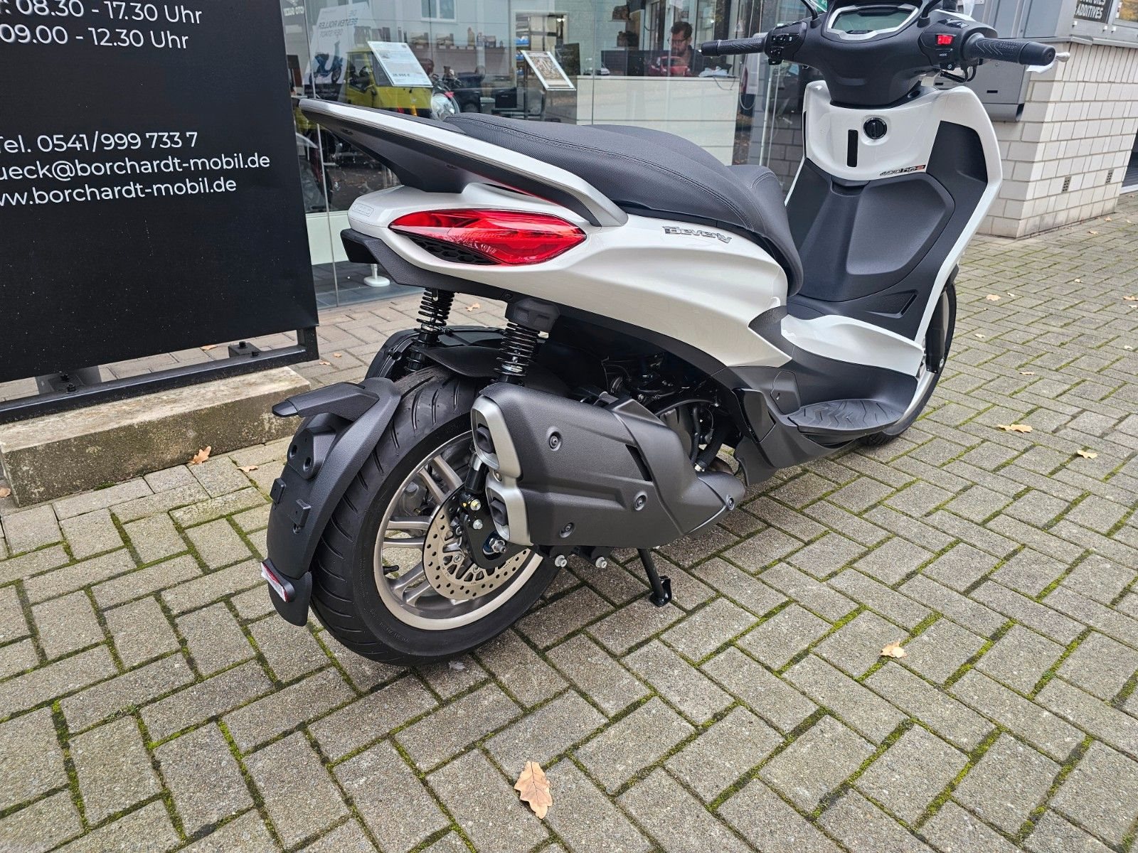• LED-Scheinwerfer Der Piaggio Beverly ist mit LED-Lichtanlage ausgestattet, die Sichtbarkeit und Sicherheit verbessert. Der LED-Frontscheinwerfer erzeugt eine unverwechselbare Lichtsignatur, während die Blinker, Tagfahrlichter und das Rücklicht ebenfalls mit moderner LED-Technologie arbeiten und so das markante Design des Fahrzeugs abrunden.