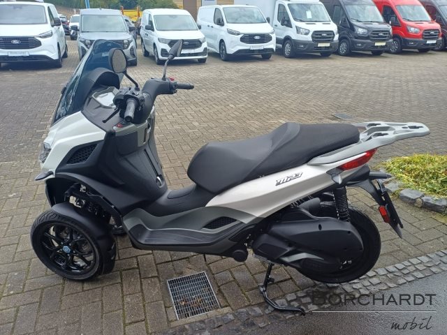 Der Piaggio MP 310, der mit einem PKW-Führerschein Klasse B gefahren werden kann, überzeugt durch seinen kühnen, dynamischen Stil, der von den neuesten Trends im Automobildesign inspiriert ist. Metallisch graue, satinierte Details betonen die fließenden Linien, während die Sitzbank mit grauen Texturen und kontrastierenden grauen Nähten versehen ist. Das getönte Windschild ist mit seitlichen Deflektoren für zusätzlichen Schutz und Komfort ausgestattet, und das schlanke Heckteil rundet das moderne, elegante Design ab.