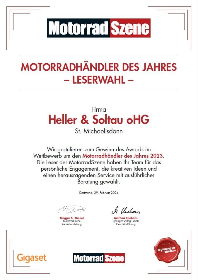 Wir, die Firma Heller & Soltau sind seit 1983 Jahren im Motorradgeschäft tätig, Kawasaki Vertragshändler seit 1987, Triumph von 1991- 2013, jetzt noch Service, Kymco seit 2002 und Husqvarna Motorcycles Vertragshändler seit 2016.