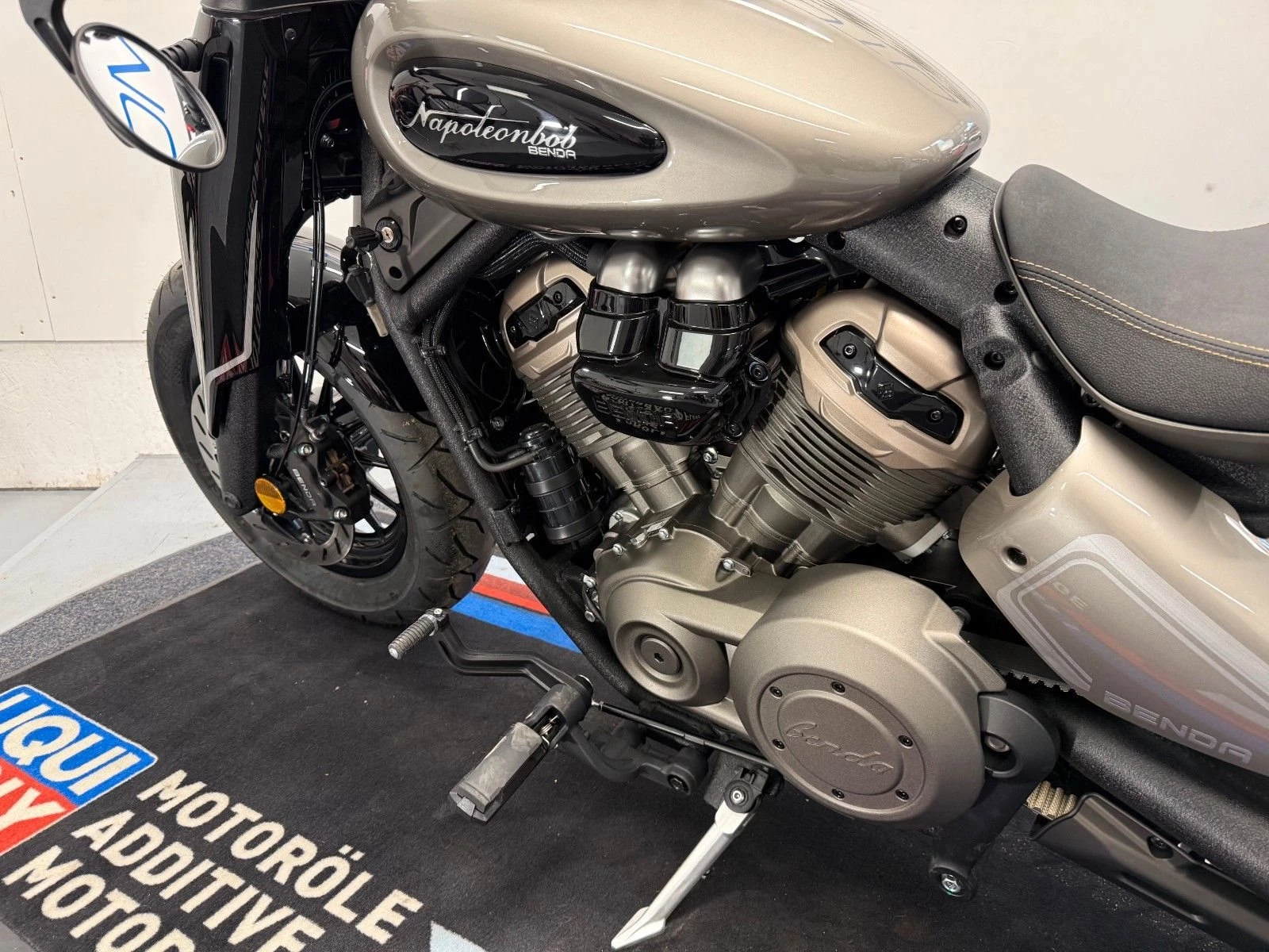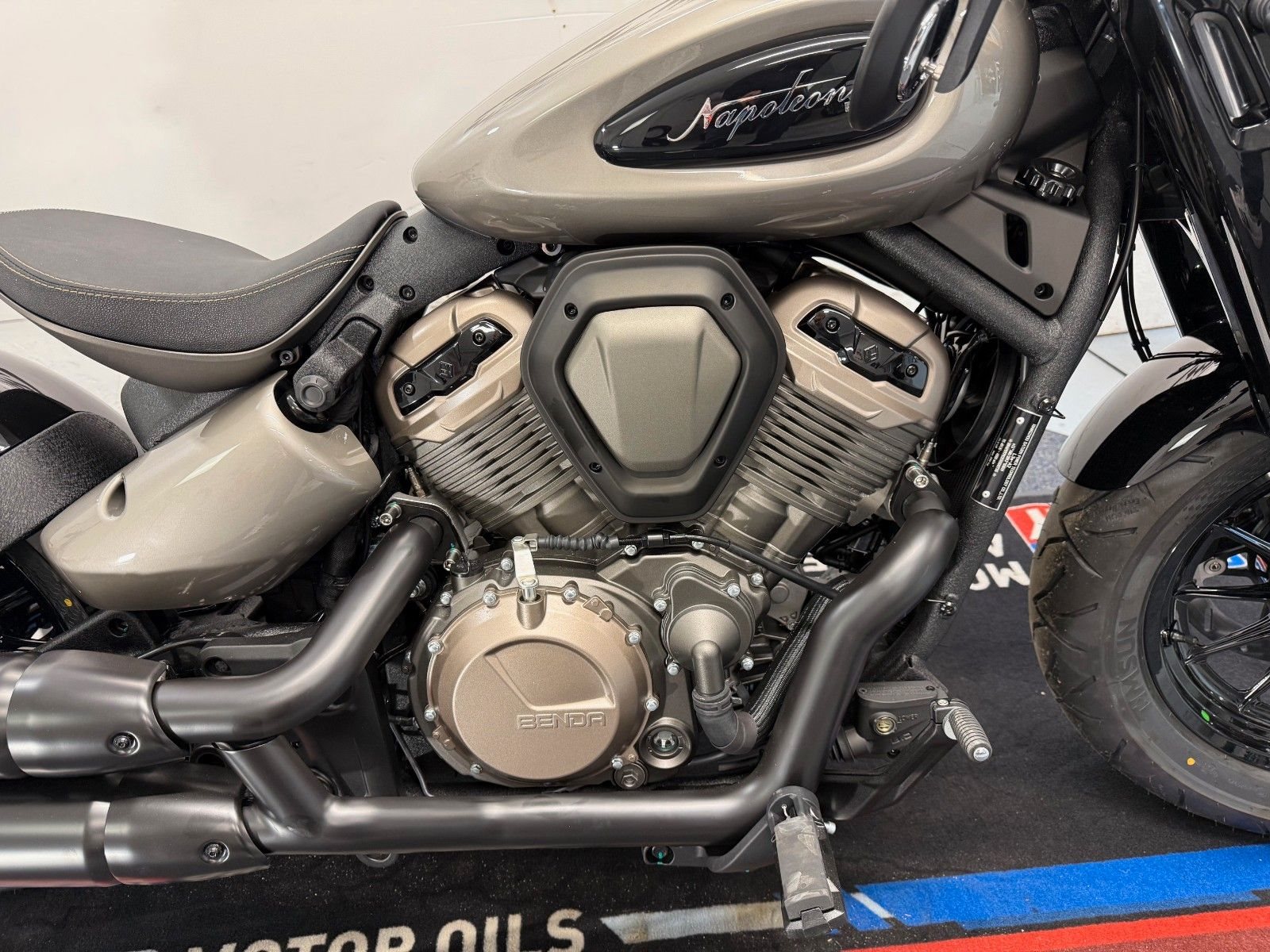 Mit viel Schwarz, Matt-Gold setzt Benda die Napoleon 450 in Szene. Im Zentrum steht ebenfalls ein V2, hier aber mit 448 Kubik und 48 PS (36 kW) bei 8.800 Touren sowie 45 Nm bei 7.000/min. Der flüssigkeitsgekühlte Twin ist bei einer Bohrung von 67 Millimetern bei 63,6 Millimetern Hub vergleichsweise langhubig ausgelegt, was das relativ üppige Drehmoment erklärt. Die Verdichtung ist mit 11,5:1 leicht erhöht eingestellt, das Gewicht ist mit 190 Kilo. Ebenso üppig gebaut: Die 2-in-2-Auspuffanlage in mattem Schwarz gerollt. Napoleon Bob 500 ist ein echter Einsitzer-Bobber.
