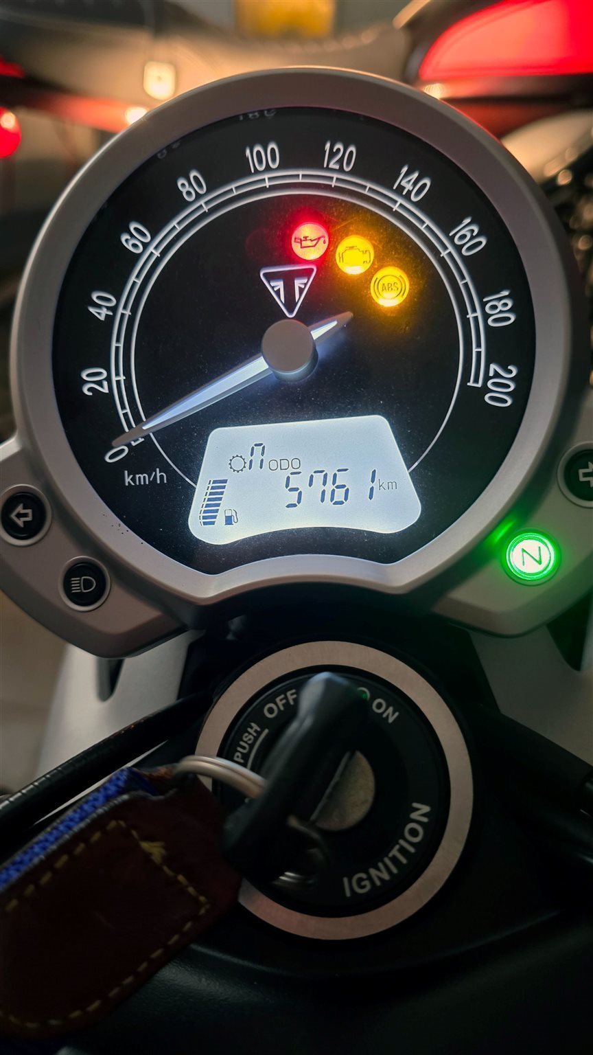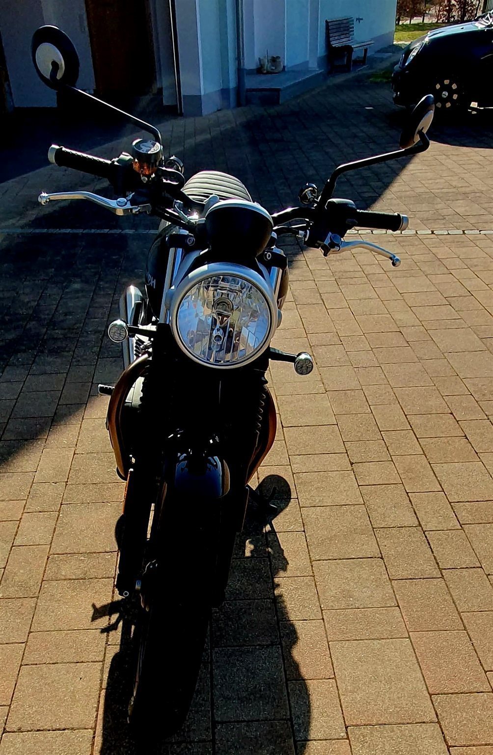 Selbstverständlich wurde sie auch immer "Winterfest" gemacht. TÜV bis März 2028. Eine umfassende Inspektion wurde 2025 gemacht. Es sind ein paar Verschönerungen (alles Original Triumph) angebracht worden. Links am Lenker ist eine Uhr und rechts ein Thermometer, beide Batterie betrieben. Zudem sind am Motorgehäuse beidseitig silberne Deckel dran. Ebenfalls wurden kleinere LED Blinker angebracht. Alle Original Teile sind auch noch da und dabei. Außerdem ist auch ein Gepäckträger, der nur einmal benutzt wurde, dabei.