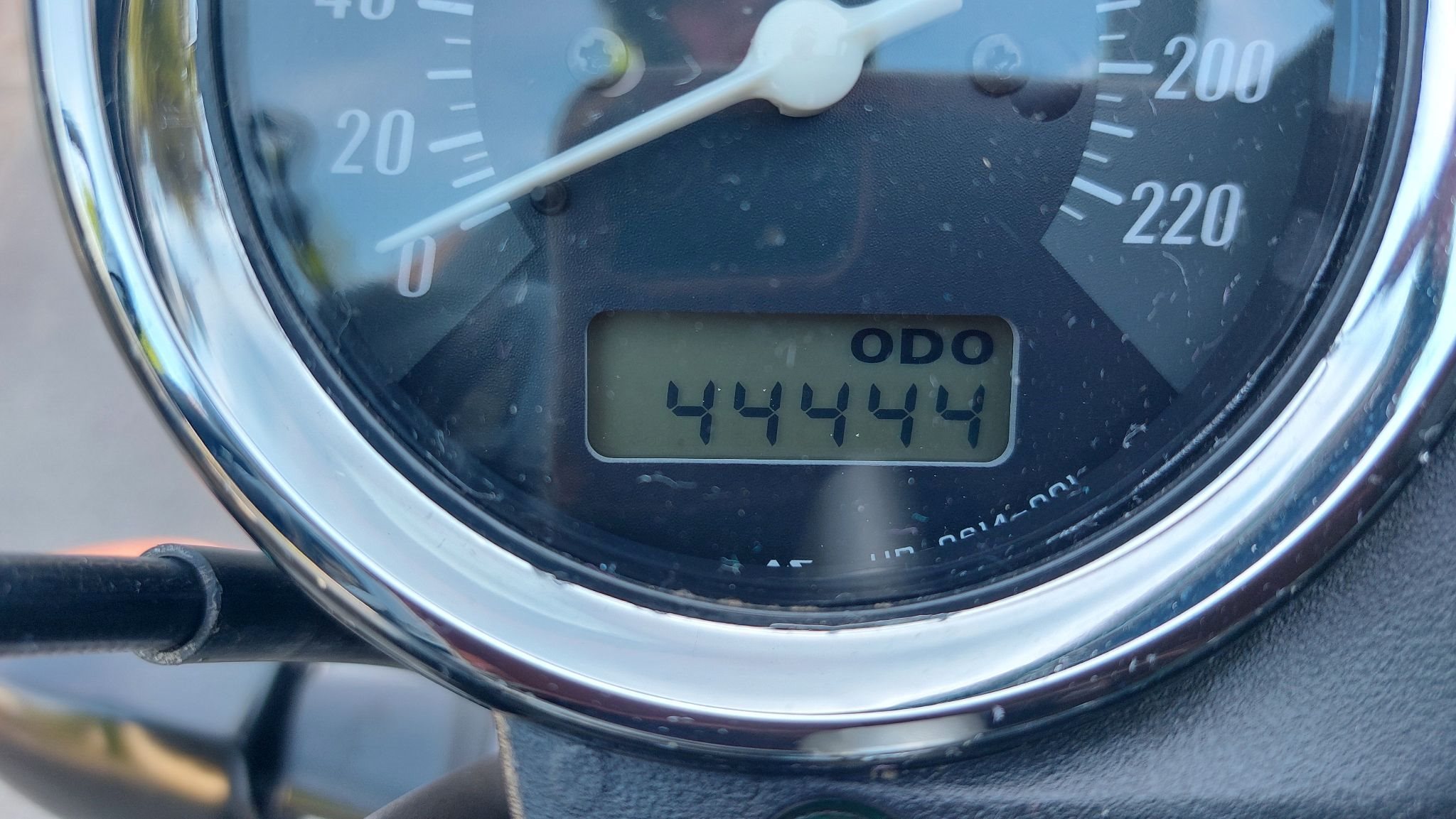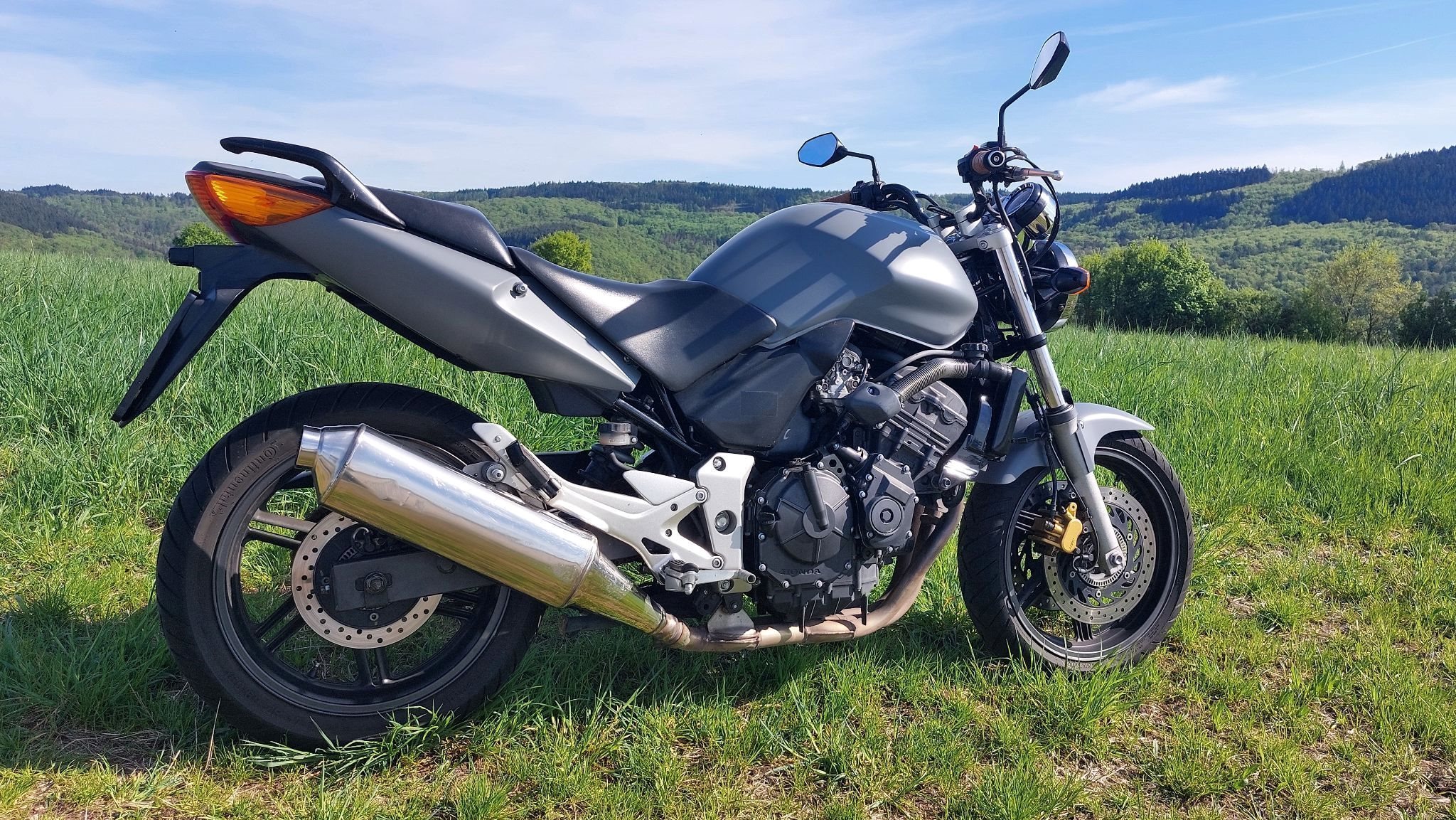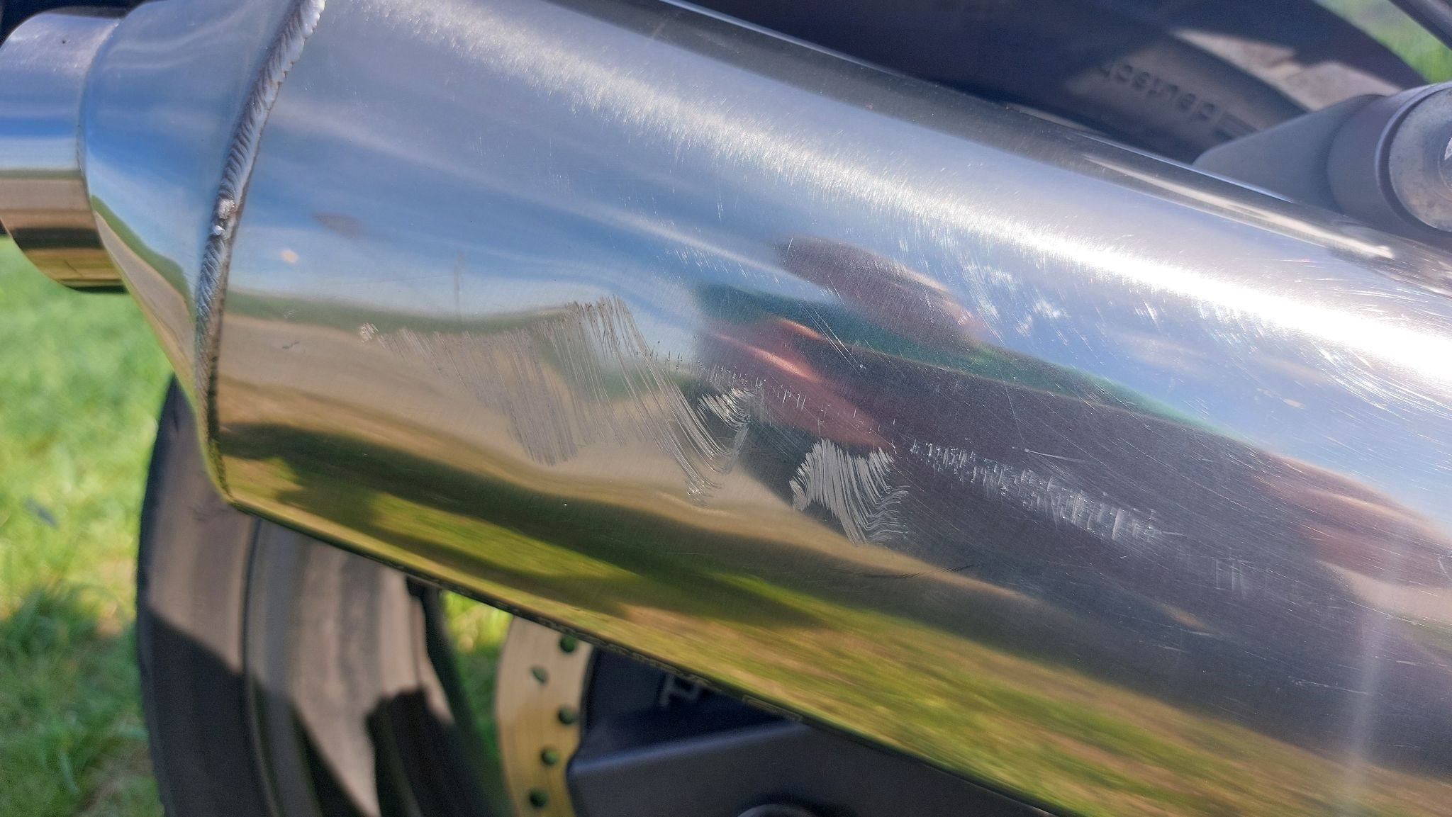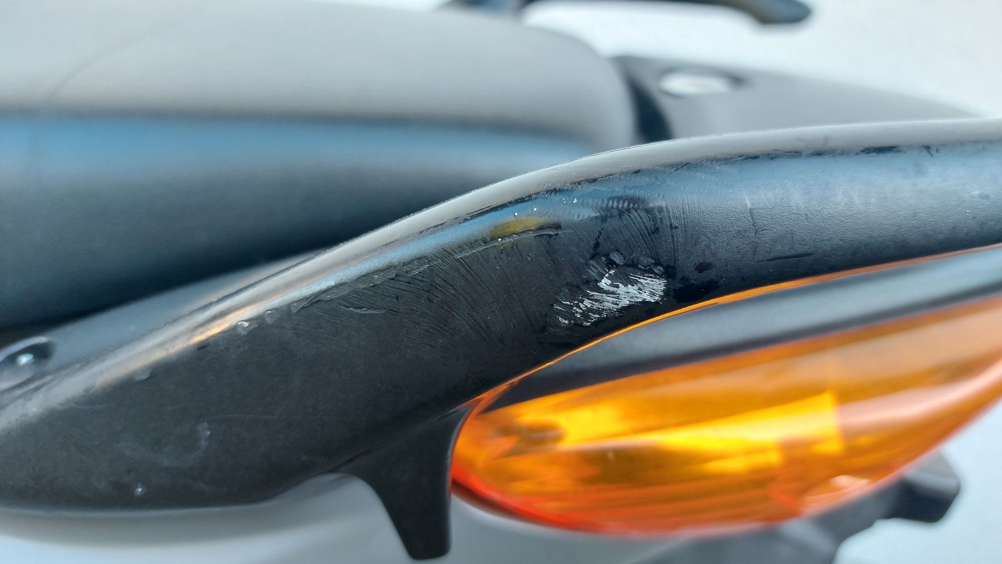 Es sind noch Schrammen auf dem Motordeckel rechts sowie am Lenkerende und am Sozius-Haltegriff rechts. Der Auspuff hat auch leichte Schrammen. Neu ist der Blinker vorne rechts und das Tachogehäuse, sowie die Batterie.