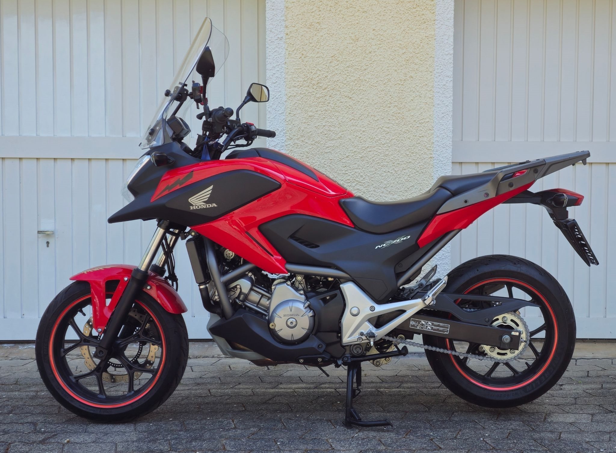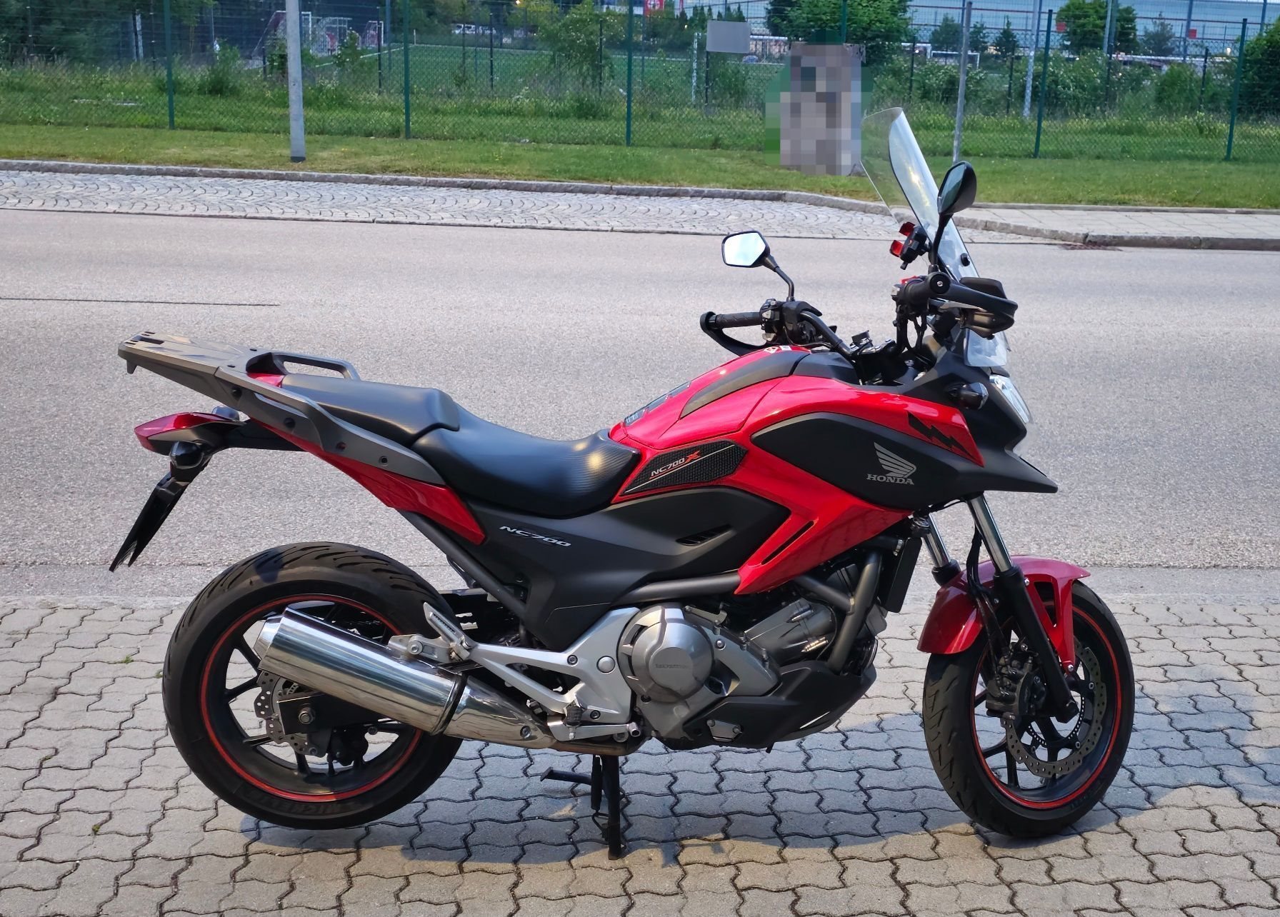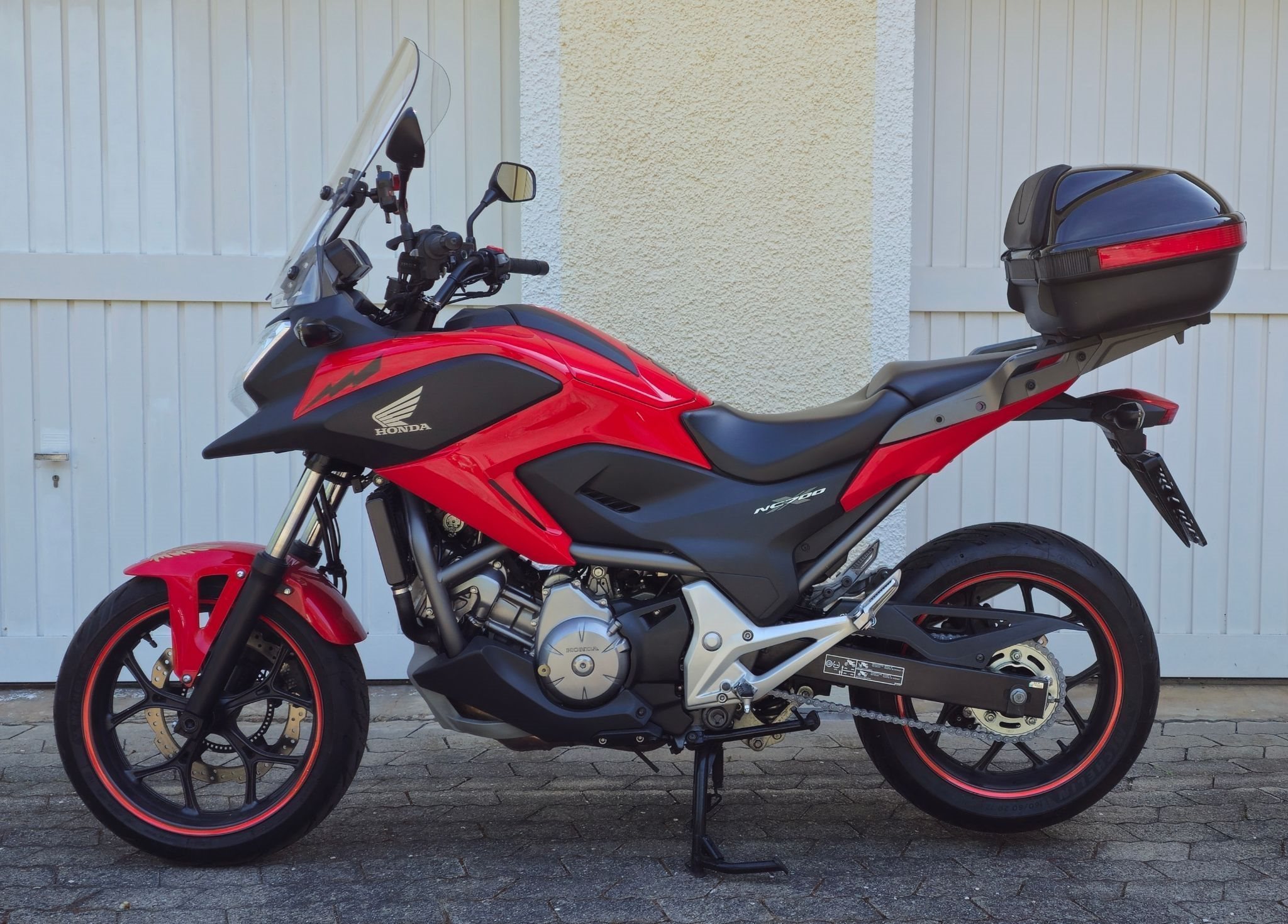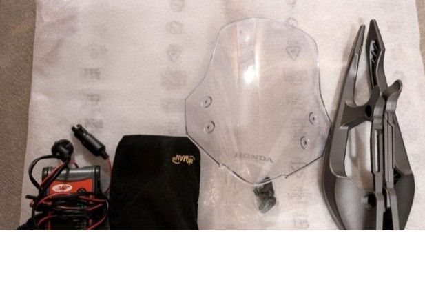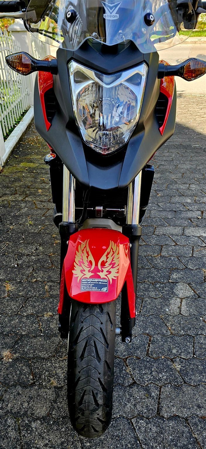 Als Zusatzausstattung ist das Motorrad mit folgendem ausgestattet: Tourenscheibe von V-Stream (zugelassen, Wert ca. 300 EUR), 12-V-Steckdose (von Honda eingebaut), Hauptständer (von Honda montiert), originales abnehmbares Topcase mit hoher Kapazität von Honda (hat ein paar Kratzer, ansonsten guter Zustand, mit 2 Schlüsseln), Handyhalterung, auch wurde nachträglich Handprotektoren eingebaut der man am lesten bild sehen kann.