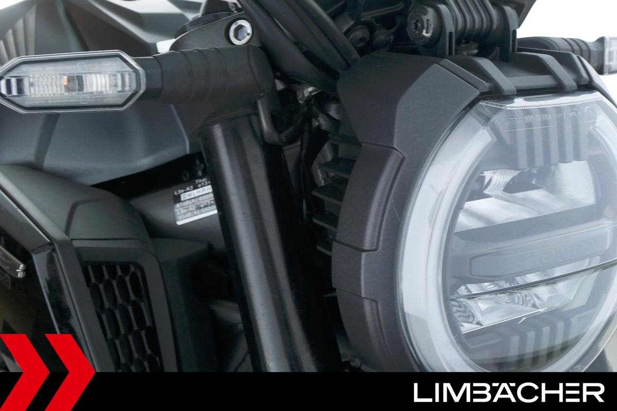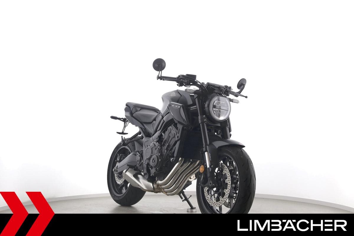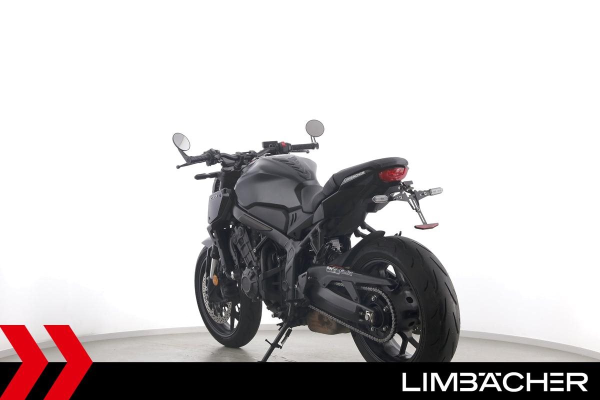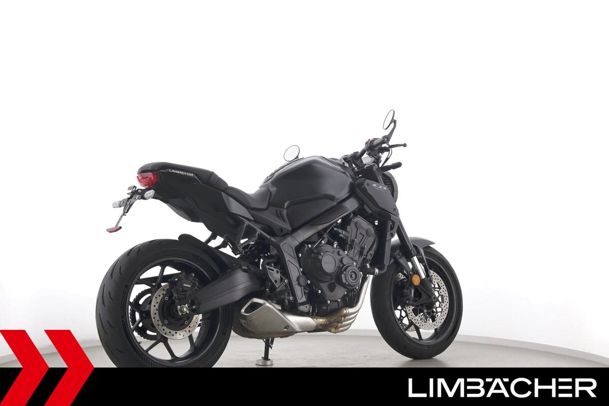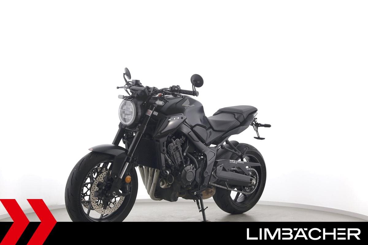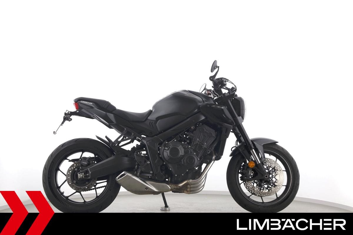 Eine scheckheftgepflegte Honda CB 650 R aus erster Hand in gepflegtem Zustand u.a. mit kurzem Kennzeichenhalter und LSL-Lenkerendenspiegeln.